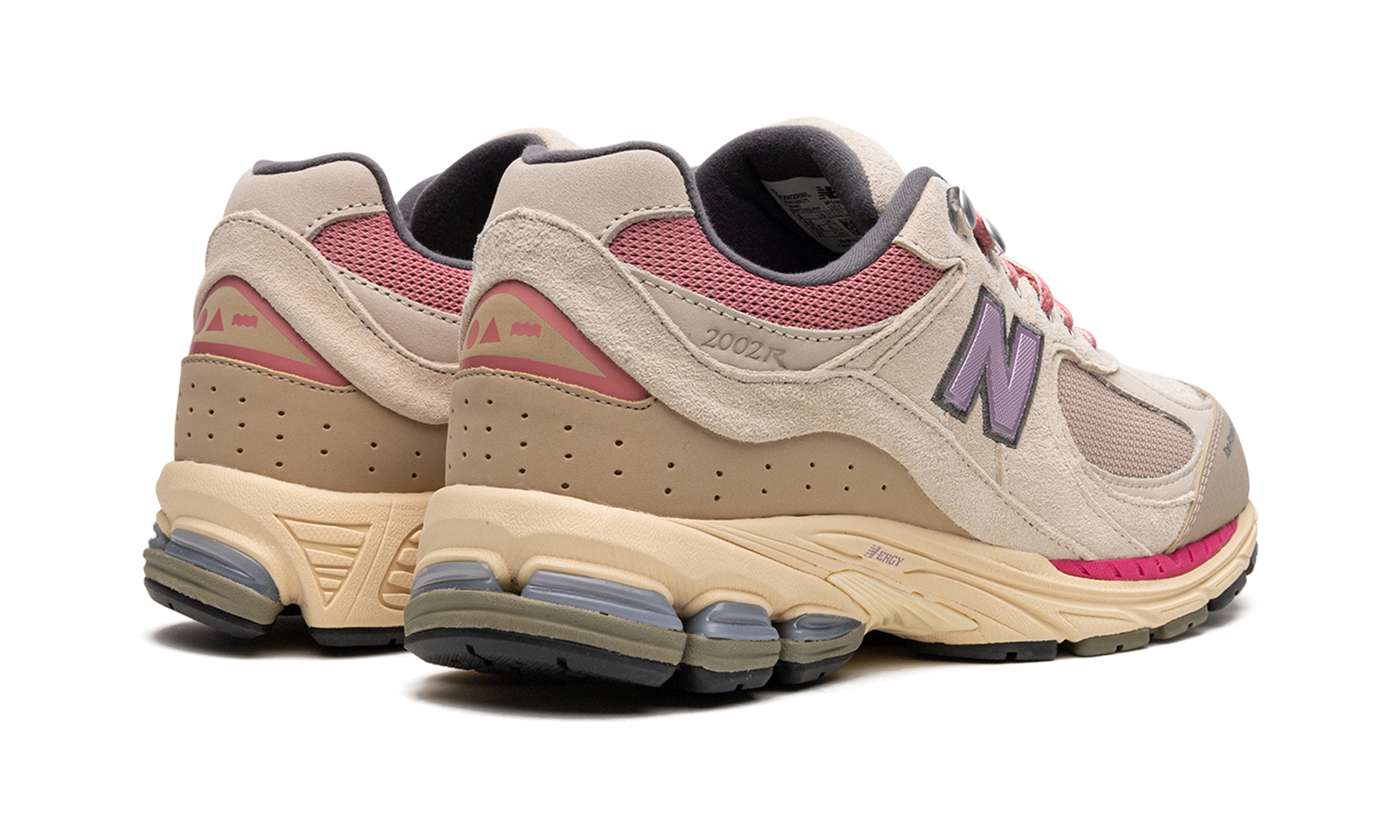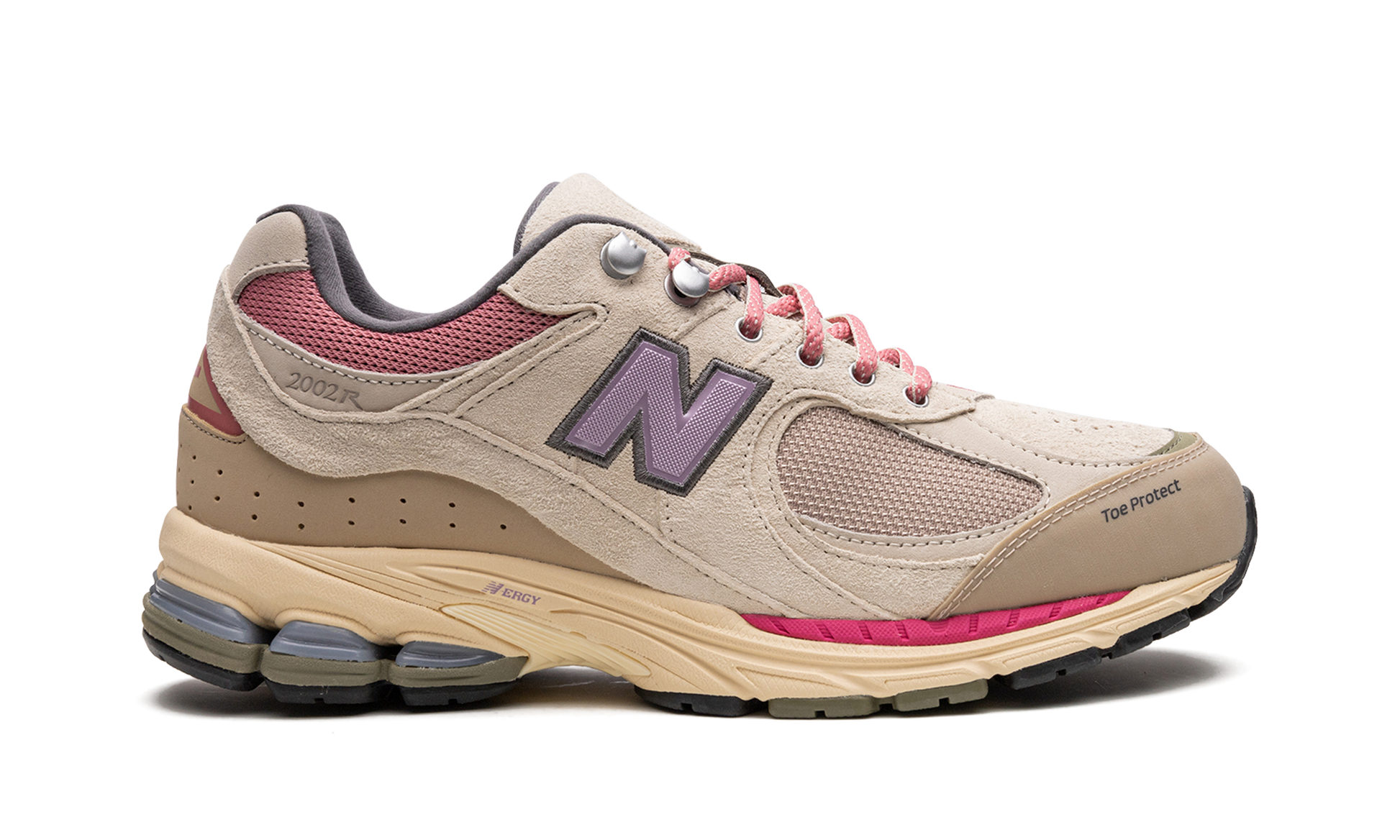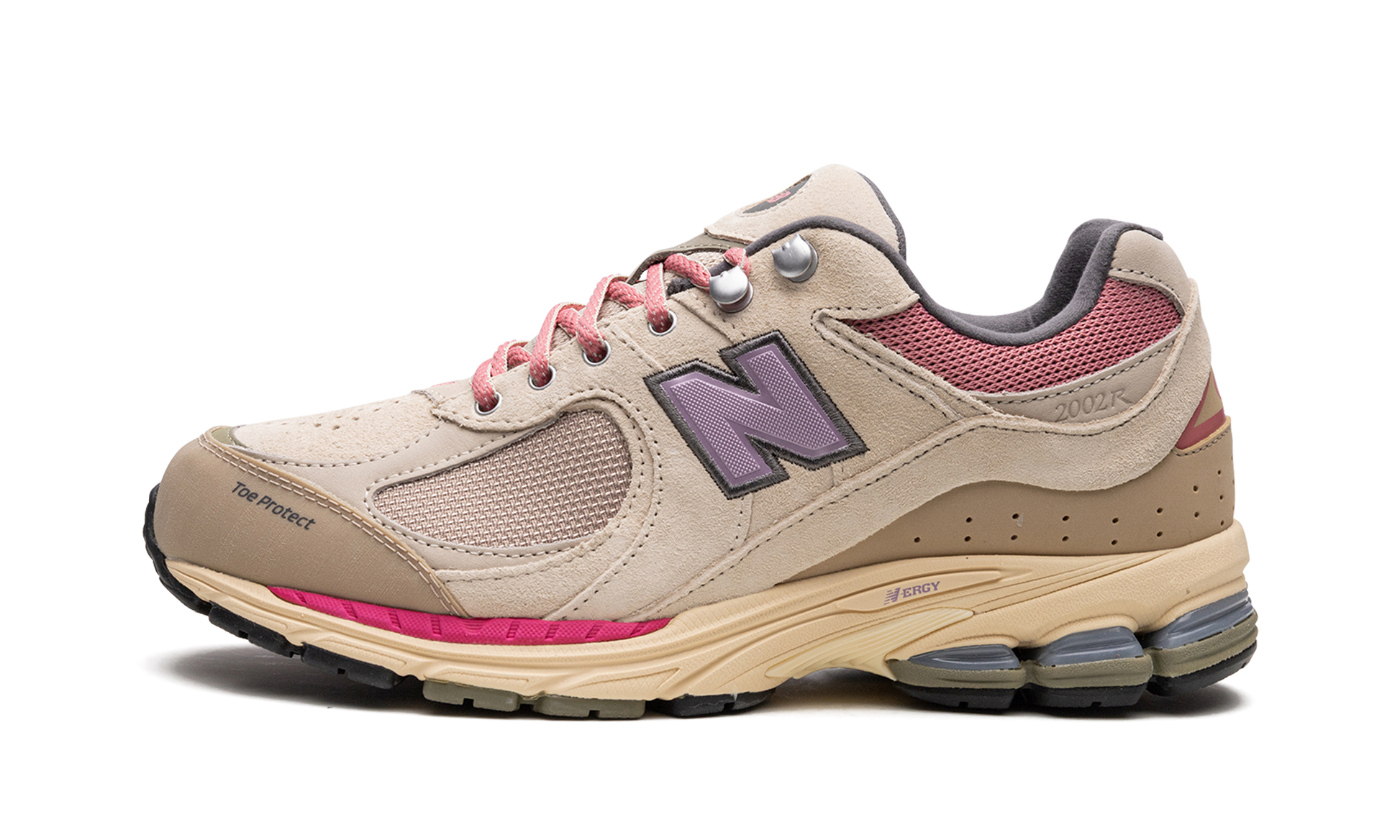 The New Balance 2002R “Hiking Pack - Beigeâ€?is a colorway of the retro performance running shoe from the outdoors-inspired collection. The “Beigeâ€?edition of the 2002R. as its name implies. features a tan mesh base and tonal suede overlays. Pink mesh appears on the collar. A purple textile “Nâ€?logo is found on the sides. Additional details include metal upper eyelet hooks. a reinforced toe. and an ABZORB cushioned midsole heel with “N-ERGYâ€?technology. Release date: June 18. 2022