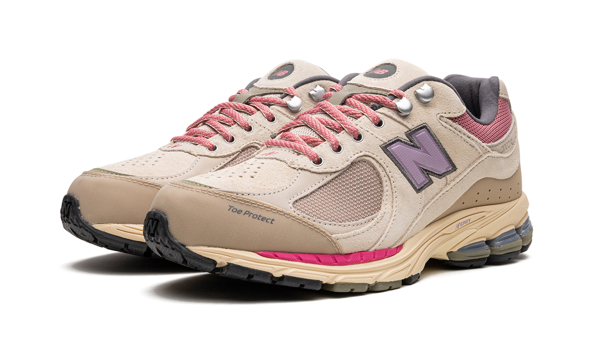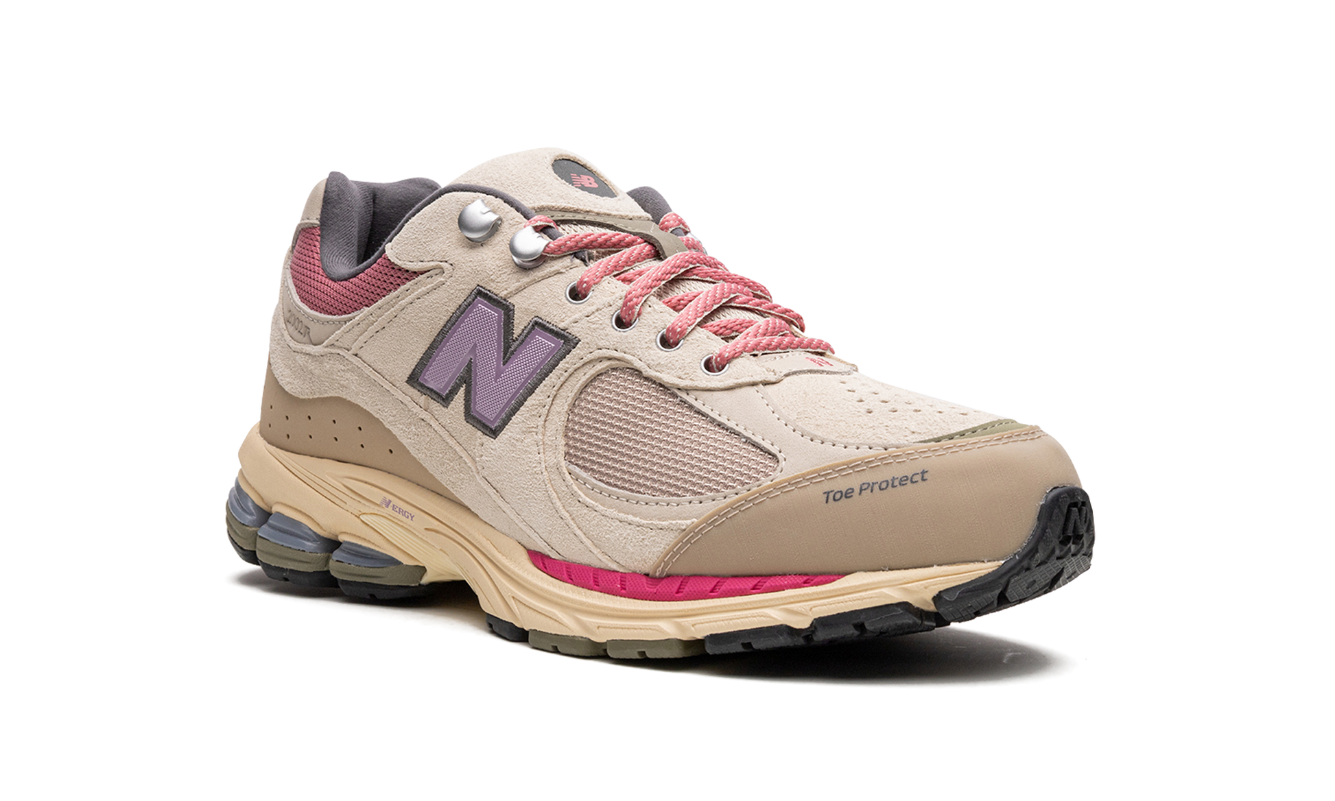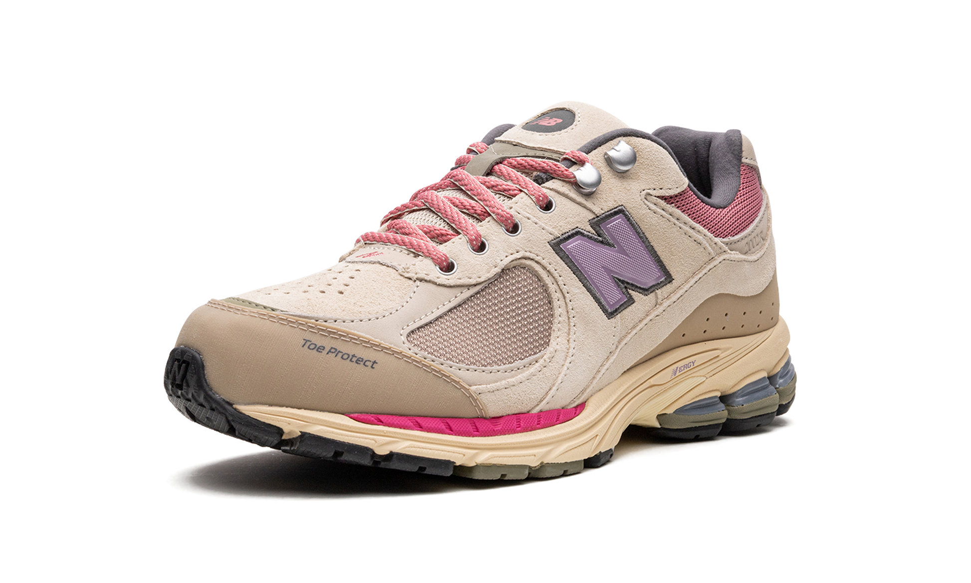 The New Balance 2002R “Hiking Pack - Beigeâ€?is a colorway of the retro performance running shoe from the outdoors-inspired collection. The “Beigeâ€?edition of the 2002R. as its name implies. features a tan mesh base and tonal suede overlays. Pink mesh appears on the collar. A purple textile “Nâ€?logo is found on the sides. Additional details include metal upper eyelet hooks. a reinforced toe. and an ABZORB cushioned midsole heel with “N-ERGYâ€?technology. Release date: June 18. 2022