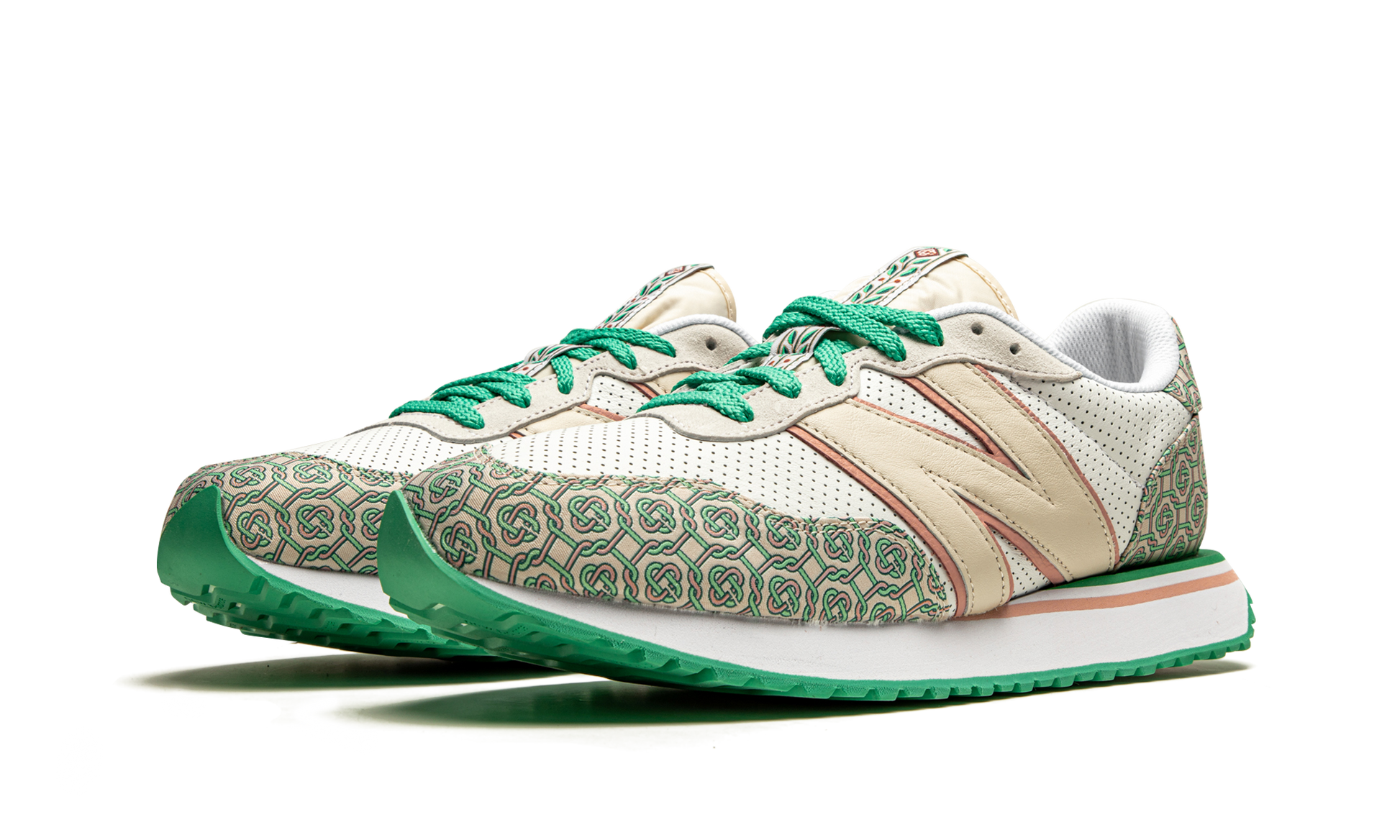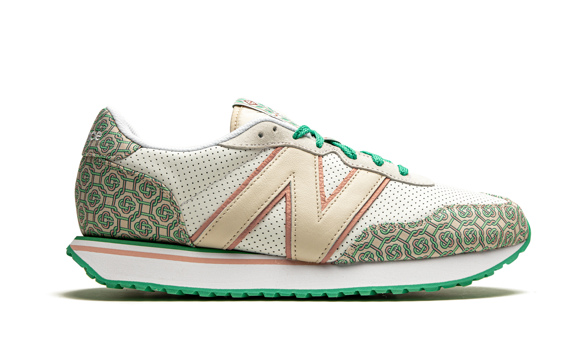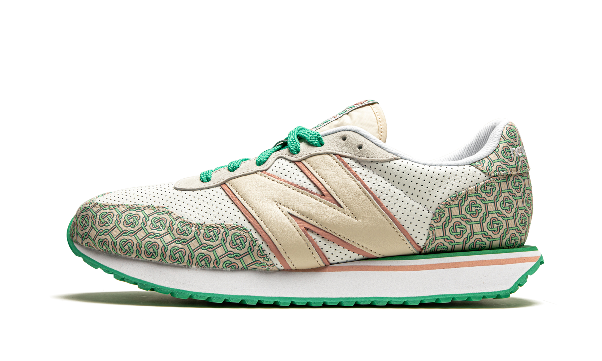 The Casablanca x New Balance 237 marks the third collaboration between the luxury fashion brand and New Balance. A March 2021 release. the New Balance 237 by Casablanca dresses up the heritage footwear brand's retro infused low-top shoe with the fashion label's flavorful monogram print. The premium pattern appears on the toe and heel and contrasts the white dotted leather base of the upper. In addition to the attention grabbing monogram print. Casablanca adds another exciting design element to the upper with the oversized tan leather “Nâ€?logo stitched onto both sides of the shoe. Green laces are layered over the floral motif that adorns the nylon overlay on the cream tongue. On the heel. white New Balance embroidery furthers the refinement of the design. The white foam midsole is contrasted by a green rubber outsole with a zig-zag tread that calls to mind the styling of vintage running shoes. Release date: March 5. 2021.
