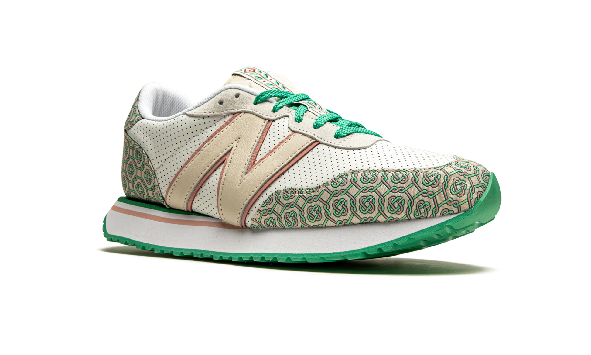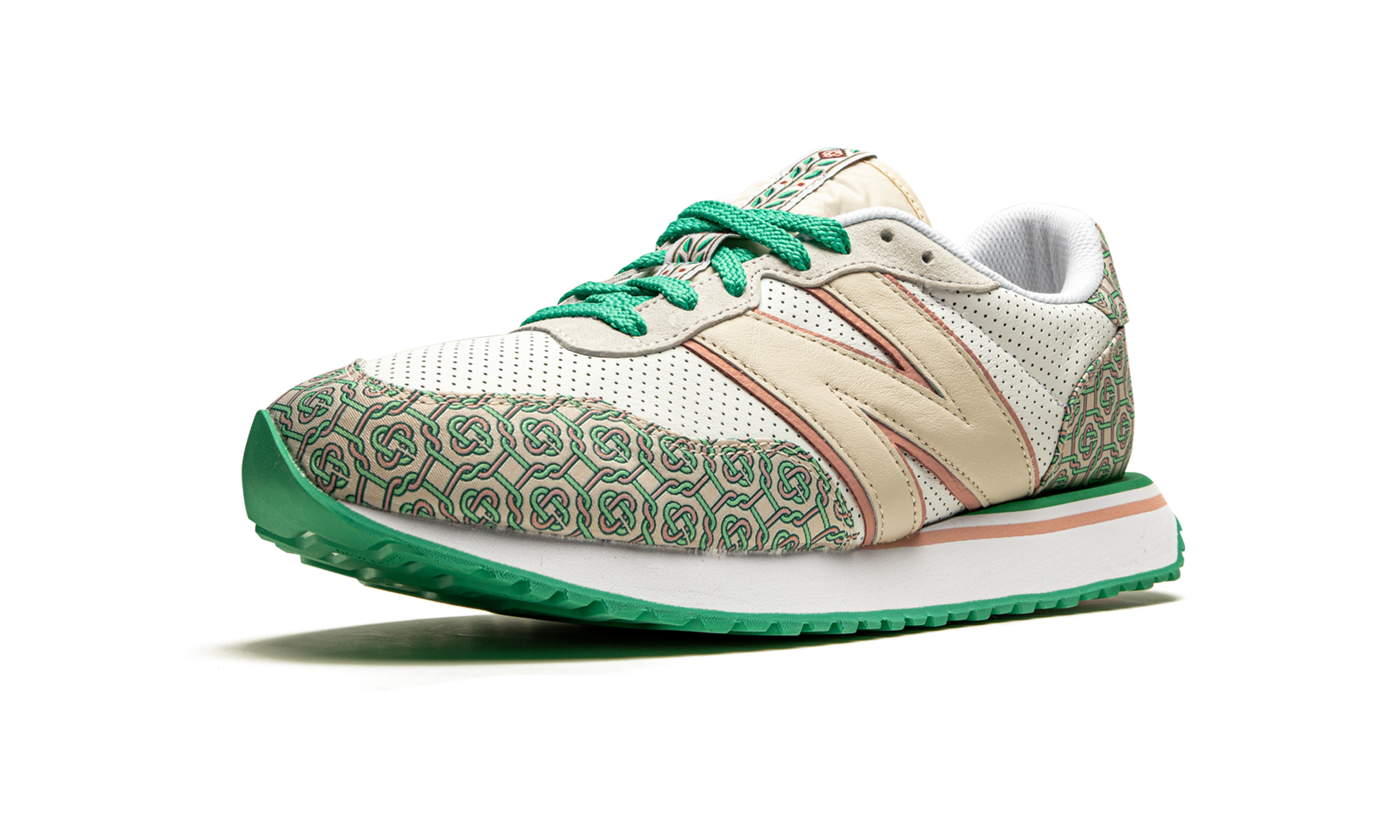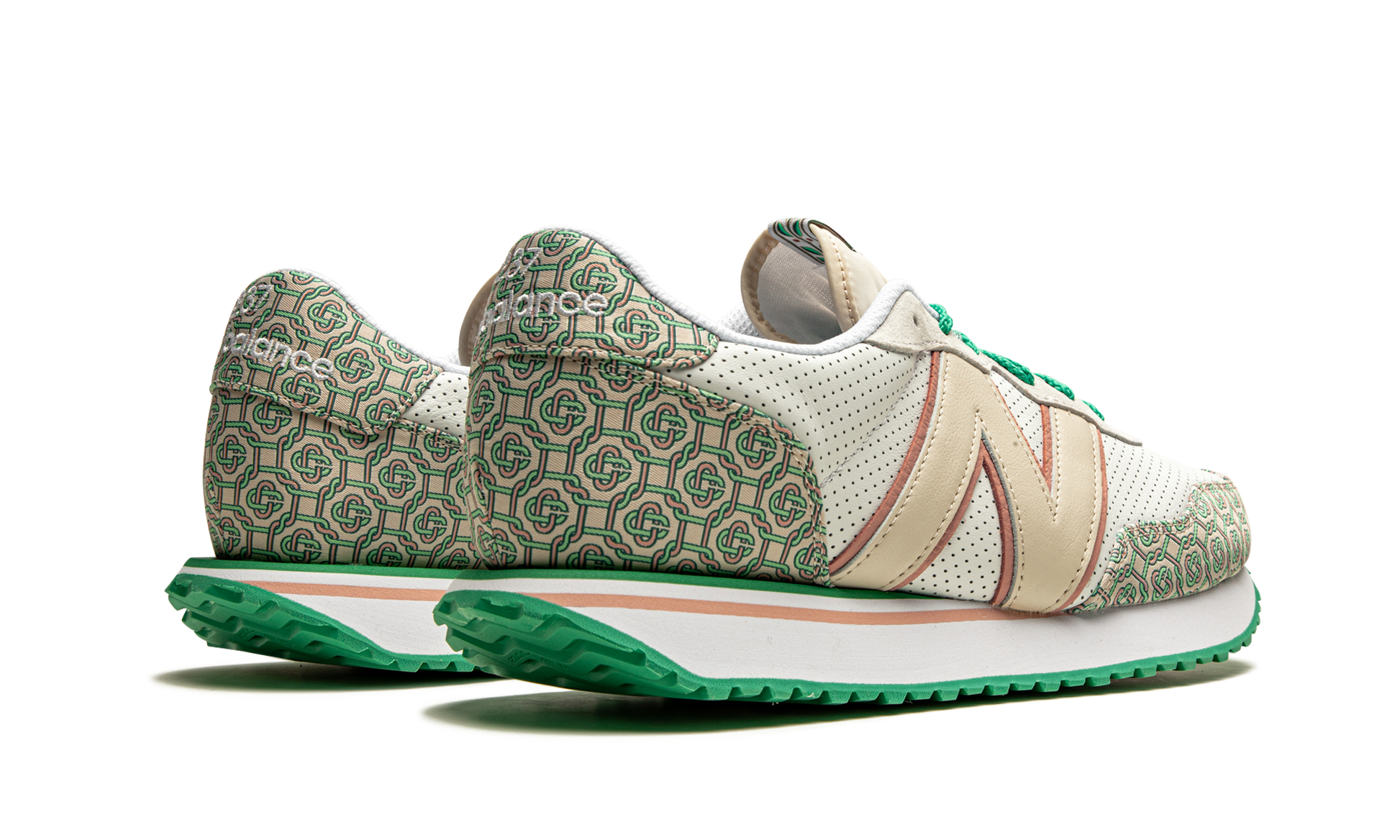 The Casablanca x New Balance 237 marks the third collaboration between the luxury fashion brand and New Balance. A March 2021 release. the New Balance 237 by Casablanca dresses up the heritage footwear brand's retro infused low-top shoe with the fashion label's flavorful monogram print. The premium pattern appears on the toe and heel and contrasts the white dotted leather base of the upper. In addition to the attention grabbing monogram print. Casablanca adds another exciting design element to the upper with the oversized tan leather “Nâ€?logo stitched onto both sides of the shoe. Green laces are layered over the floral motif that adorns the nylon overlay on the cream tongue. On the heel. white New Balance embroidery furthers the refinement of the design. The white foam midsole is contrasted by a green rubber outsole with a zig-zag tread that calls to mind the styling of vintage running shoes. Release date: March 5. 2021.