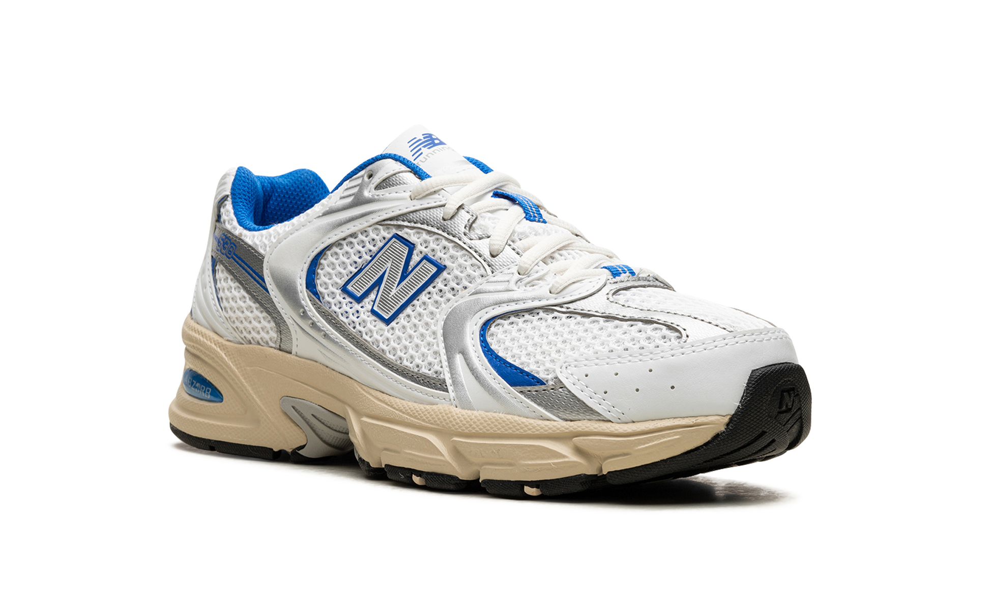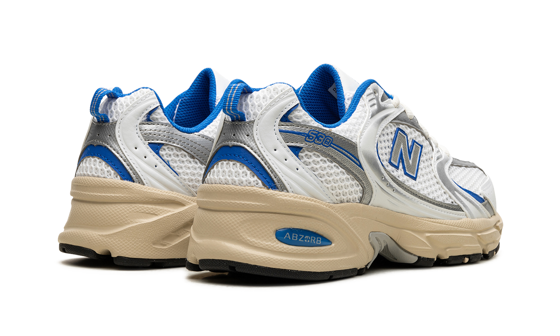 The New Balance 530 “White/Blue Oasisâ€?is a colorway of the classic running and lifestyle shoe with an aged. vintage look. Introduced in 1992. the New Balance 530 has been both a running shoe and. in the present day. a casual shoe. On this “White/Blue Oasisâ€?colorway. the model features a white mesh base with white and metallic silver leather overlays. A textured white “Nâ€?with Blue Oasis-colored trim appears on both sides. while a â€?30â€?logo can be seen on the lateral side of the heel. Classic “NBâ€?detailing is embroidered on the tongue. Underfoot. the shoe's chunky. foam midsole is given an aged look. It features New Balance's signature ABZORB cushioning for all-day comfort.