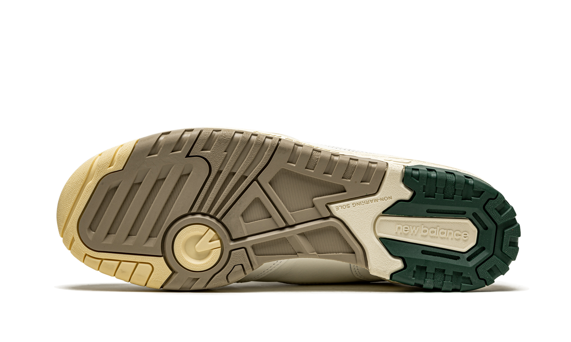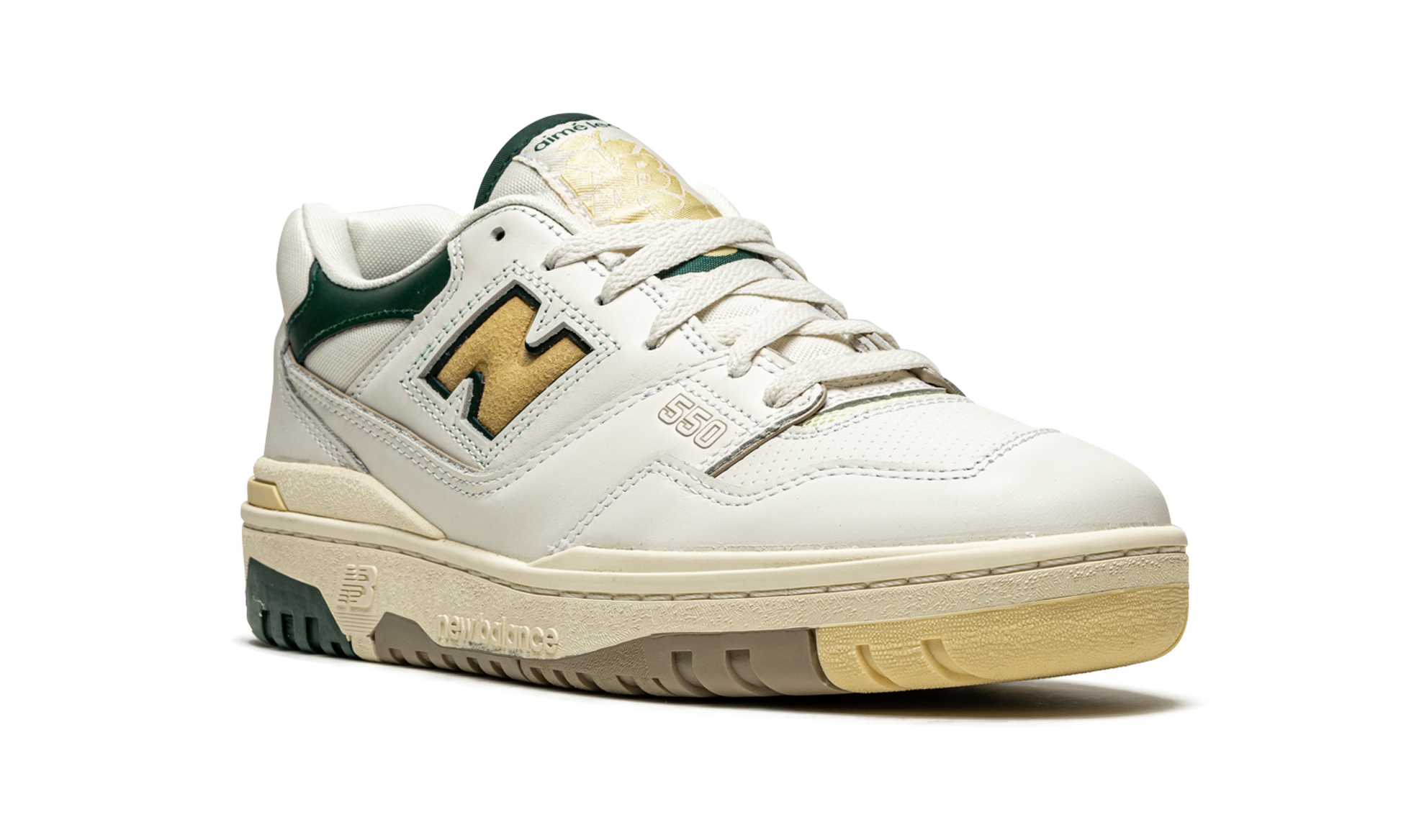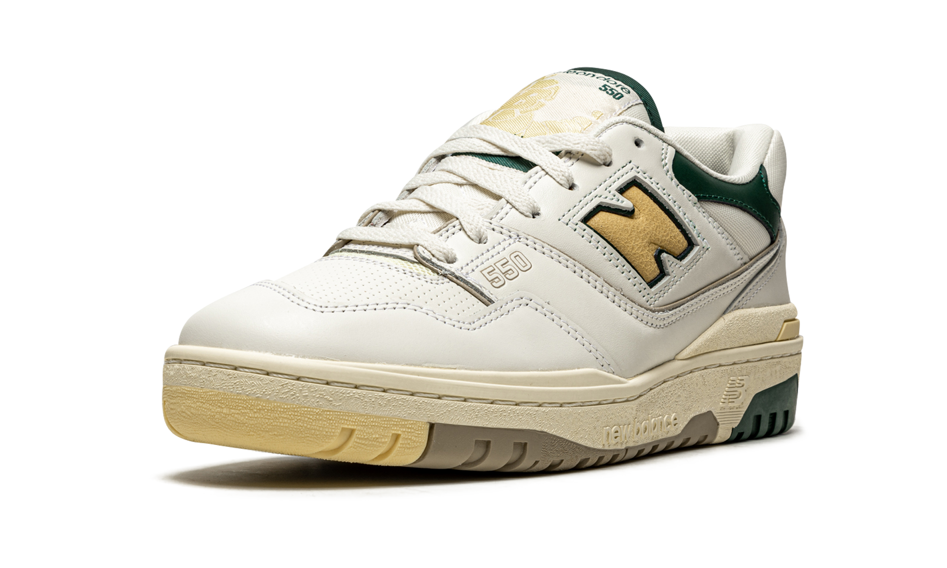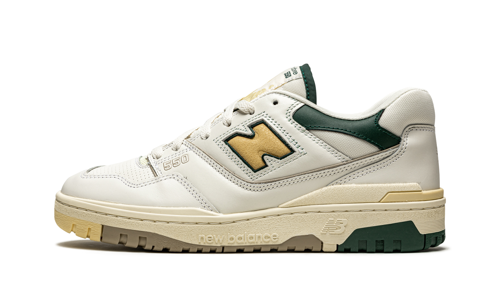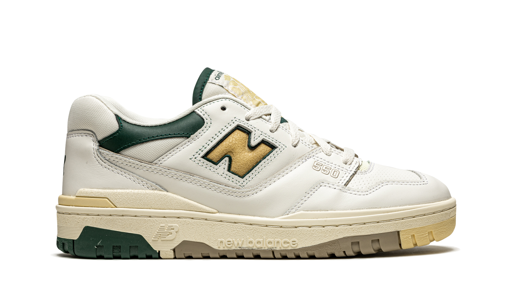 Aimé Leon Dore x New Balance 550 "Natural Green" is one of several colorways of the retro basketball shoe designed in collaboration between the New York based streetwear brand and New Balance in April 2021. Originally a performance basketball shoe when it debuted in the late '80s. the New Balance 550 was quickly phased out of the brand's footwear offerings due to it not being tied to one player or memorable moment in the NBA. In 2020. Aimé Leon Dore reached into the depths of New Balance's archives to bring back the old school hoops shoe. giving it a much deserved second life as a lifestyle look in modern times. Smooth and dotted white leather appears on the upper. A metallic yellow “Nâ€?logo resides on both sides. Dual Aimé Leon Dore and “NBâ€?branding can be found on the back of the left and right shoe. respectively. A Natural Green leather overlay appears on the collar. The pre-yellowed rubber midsole ties into the New Balance 550's heritage as a vintage performance basketball shoe. The look is consistent with Aimé Leon Dore's other popular 550 collaborations. Release date: April 16. 2021