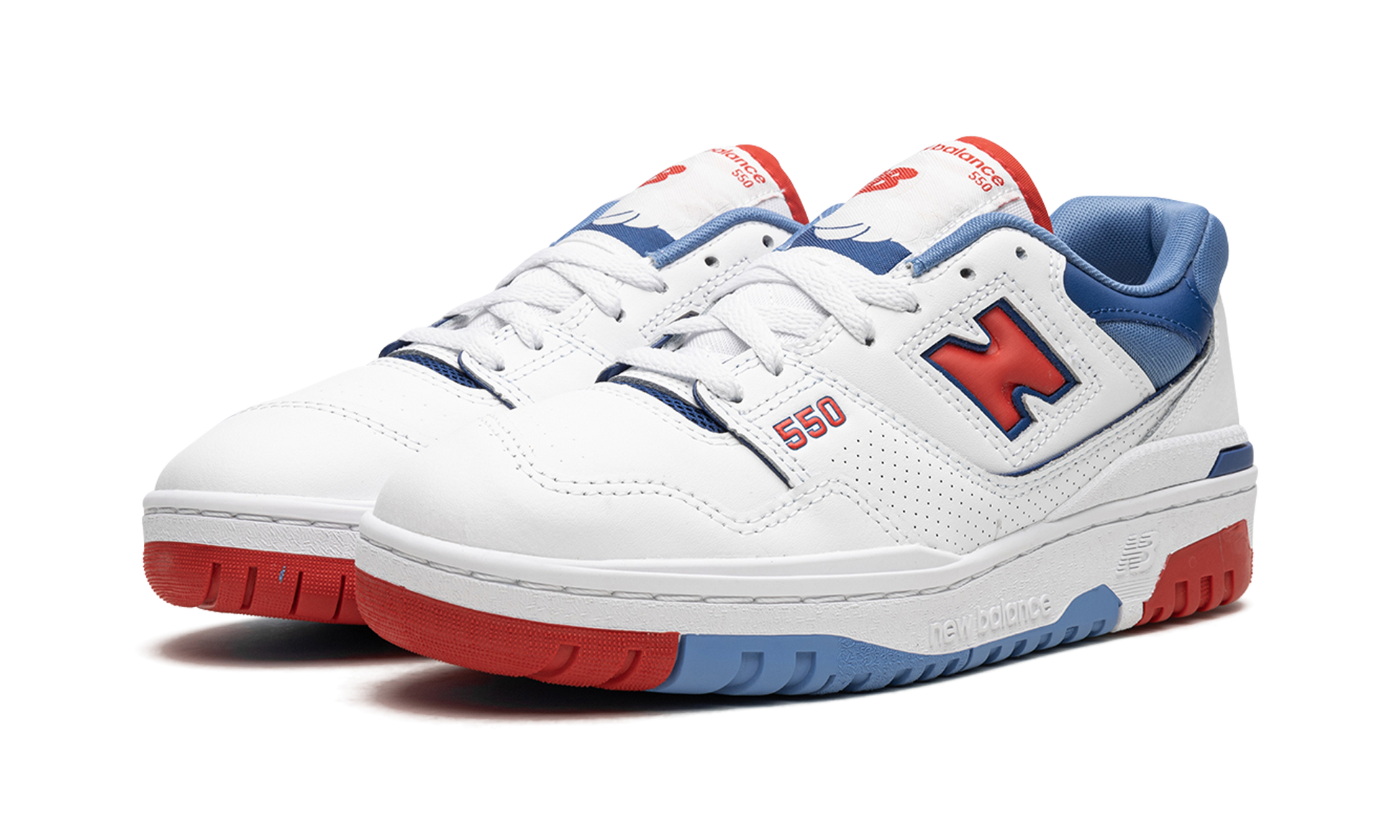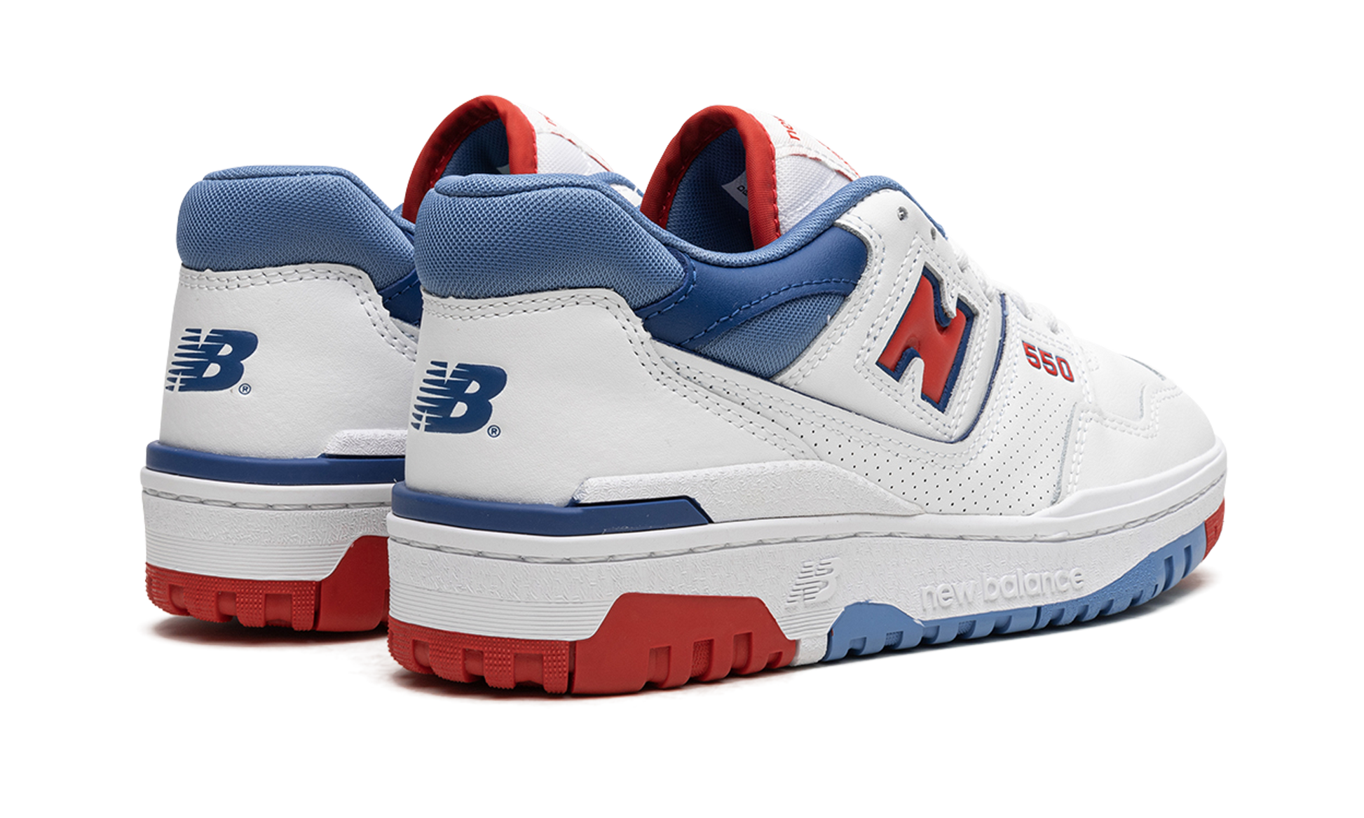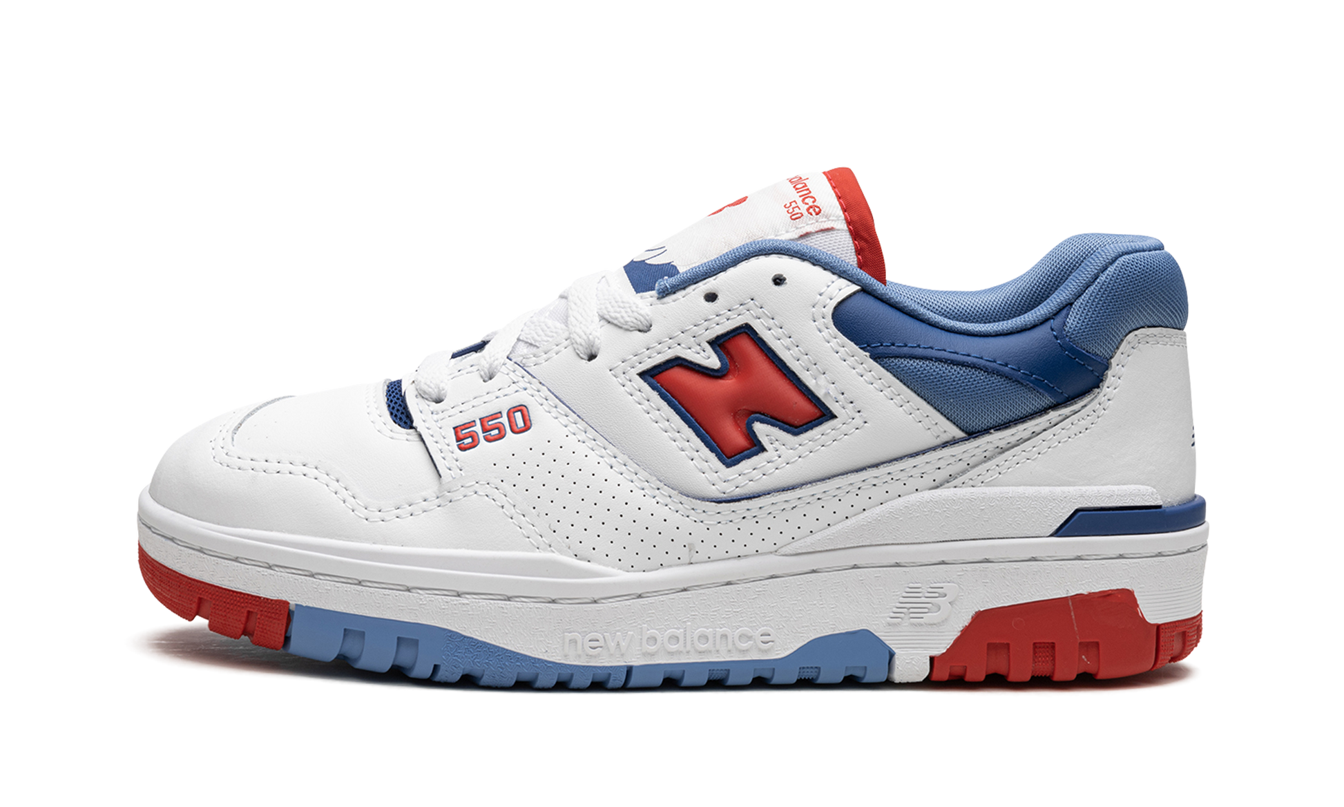The New Balance 550 “White/Red/Blueâ€?is a patriotic colorway of the vintage basketball shoe by the Boston based footwear company. The New Balance 550 returned in 2020 when Aimé Leon Dore began collaborating with New Balance on vintage colorways of the classic silhouette. From there. the model picked up considerable steam and is now a core part of New Balance's seasonal releases. The shoe features a white leather design with a red “Nâ€?on the sides. Blue mesh is found on the base of the collar and on the leather overlay. Classic “NBâ€?and “New Balance 550â€?logos appear on the heel and tongue. respectively. Underfoot. a chunky white rubber midsole and white. red. and blue outsole finish off the look. Release date: April 6. 2023