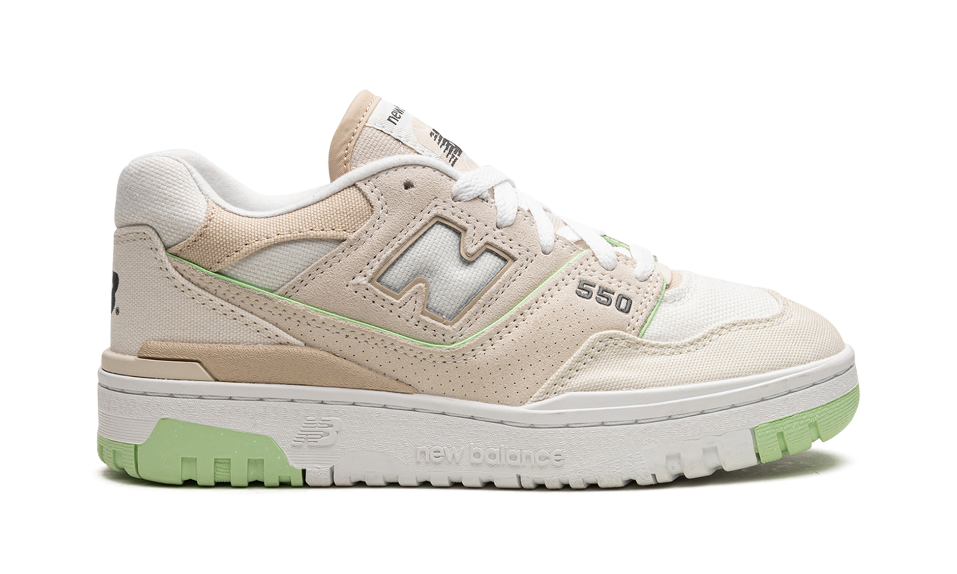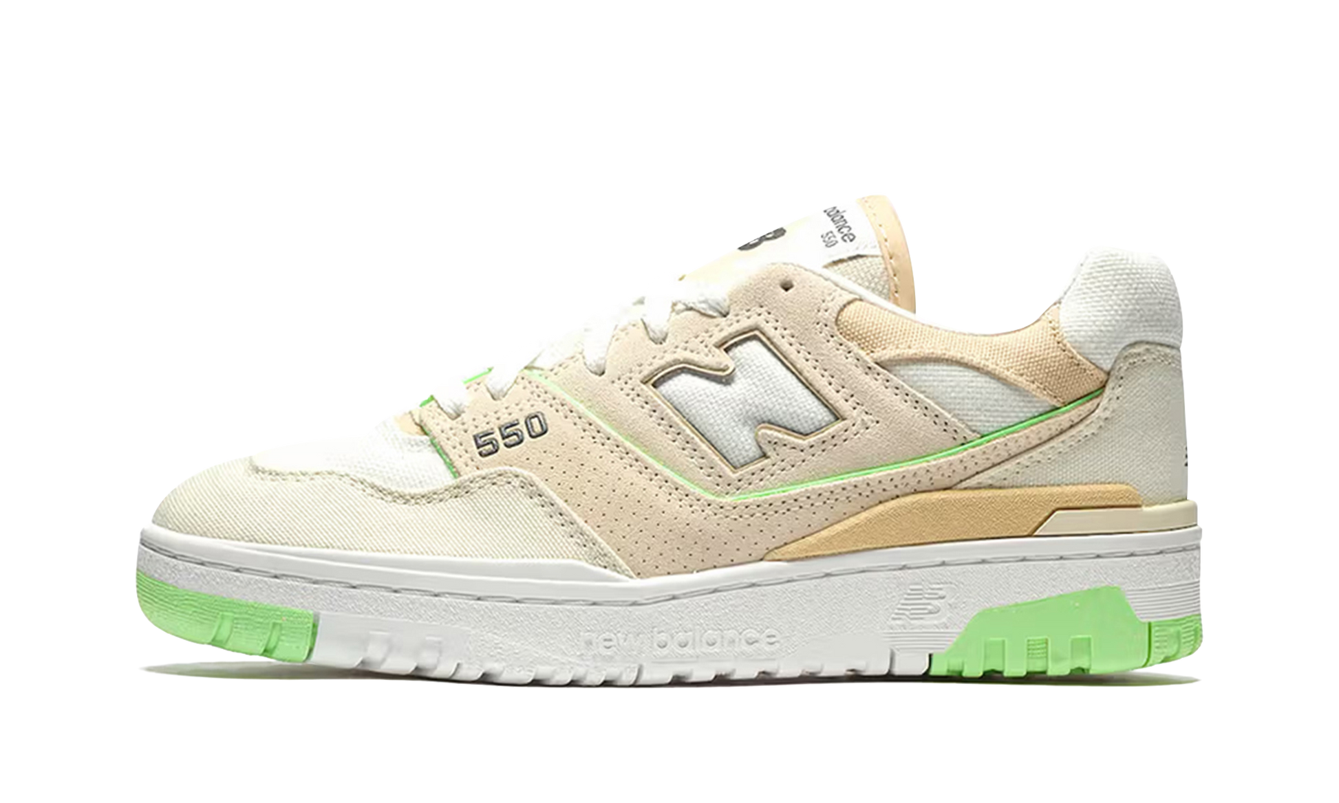 The Women's New Balance 550 “Turtledoveâ€?is a women's-exclusive colorway of the retro basketball shoe with a versatile appearance. The “Turtledoveâ€?550 features a white mesh base with a tan canvas toe overlay and a tan suede mid-panel overlay. A white “Nâ€?logo can be found on each side of the shoe. A grey â€?50â€?logo appears on the lateral side of the forefoot and “NBâ€?detailing is located on the heel. A classic “New Balance 550â€?graphic appears on the tongue. A splash of color is provided by the neon green piping along the upper's mid-panel overlay and on the rubber outsole.