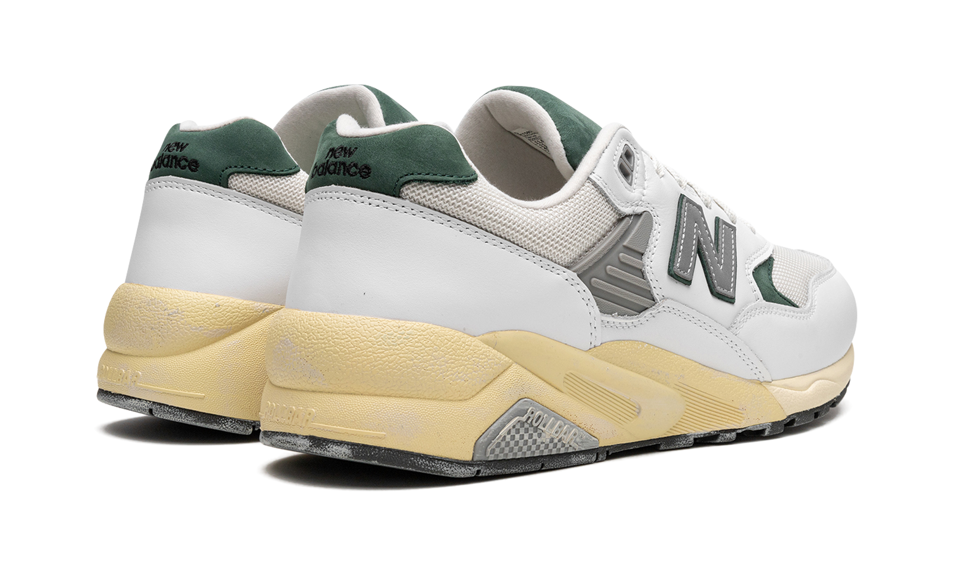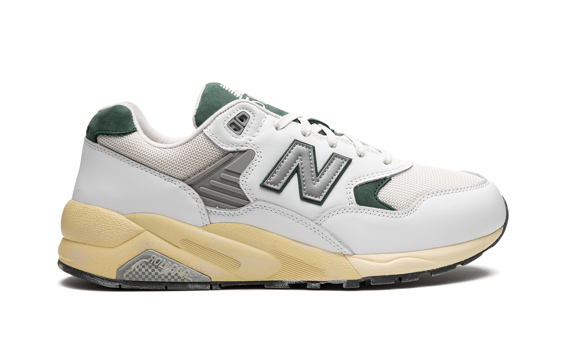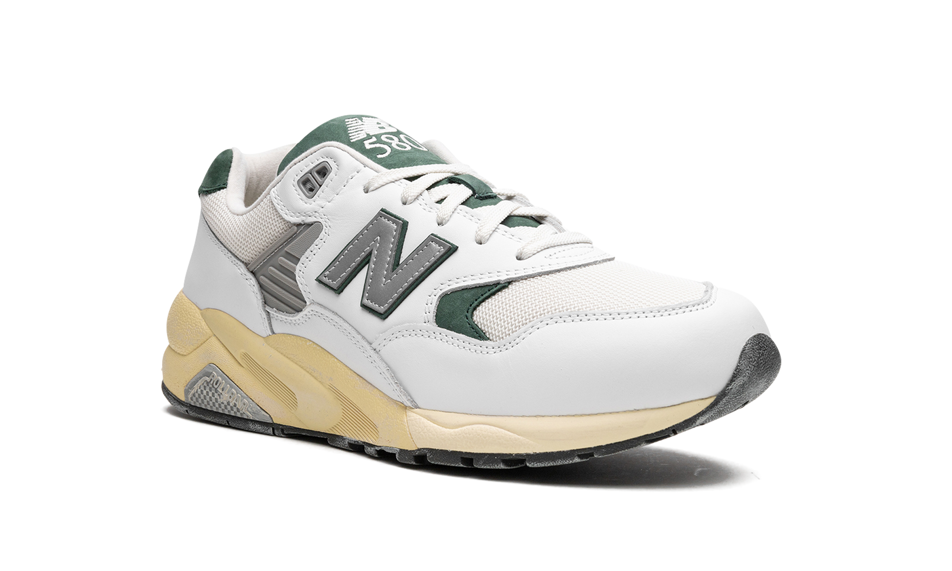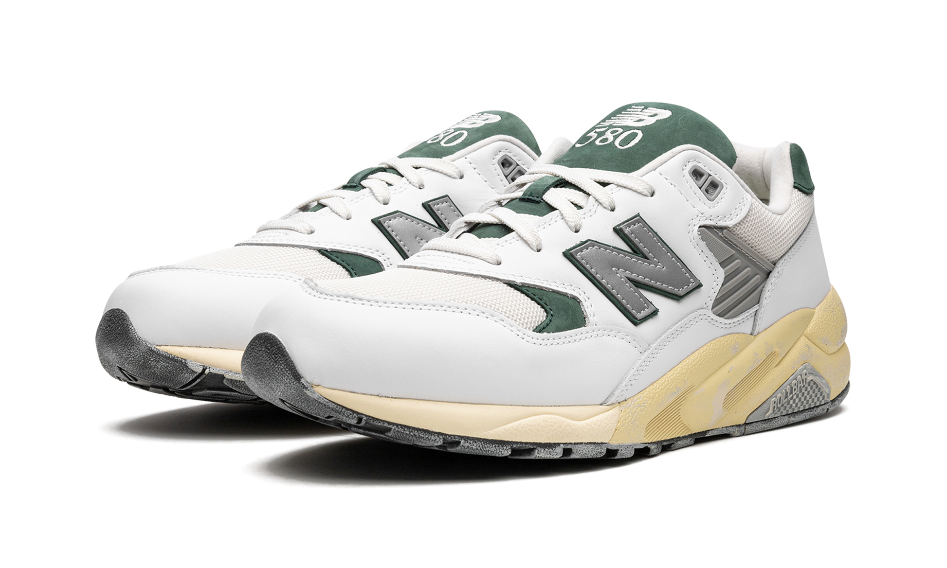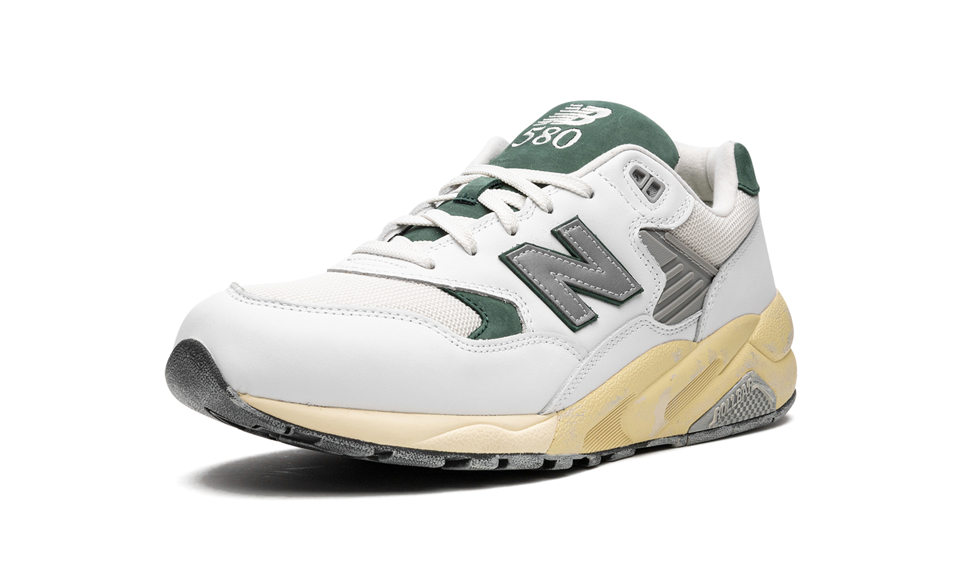 The New Balance 580 “Nightwatch Greenâ€?is a colorway of the classic shoe with a decidedly vintage vibe. This version of the New Balance 580 features a white mesh base with white leather overlays. A contrasting grey “Nâ€?logo appears on the mid-panel. Classic “NB 580â€?detailing is embroidered on the Nightwatch-Green-colored suede tongue. Black “New Balanceâ€?branding is stitched onto the green heel overlay. Underfoot. the shoe takes on a throwback-inspired vibe with an intentionally aged Rollbar-cushioned midsole.
