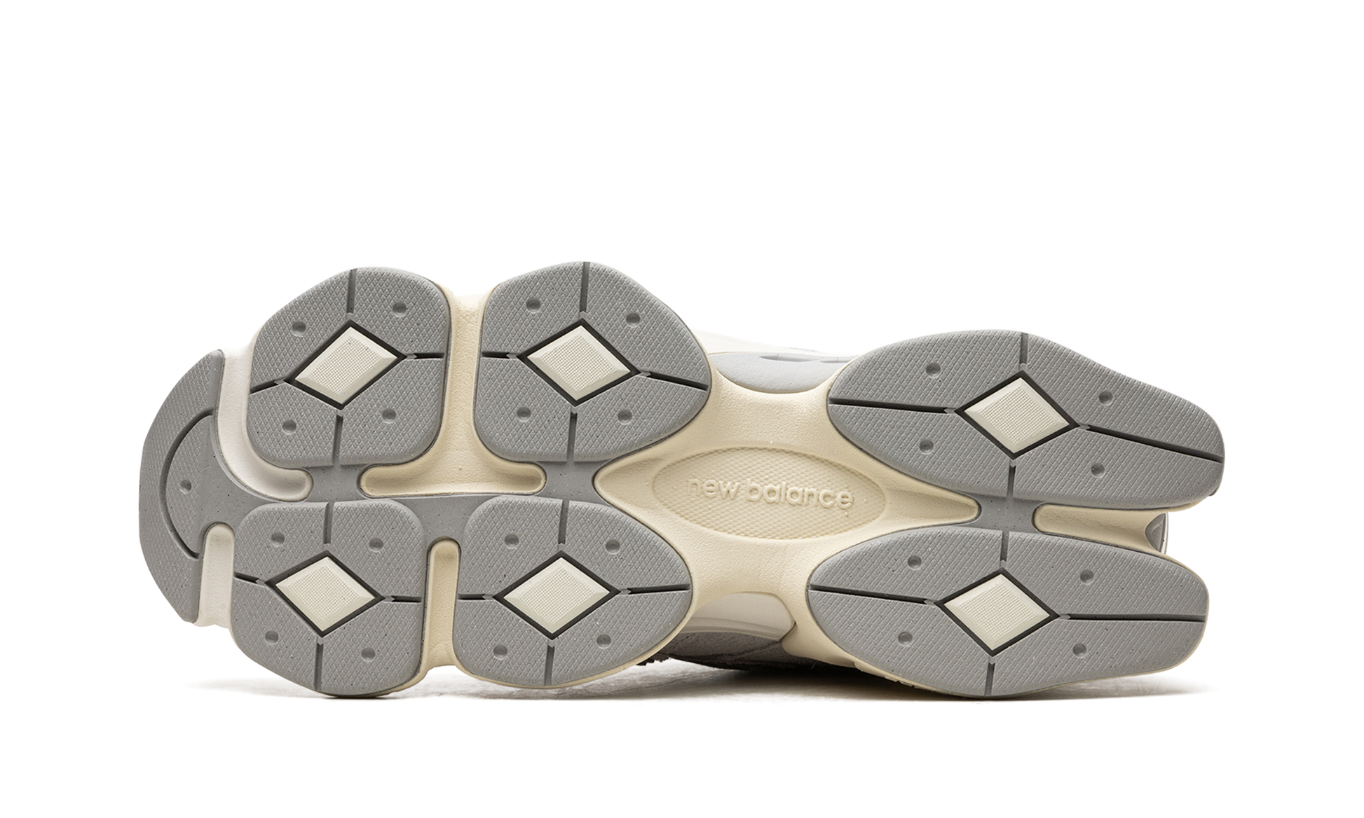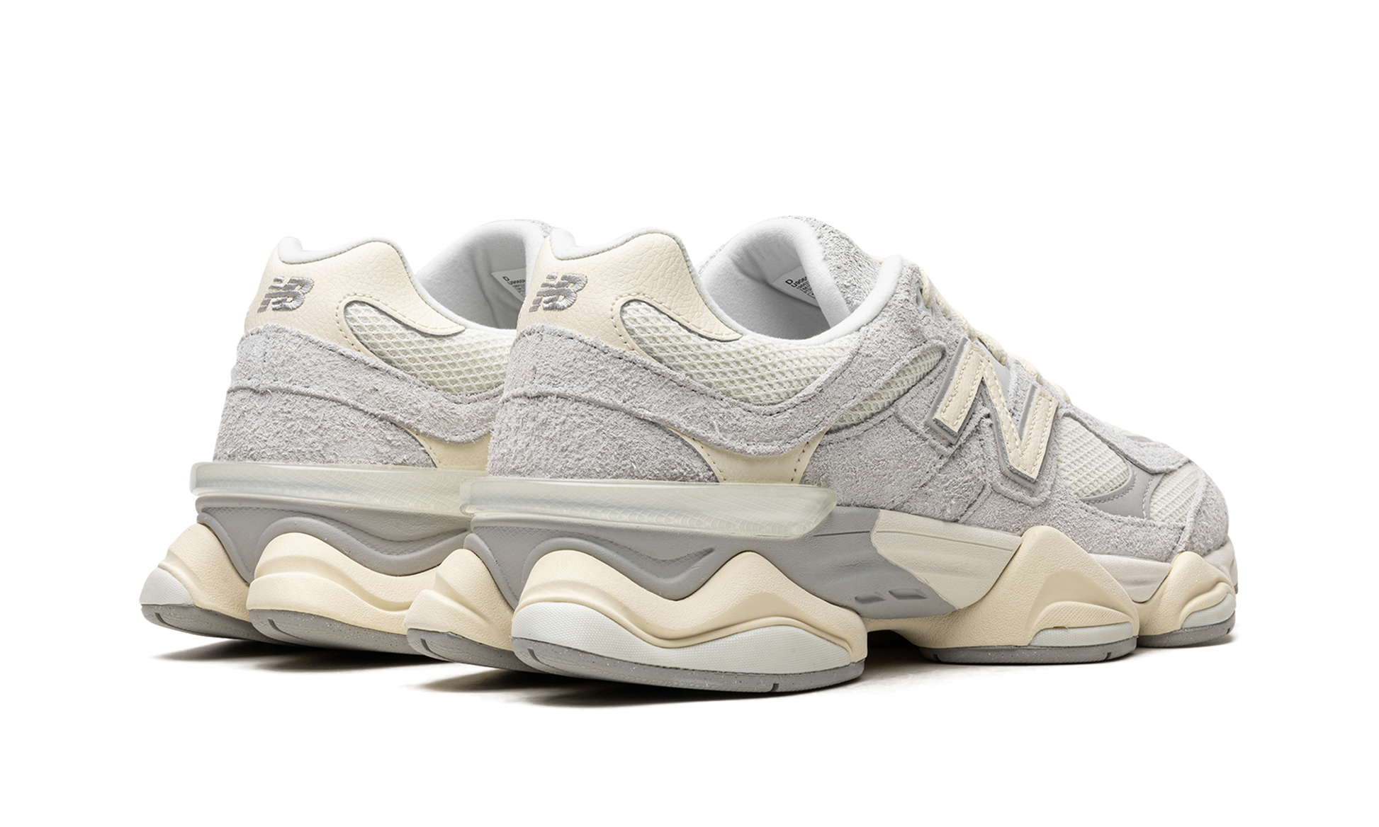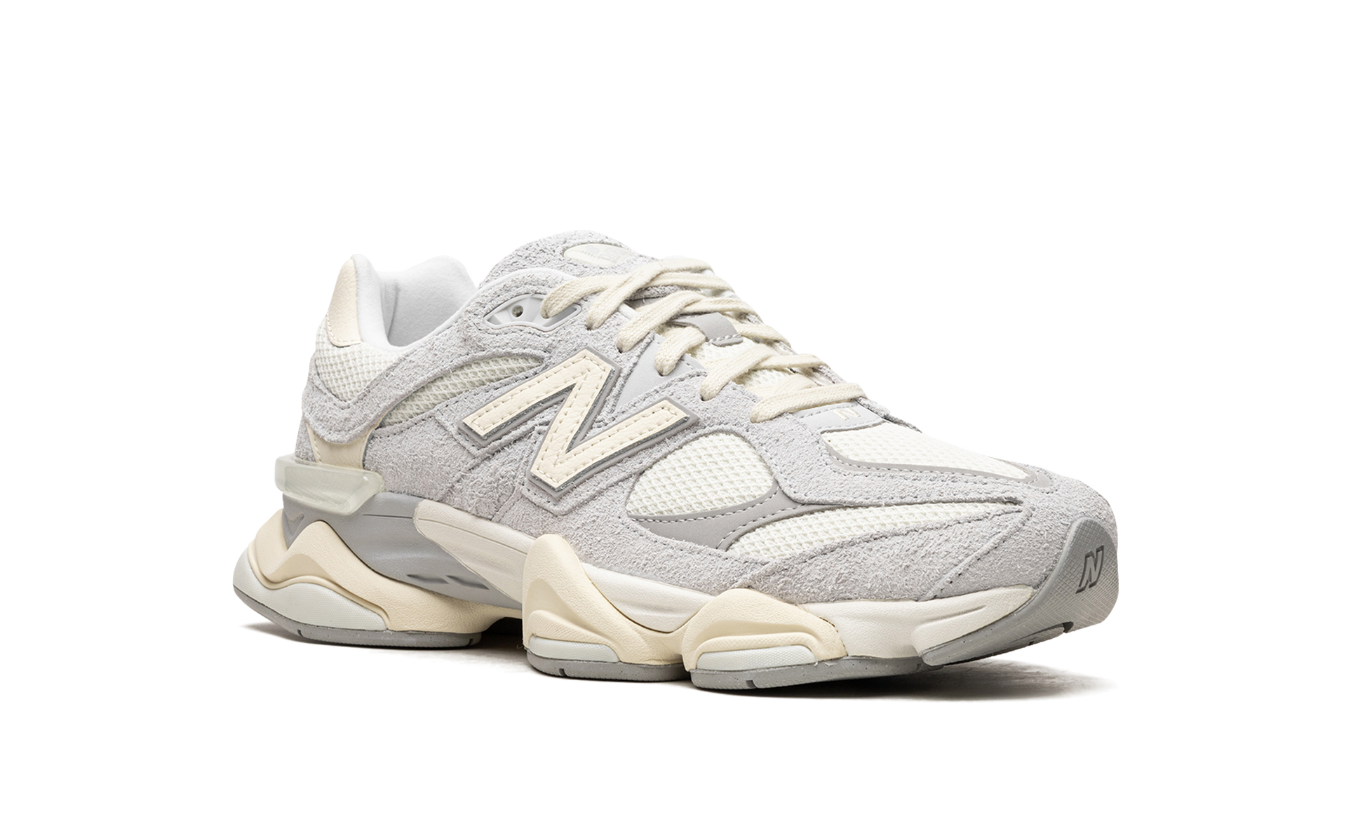 Discover versatile style with the New Balance 9060 "Quartz Grey." This retro-modern sneaker features an off-white mesh upper with sophisticated Quartz Grey suede overlays. Cream leather accents appear on the toe and heel. while a cream leather oversized "N" logo adds a distinctive touch. A chunky cream and grey rubber midsole completes the look.