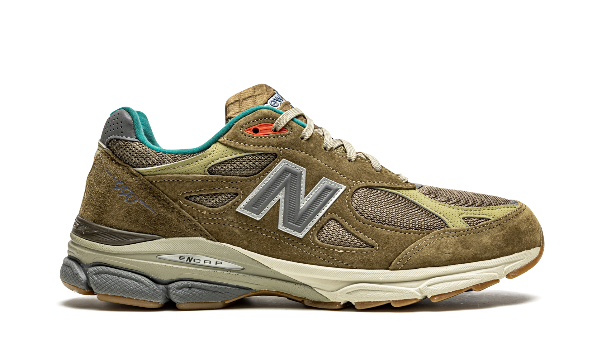 Green suede x Bodega 990v3 "Anniversary" sneakers from NEW BALANCE featuring logo patch to the side. contrasting panel detail. round toe. front lace-up fastening. logo patch at the tongue. branded insole and rubber sole. These styles are supplied by a premium sneaker marketplace. Stocking only the most sought-after footwear. they source and curate some of the most hard to find sneakers from around the world..