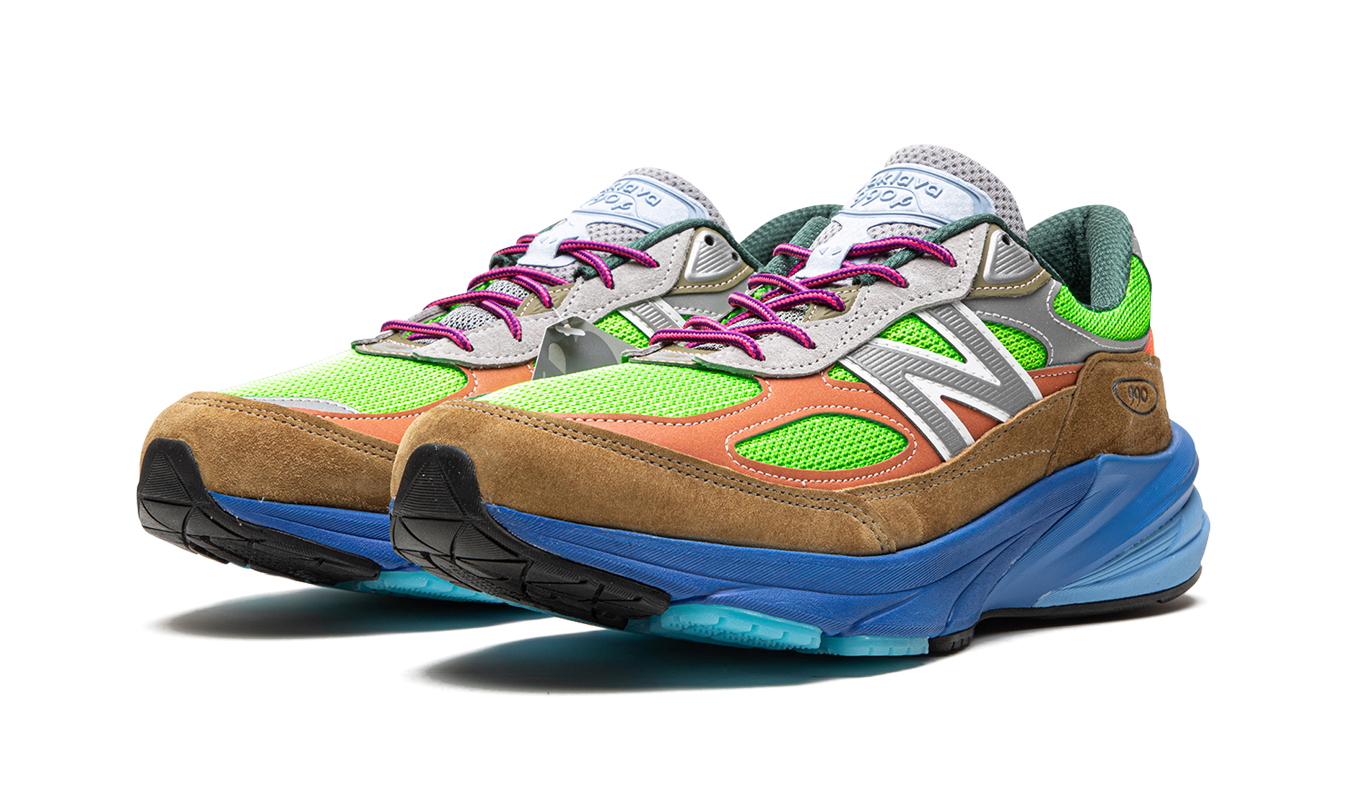 The Action Bronson x New Balance 990 V6 “Baklavaâ€?is a collaboration by the New York based hip-hop artist on the popular lifestyle shoe. Memorably worn by Action Bronson during his appearance at an AEW wrestling match in September 2022. the New Balance 990 V6 “Baklavaâ€?is the chef. rapper. and entertainer's debut sneaker collaboration with the Boston footwear brand. The shoe features a neon yellow mesh base with a tan suede mudguard overlay. Contrasting reflective leather overlays are found on the toe and collar. Camel-colored leather paneling is located on the sides near the grey “Nâ€?branding. Dual branding is found on the insole. Underfoot. the shoe rides on a blue midsole. Release date: March 17. 2023