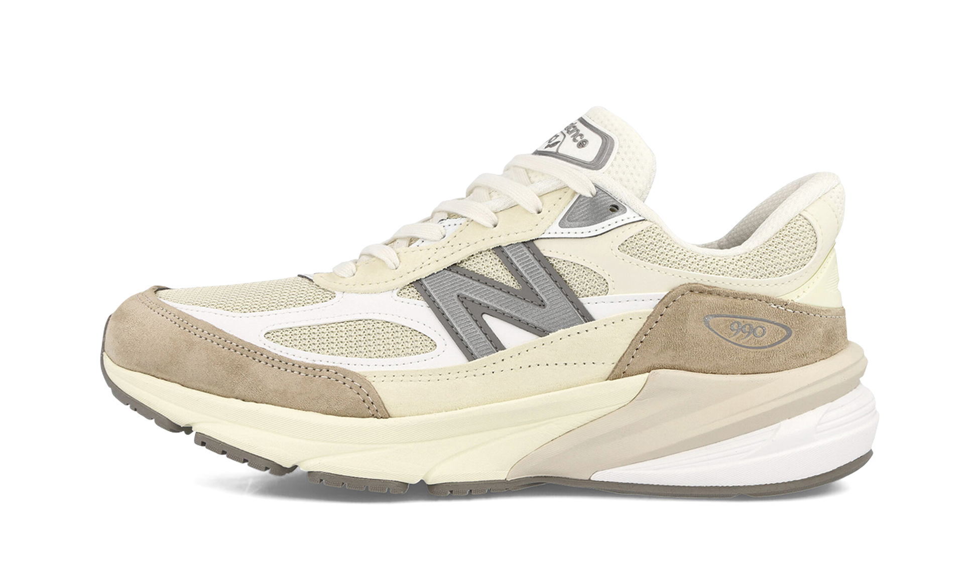 The New Balance 990v6 "Made in USA - Cream" is a versatile and neutral based colorway of the sixth variation of the popular sneaker. Debuted in 2023. the New Balance 990v6 was released in multiple colorways. including in “Creamâ€?as seen here. The shoe features a cream-colored mesh base with white leather overlays on the toe and tonal leather and suede overlays on the mid-panel and eyelets. respectively. A grey “Nâ€?logo appears on both sides of the shoe while classic “New Balanceâ€?branding is seen on the tongue. New Balance features its signature ABZORB cushioning with FuelCell and ENCAP technology in the shoe's sizable midsole. Release date: July 27. 2023