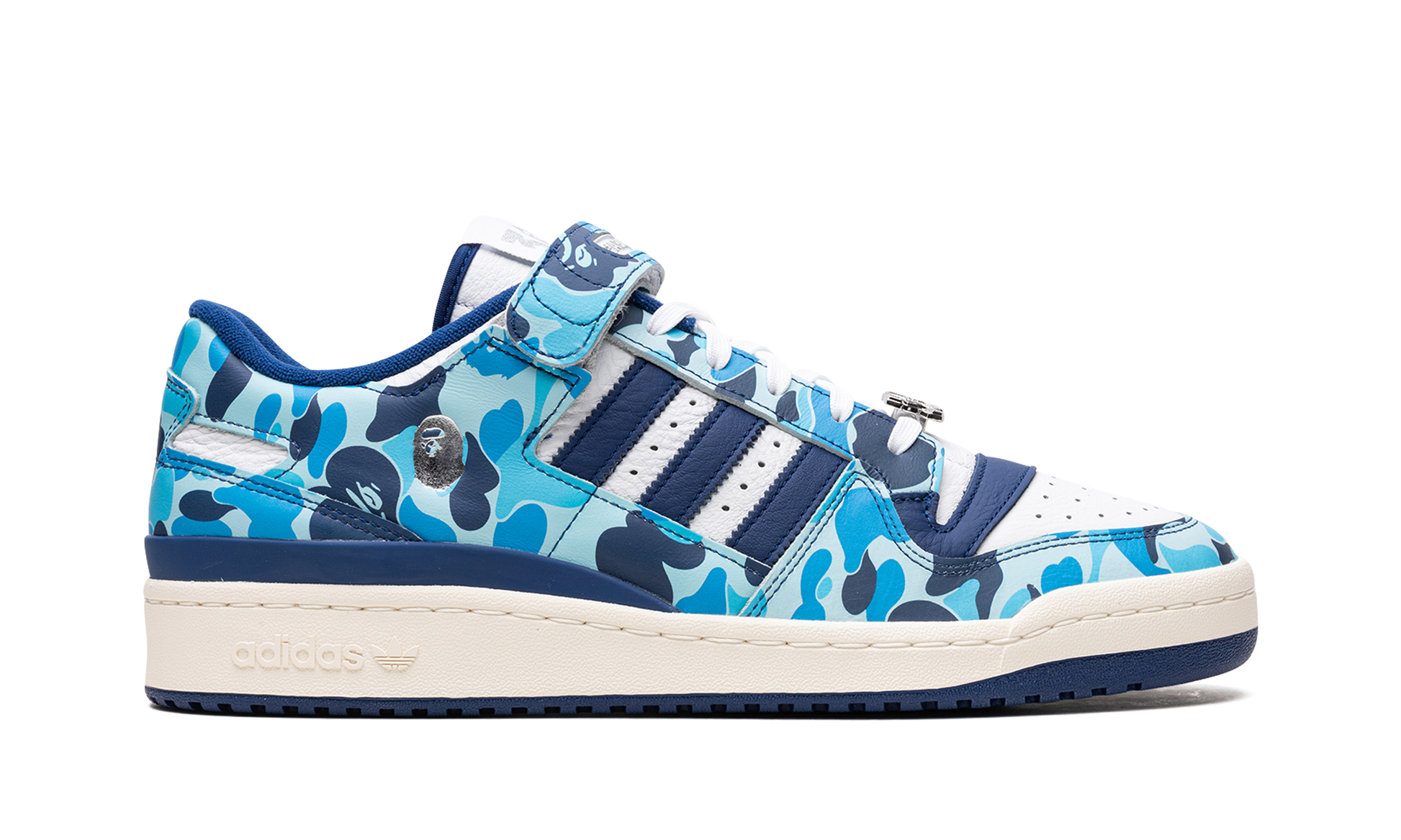 The BAPE x adidas Forum '84 Low “Blue/Whiteâ€?is one of two colorways of the retro basketball shoe co-designed by the Japanese streetwear brand and adidas in celebration of the former's 30th anniversary. BAPE's signature ABC Camo appears in a white-and-blue-based pattern on the shoe's overlays. Underneath. a white leather construction forms the base of the shoe. Blue Three Stripes branding can be found on each side. A debossed APE head appears on the lateral side of the mid-panel. â€?A Bathing APEâ€?branding is displayed on the front of the adjustable ankle strap and a silver â€?0th Anniversaryâ€?lace dubrae is found on the vamp. Release date: April 24. 2023