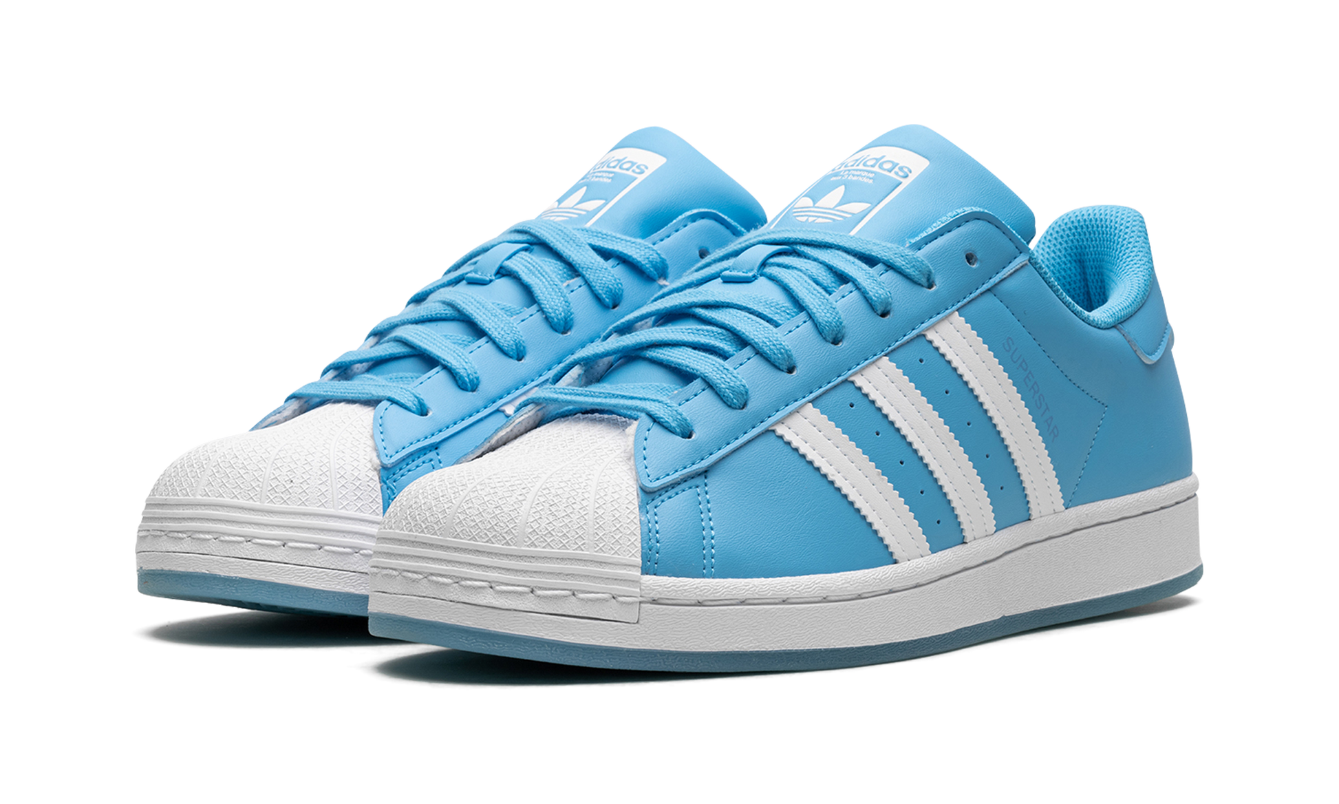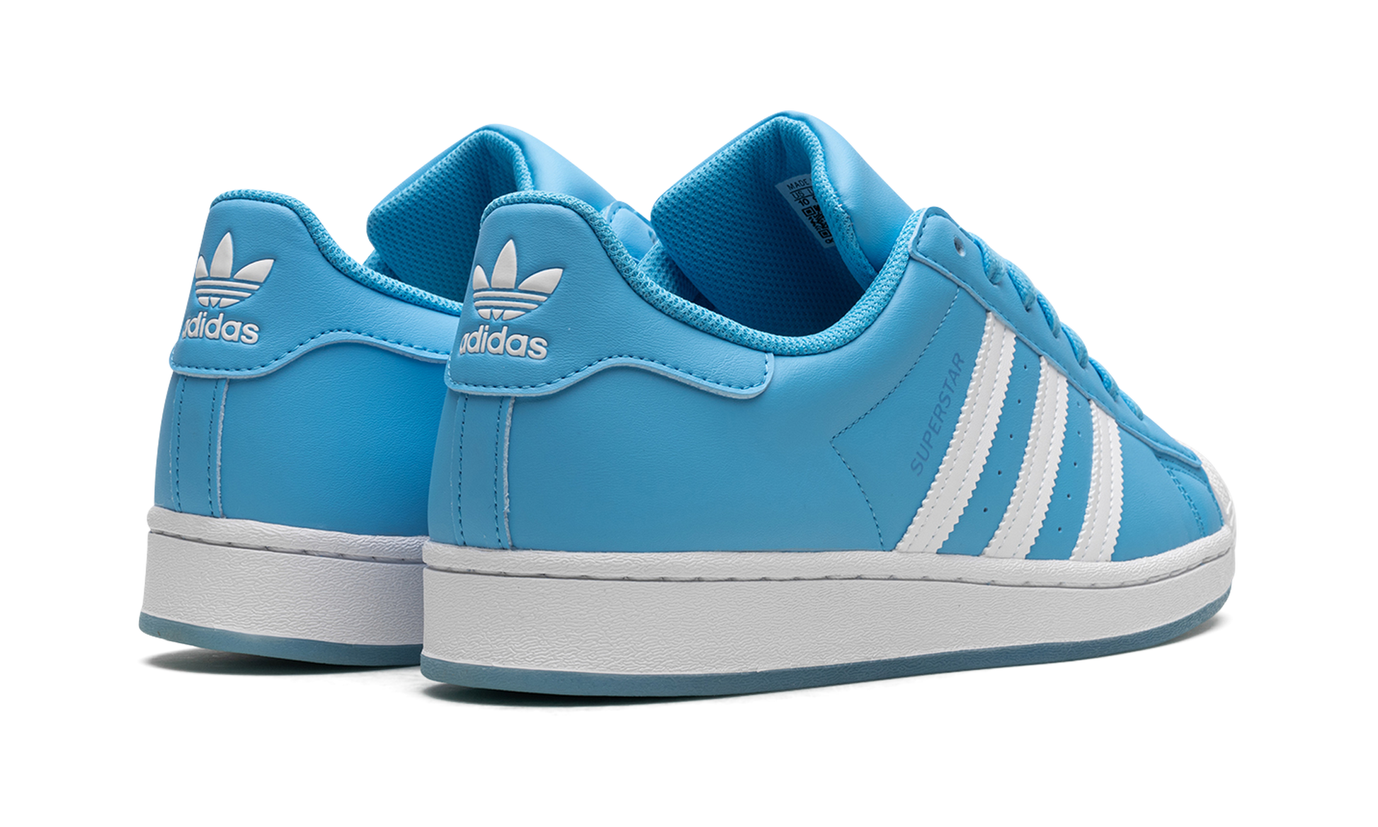 The Adidas Superstar 'Sky Rush' shoe features a classic design in a vibrant sky blue colorway. making it a versatile and stylish addition to any sneaker collection.