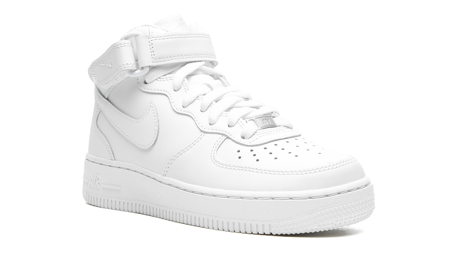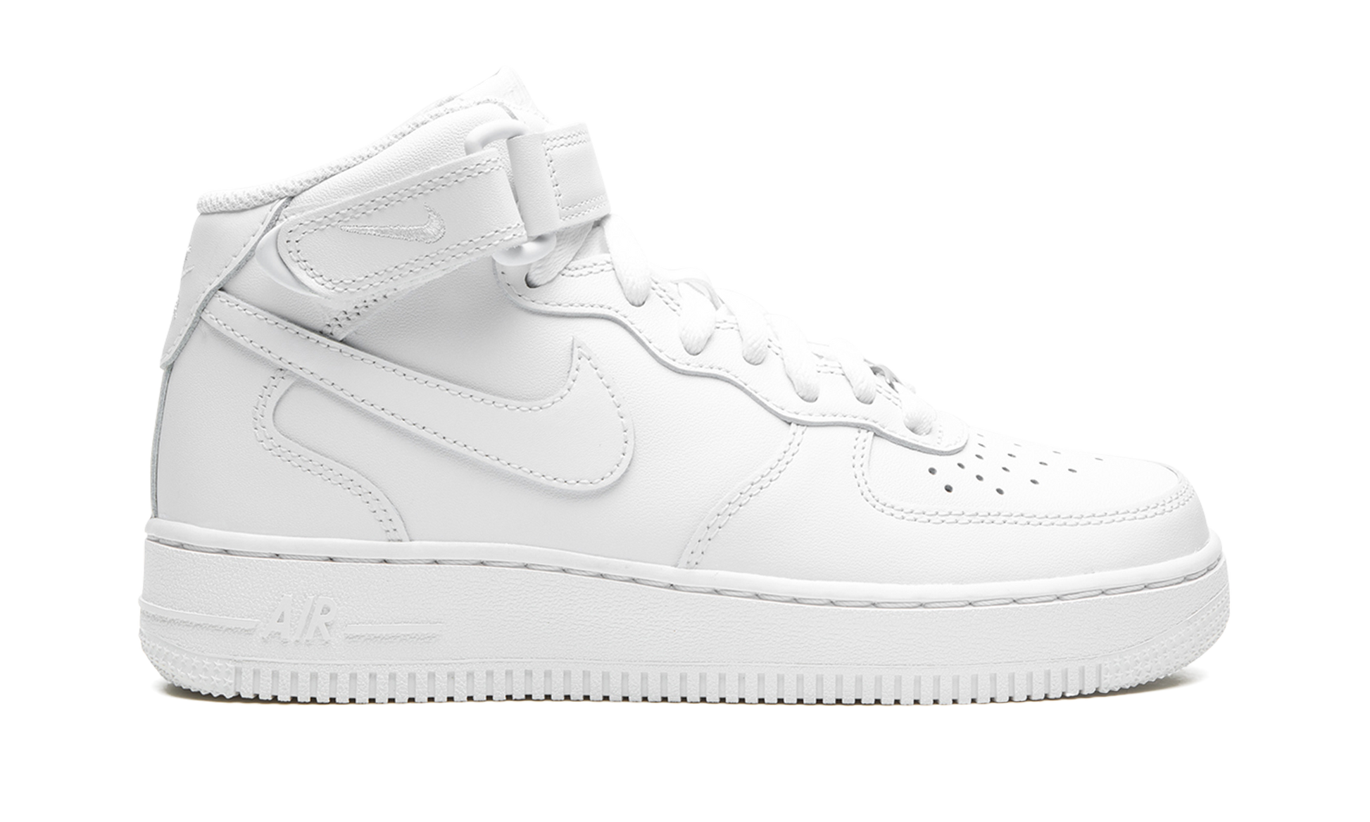 The Women's Nike Air Force 1 Mid “Triple Whiteâ€?is the women's sizing of the timeless. monochromatic white colorway of the classic sneaker. The “Triple Whiteâ€?Air Force 1 Mid is a versatile colorway of the vintage basketball shoe that has appeared on several versions of the silhouette over the years. The entire upper is constructed from crisp white leather. including the perforated toe and the mid-panel. collar. and Swoosh branding. A tonal embroidered “Nike Airâ€?logo is stitched onto the heel and a silver “AF1â€?lace emblem appears on the throat. The adjustable white nylon ankle strap provides stability for the wearer. The white monochromatic look continues on the rubber midsole where white “Airâ€?detailing on the heel of the midsole completes the design.