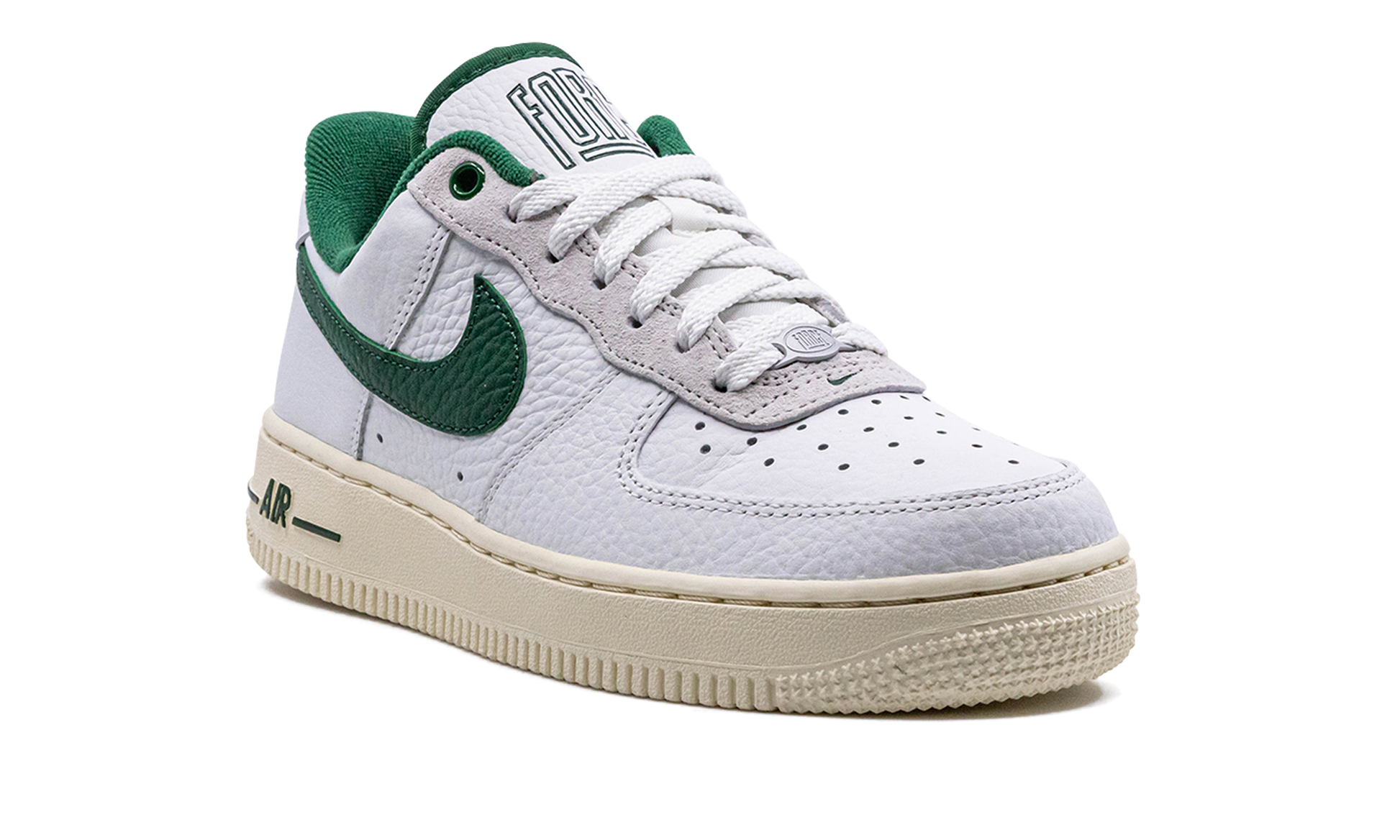 The Women's Nike Air Force 1 Low '07 LX Command Force "Gorge Green" is a women's-exclusive colorway of the popular sneaker that pays homage to the classic Nike Command Force basketball shoe. Originally released in 1991. the Command Force is a retro hoops model that inspires the look of the Air Force 1 Low seen here. The colorway features a white leather upper with Gorge Green leather on the Swoosh. inner lining. and on the underside of the tongue. The green hue also appears on the Command Force-inspired branding on the “Forceâ€?logo on the tongue and on the “Nikeâ€?hit on the heel tab. Underfoot. the shoe retains the Air Force 1's standard sole unit. this time painted in a cream shade for an aged look.