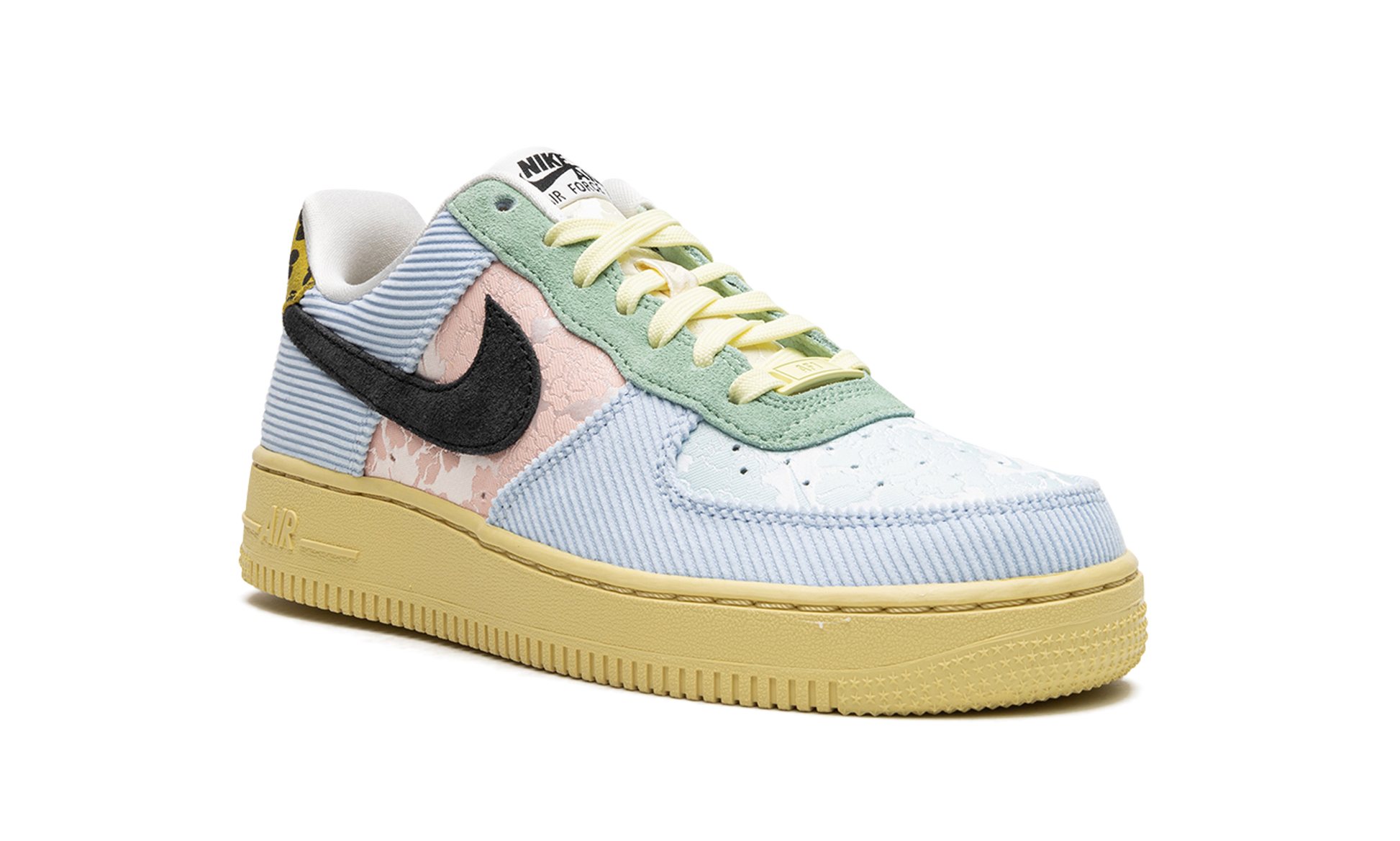 The Women's Nike Air Force 1 Low “Celestine Blueâ€?is a women's-exclusive colorway of the classic sneaker with a mismatched design. Arranged in a blend of pastel hues. the “Celestine Blueâ€?features shades of blue. yellow. green. and pink on its design in materials such as corduroy. suede. and a floral pattern in pink. A black Swoosh appears on the mid-panel. Classic “Nike Air Force 1â€?branding is printed on the tongue tag and “Nike Airâ€?detailing is found on the animal print heel tab. Underfoot. a yellow rubber sole completes the look. Release date: April 13. 2023