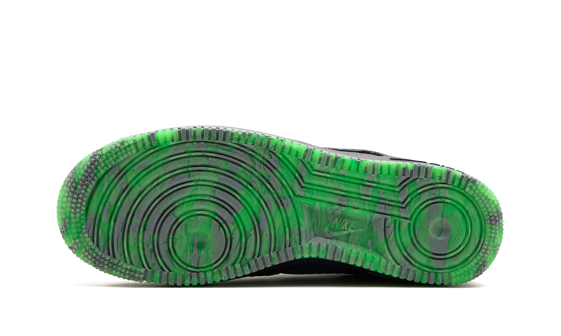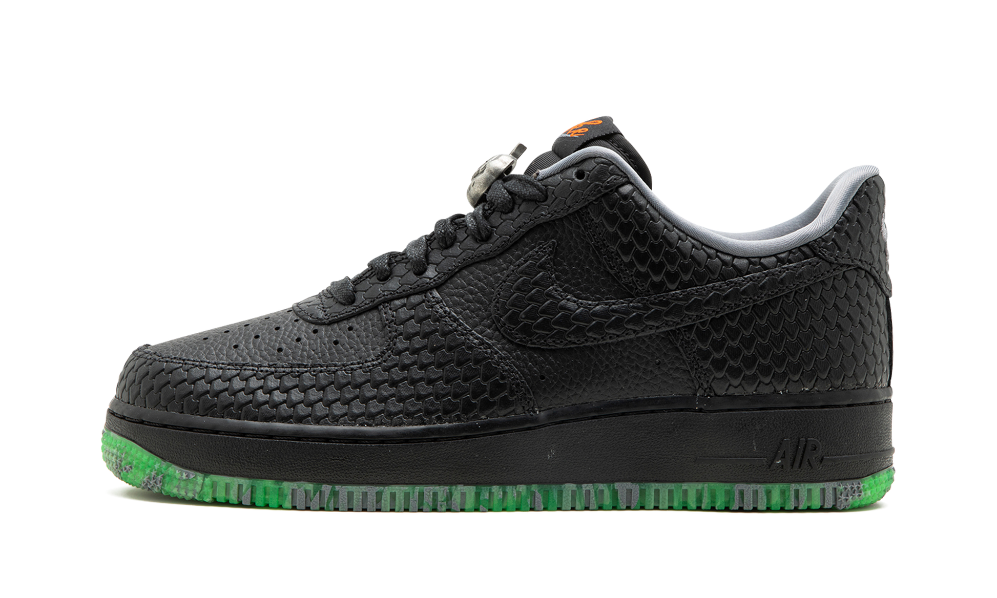 The Nike Air Force 1 Low "Halloween" is a colorway of the old school basketball shoe with a spooky theme celebrating Halloween 2023. Featuring an all-black appearance. the “Halloweenâ€?Air Force 1 Low has a black tumbled leather base with tonal snakeskin-inspired leather overlays and Swoosh branding. A jack-o-lantern-inspired lace dubrae ties into the sneaker's spooky look. The black painted rubber midsole is paired with a smoky translucent rubber outsole with green streaks.