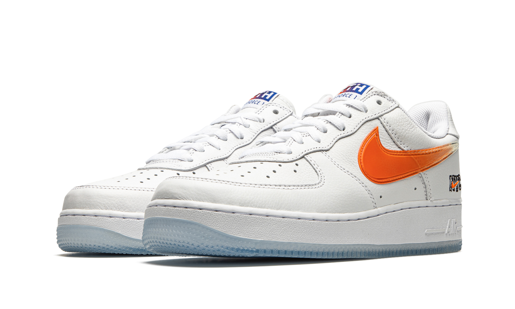 The Kith x Nike Air Force 1 Low “NYC Homeâ€?is one of two colorways from the collaboration between Ronnie Fieg's sneaker boutique and Nike made exclusively for the basketball-inspired “Home and Awayâ€?collection. The white based “Homeâ€?version of Kith's Air Force 1 Low nods to the shop's home. New York City. and more specifically. the New York Knicks. for inspiration. as the shoe features the team's uniform colors on its design. The white tumbled leather upper is contrasted by an orange jeweled Swoosh on either side and old school “NYCâ€?with an orange Swoosh branding hit on the lateral side of the heel. A “Kith Airâ€?logo with a Swoosh is embroidered on the heel. The detailing is a play on the Air Force 1's original “Nike Airâ€?branding. A gradient orange-to-blue “Kith Air Force 1â€?insignia appears on the tongue tag. Release date: December 25. 2021