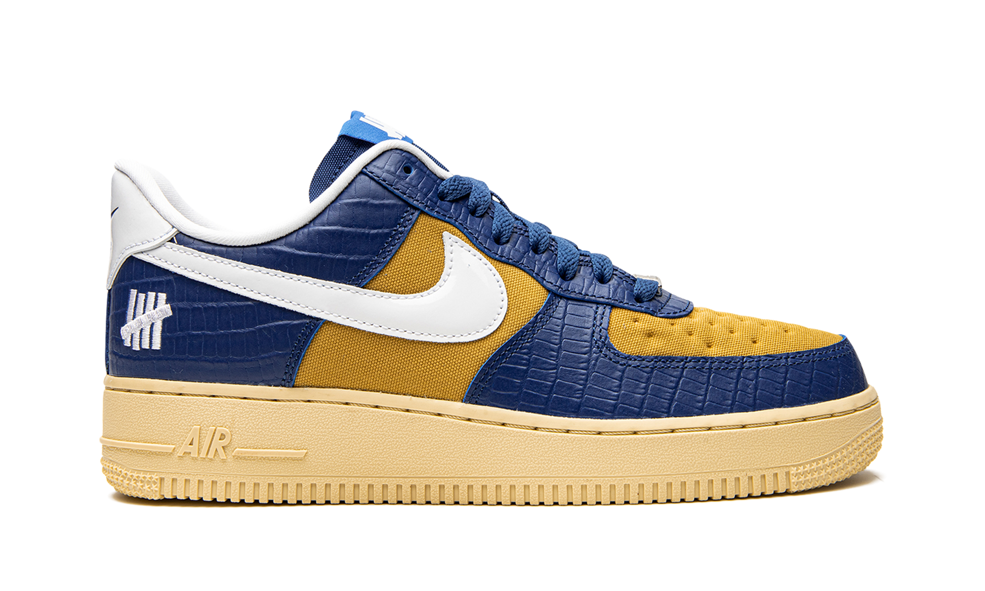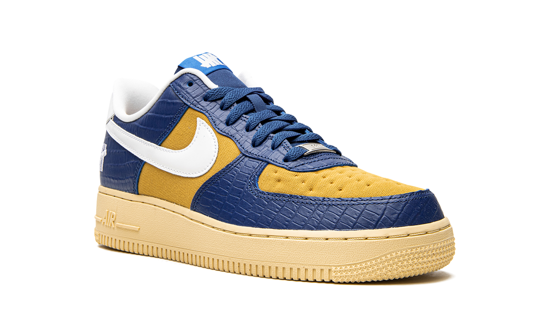 The Undefeated x Nike Air Force 1 Low “Blue Crocâ€?is a September 2021 collaboration between the California based sneaker boutique and Nike on the retro low-top shoe. From Undefeated and Nike's third series of collaborations in 2021. the “Blue Crocâ€?edition of the Air Force 1 Low features a combination of materials on its upper. including a mustard yellow canvas base with contrasting blue faux crocodile leather on the overlays. A white leather Swoosh is found on either side and Undefeated's signature â€? Strikesâ€?logo is embroidered on the lateral side of the heel. Blue “Nike Airâ€?with a Swoosh detailing appears on the white leather heel tab and Undefeated's â€? Strikesâ€?logo can be found on the tongue tag. The shoe sits atop a vintage-inspired oxidized rubber sole. Release date: September 8. 2021