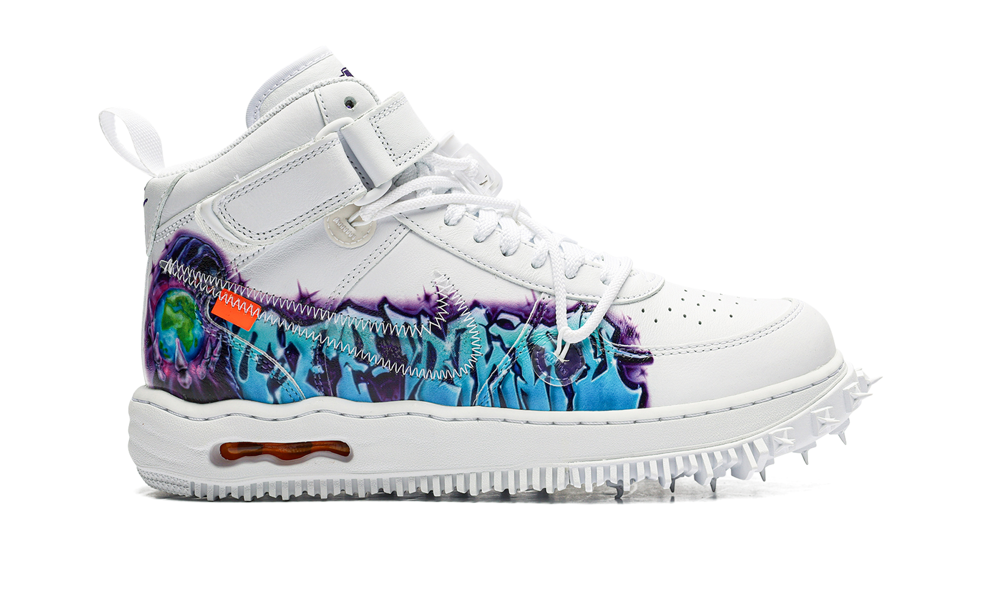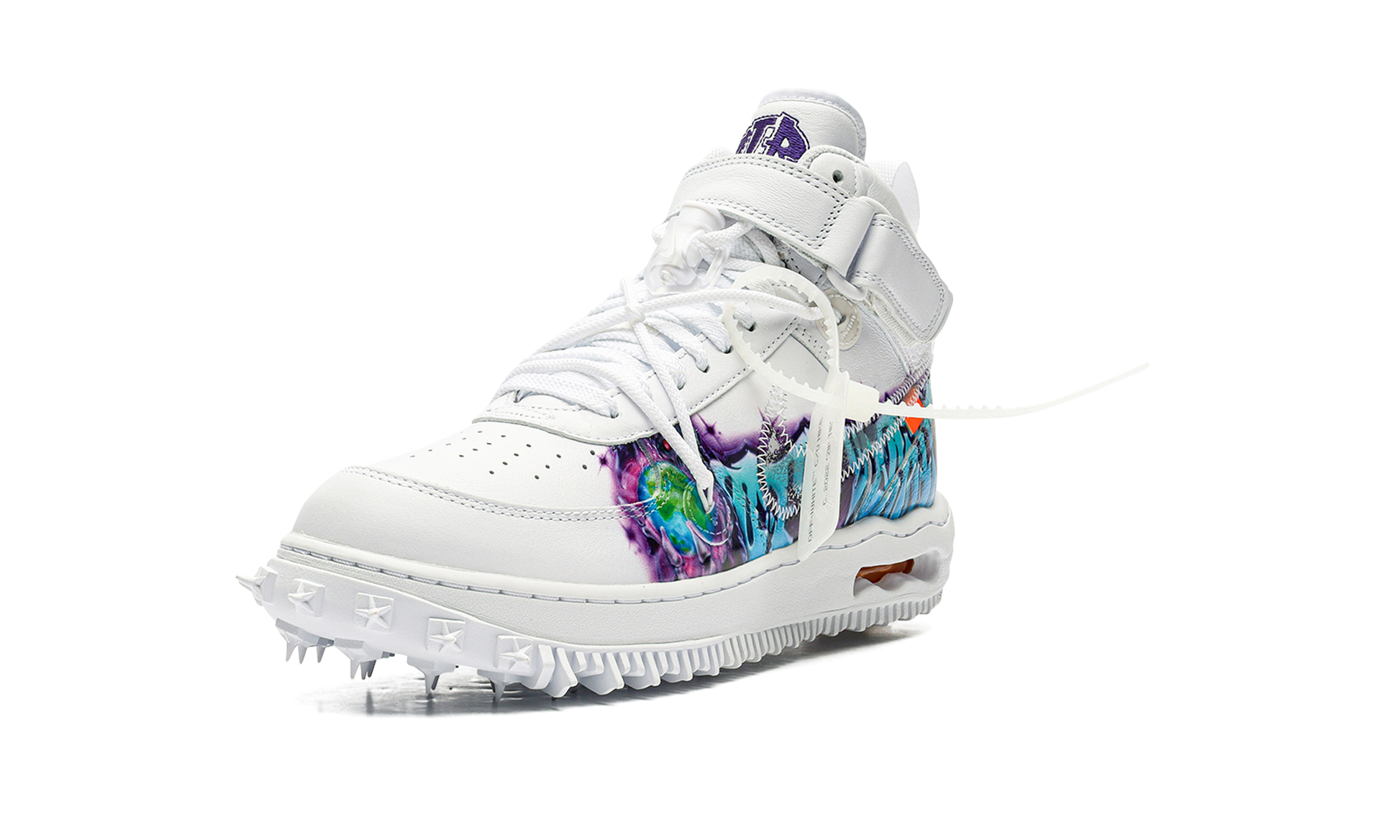 The Off-White x Nike Air Force 1 Mid “Graffitiâ€?is a collaboration by the late Virgil Abloh's clothing brand on a colorway of the retro basketball shoe with graffiti detailing. Designed similarly to the colorways found in Abloh's Louis Vuitton x Nike Air Force 1 “Graffitiâ€?collection. the Air Force 1 Mid of the same name features a white leather construction with tonal leather overlays and colorful graffiti print on the lateral side. An industrial-style “Off-Whiteâ€?logo appears on the medial side of the shoe. A bungee cord-like lacing system appears on the shoe in addition to the traditional lacing setup. Underfoot. the midsole features a wavy effect on the heel and rubber spikes are found on the bottom of the shoe. Release date: June 22. 2023