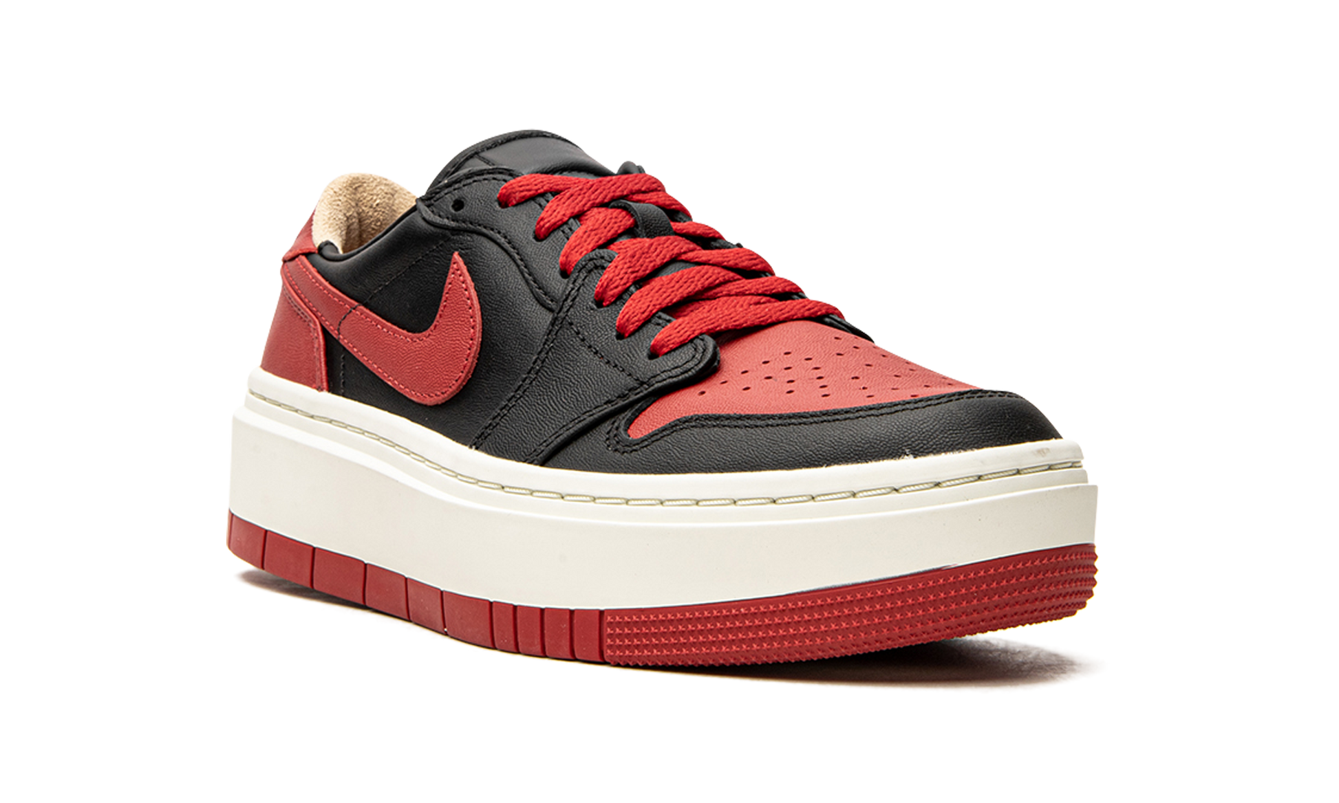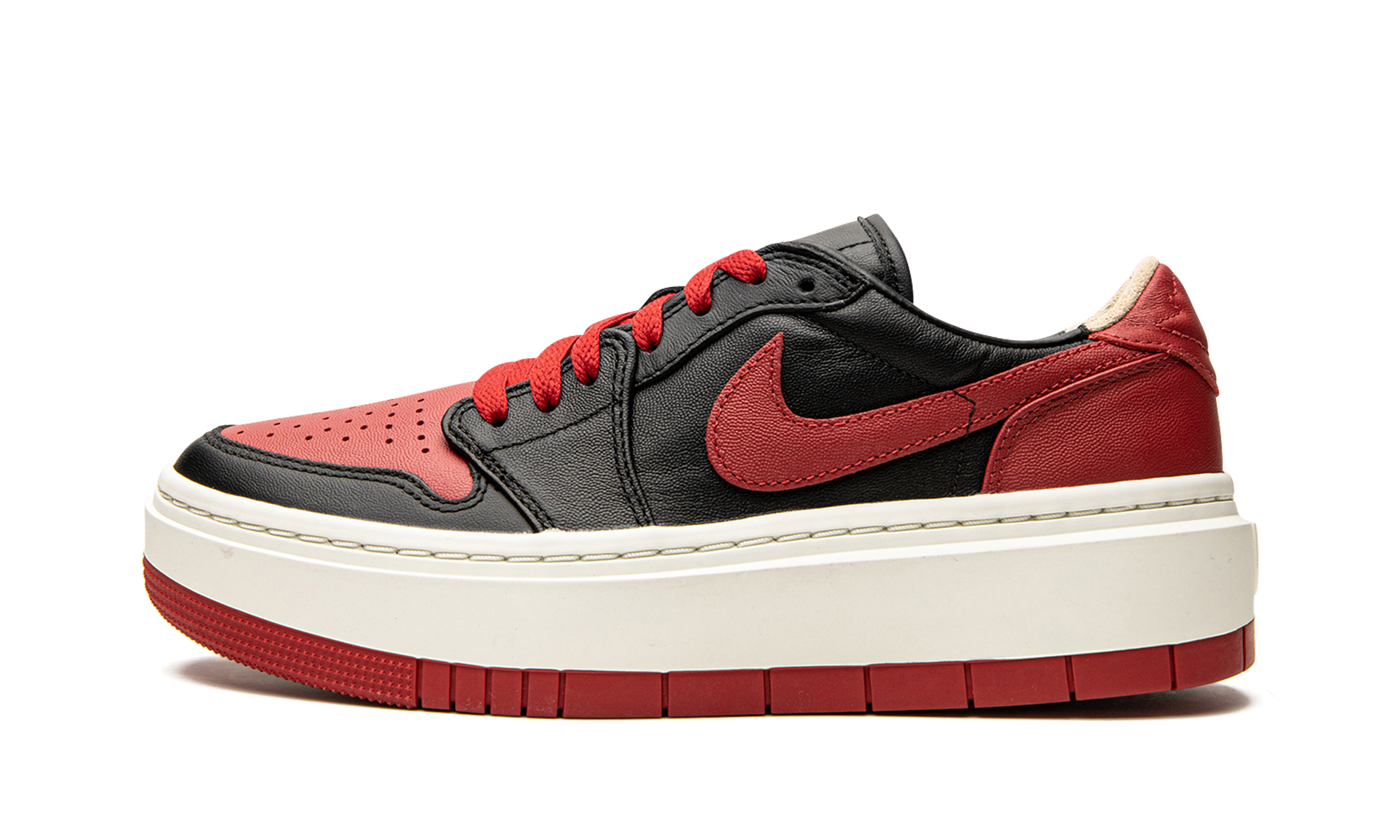 The Women's Air Jordan 1 Elevate Low “Bredâ€?is a women's-exclusive version of the legendary retro basketball shoe that modifies its appearance with an exaggerated. platform-style sole. The Jordan 1 Elevate Low features an oversized. cream-colored rubber sole that adds significant height to the wearer. In spite of its dramatic look. the rest of the shoe remains somewhat consistent with the Jordan 1 Low OG model. The perforated toe. heel. and Swoosh are designed in Varsity Red leather. Black leather on the forefoot. eyelets. and mid-panel contrast the red panels. On the heel. a “bubbleâ€?style “Wingsâ€?outline replaces the shoe's standard Air Jordan graphic. and a Jumpman logo is found on the heel of the sole.