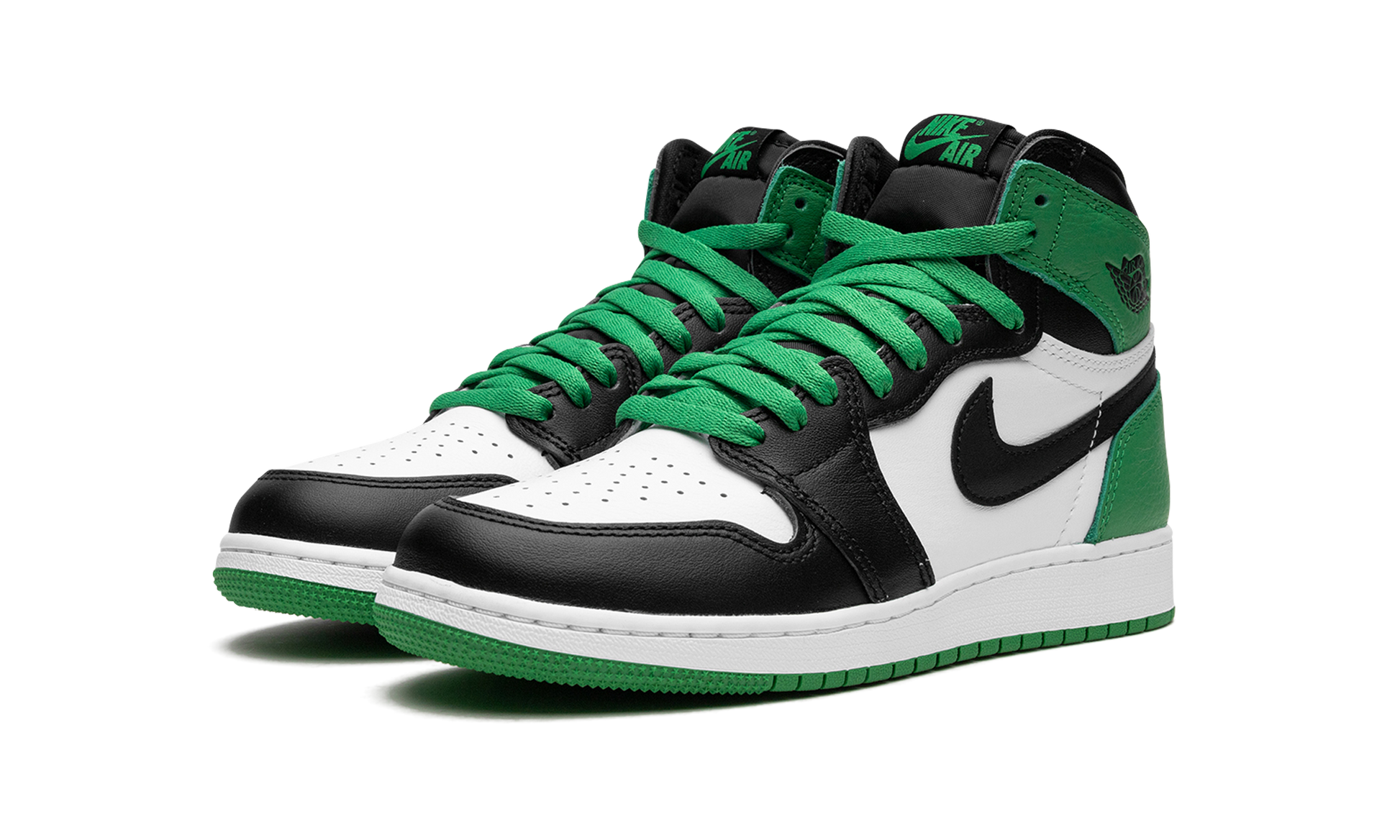 The Air Jordan 1 High GS “Lucky Greenâ€?is the youth sizing of the colorway of the vintage basketball and lifestyle shoe that is inspired by the popular “Celticsâ€?style from 2009's “Defining Moments Pack.â€?Although not a one-to-one remake of the Air Jordan 1's “Celticsâ€?colorway from the aforementioned collection. the “Lucky Greenâ€?is nonetheless similar to the design. The shoe features a white leather base with contrasting black leather overlays on the toe cap. forefoot. and eyelets. Lucky-Green-colored leather appears on the heel and on the collar. A black leather Swoosh is found on either side of the shoe. Like the “Celticsâ€?Jordan 1 from 2009. the “Lucky Greenâ€?features green laces. Where the shoes differ. though. is on the tongue. The “Lucky Greenâ€?has “Nike Airâ€?branding whereas the “Celticsâ€?colorway dons a Jumpman logo. Release date: April 15. 2023
