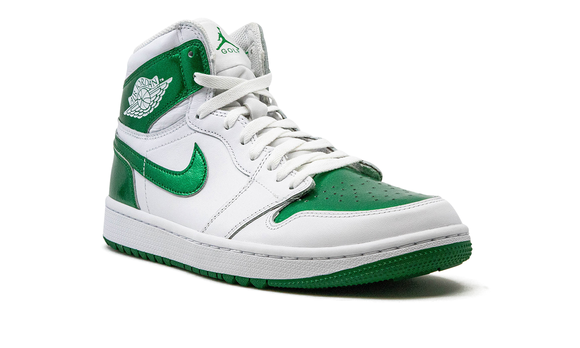 The Air Jordan 1 High Golf "Metallic Green" is an alternate version of the classic basketball sneaker designed for golf in a can't-miss colorway. The Jordan 1 High Golf mimics the styling of the standard Air Jordan 1 High OG model. but with subtle updates made specifically for the fairway. The “Metallic Greenâ€?colorway features a white leather construction. save for flashy Metallic Green leather on the perforated toe. collar. heel. and Swoosh. A classic “Wingsâ€?logo appears on the collar while green Jumpman and “Golfâ€?branding are found on the tongue tag. Underfoot. the “Metallic Greenâ€?Jordan 1 High Golf features small nubs on the outsole that provide traction on a golf course. Release date: April 28. 2023