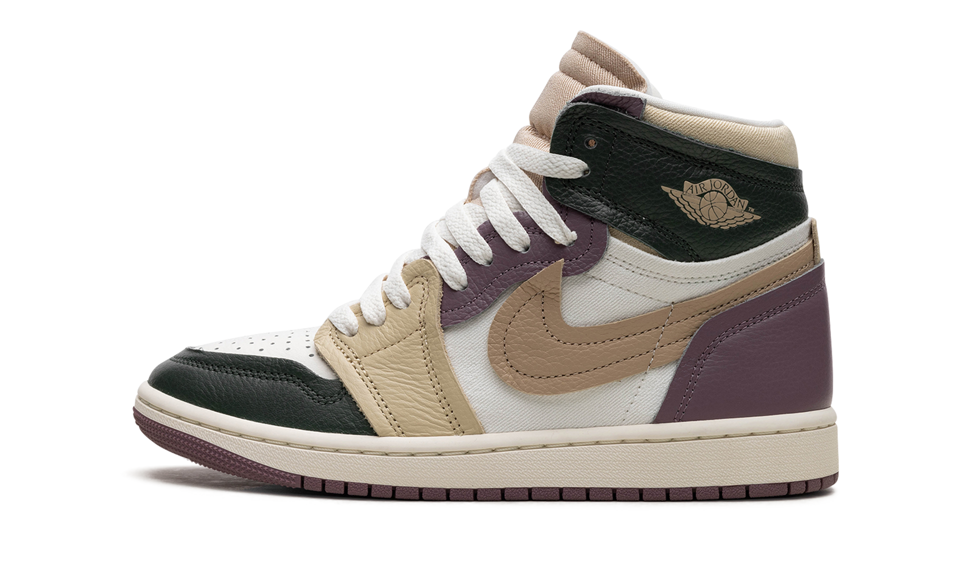 The Women's Air Jordan 1 High MM "Galactic Jade" is the women's sizing of the alternate version of the retro basketball shoe with a layered aesthetic. Designed in a unique combination of leather and canvas. the shoe also has layered and raised overlay panels that give the design a head-turning look. The upper features a Sail leather base with a dark green leather toe cap and dark green collar. a tan raised leather forefoot panel. and raised purple eyelet and heel panels. A raised tan leather Swoosh appears on both sides. A “Wingsâ€?logo is seen on the collar. Release date: November 2. 2023