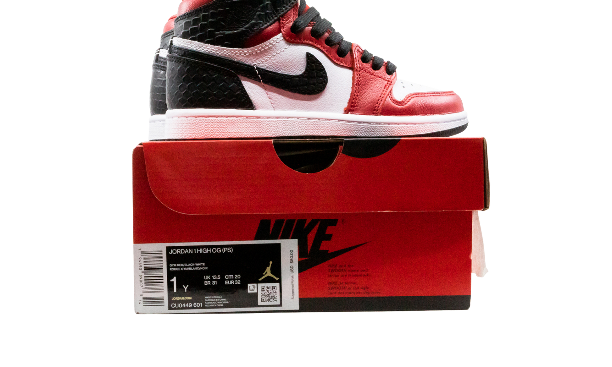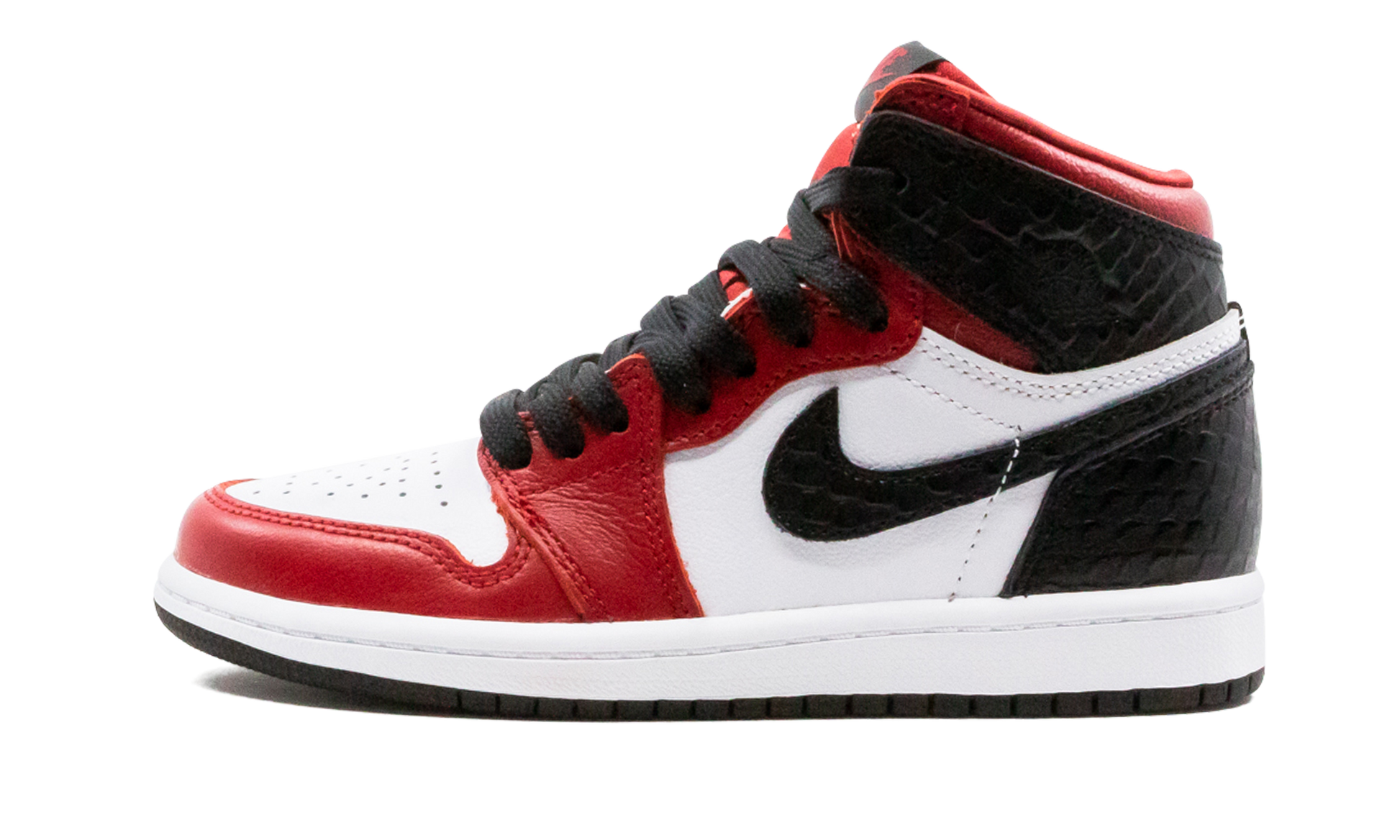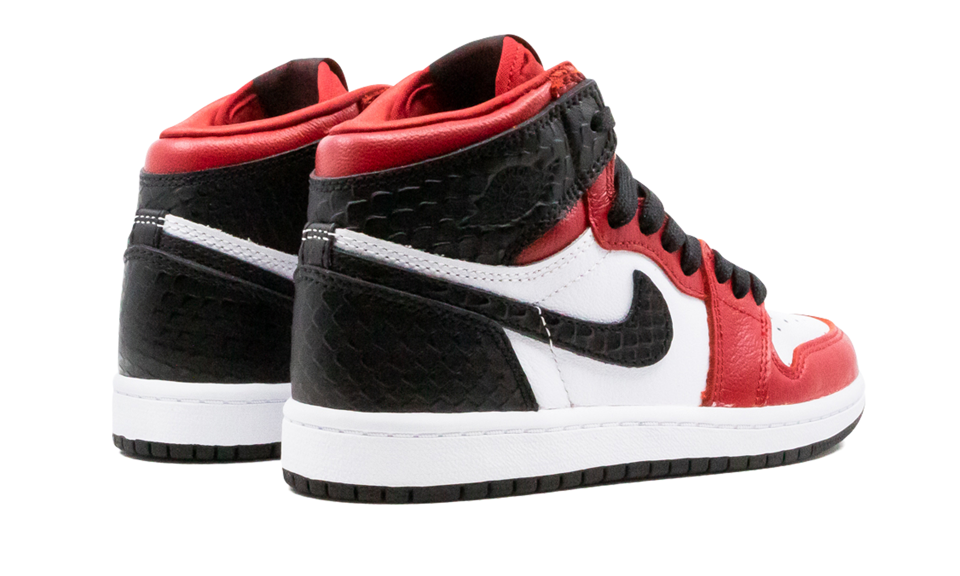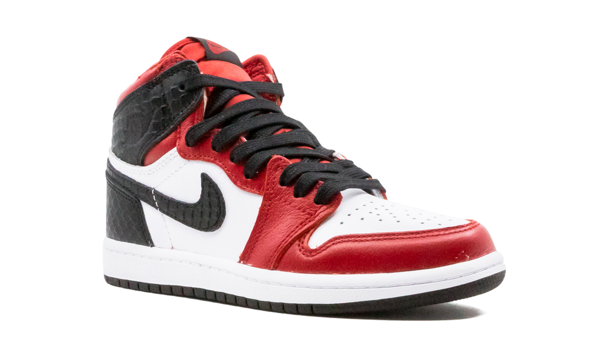 The Air Jordan 1 PS “Satin Snakeâ€?is the preschool sizing of the reptilian colorway of Michael Jordan's first signature shoe. Based on the “Chicagoâ€?design. the “Satin Snakeâ€?explores a new approach to casual lifestyle aesthetics by replacing the traditional leather panels of the previously mentioned colorway in favor of luxurious faux snakeskin. The upper displays a color block close to the original “Chicago.â€?as white leather can be found on mid-panel and perforated toe. Contrasting red leather overlays appear on the forefoot. eyelets. and collar. A black snakeskin leather covers the Swoosh. ankle collar. and heel. Jordan Brand opts with red satin for both the tongue and inner lining. This upscale Jordan 1 for preschoolers is finished off with black waxed cotton laces for a rather opulent look. The Air Jordan 1 PS “Satin Snakeâ€?was released on August 6. 2020.
