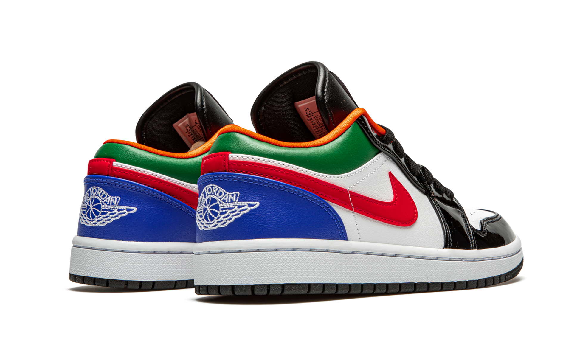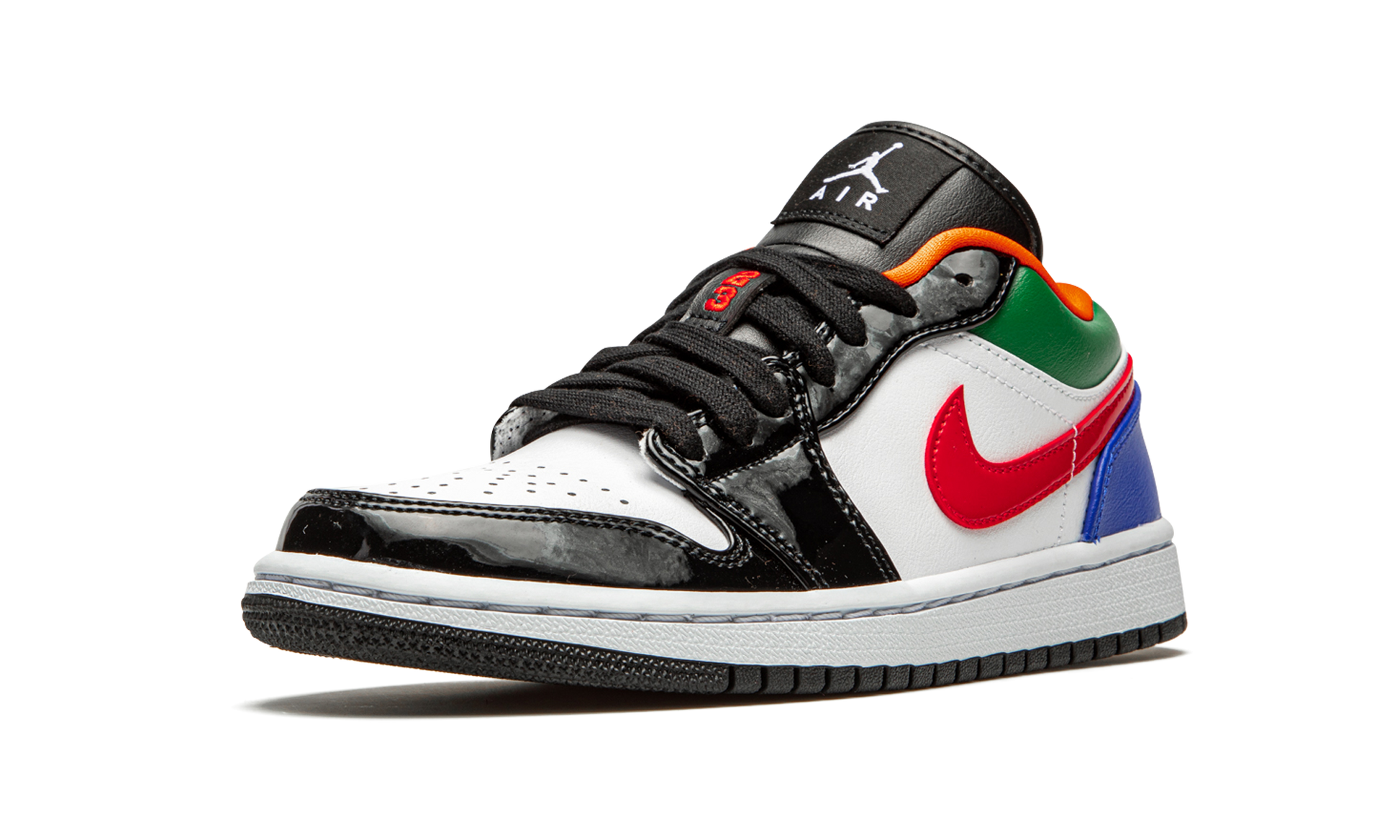 Turn heads with the Air Jordan 1 Low SE WMNS "Multi-Color." This captivating Special Edition low-top brings bold energy to the classic silhouette with a vibrant. mismatched color scheme. Featuring glossy patent leather panels in White. Hyper Royal. and Green. this sneaker is a modern twist on the 1985 original. The durable upper and encapsulated Air-Sole unit ensure comfortable. all-day wear while showcasing an unforgettable. maximalist aesthetic.