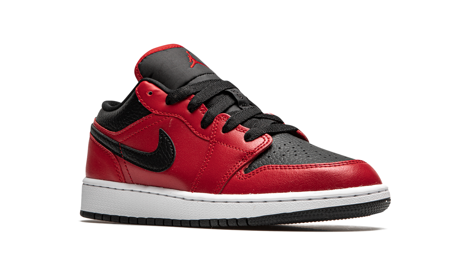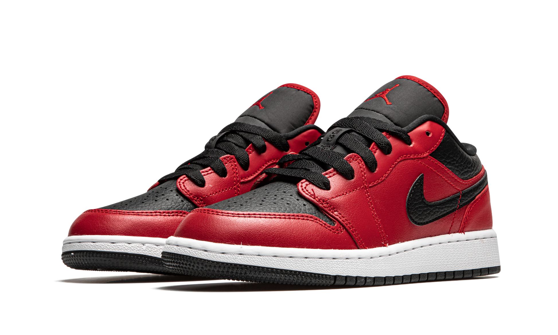 The Air Jordan 1 Low GS “Reverse Bredâ€?is the youth sizing of Michael Jordan's first signature shoe that mimics the color block of an original colorway of the model. During Michael's rookie season. he wore a pair of black-and-red Nike Air Ships that were outlawed by the NBA because they violated the league's uniform policy at the time. The same Chicago Bulls based design would eventually end up on the Air Jordan 1 that Michael also wore. which inspires this Jordan 1 Low. The look of the “Reverse Bredâ€?flips the OG “Bredâ€?by featuring Gym Red leather detailing on the forefoot. mid-panel. eyestay. and heel. Black leather appears on the perforated toe and on the collar and Swoosh detailing on either side of the shoe. A black embroidered “Wingsâ€?emblem is on the heel and a red Jumpman is stitched onto the black nylon tongue.