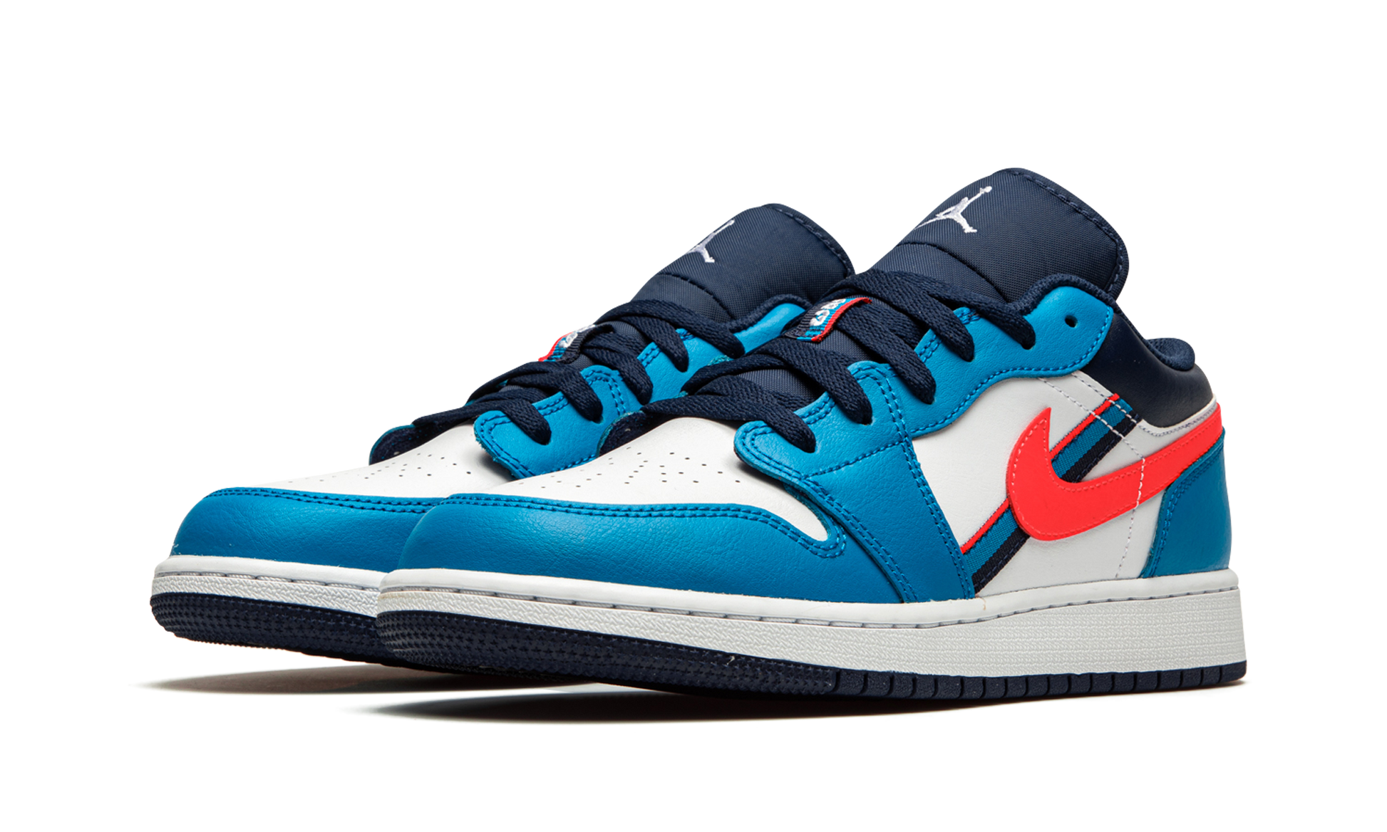 The Air Jordan 1 Low GS “Game Timeâ€?is the youth sizing of Michael Jordan's first signature shoe in the desirable low-top silhouette. Outfitted in a colorful design that kids will enjoy wearing to school or anywhere else for that matter. the “Game Timeâ€?is an intriguing option for the versatile Air Jordan 1. The upper features smooth white leather on the perforated toe and mid-panel. Blue Orbit leather overlays on the forefoot. eyelets. and heel contrast the neutral look. The same holds true for the Flash Crimson leather Swoosh located on either side. Navy blue leather appears around the collar. and tricolor nylon stripe embroidery can be found on the mid-panel.