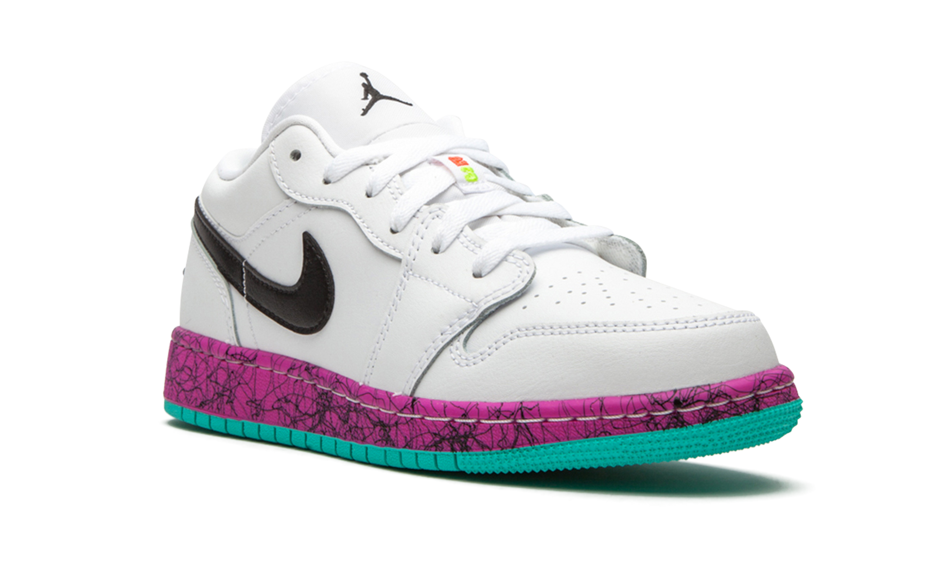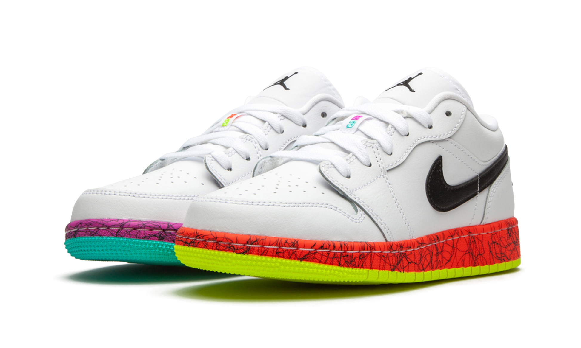 The Air Jordan 1 Low GS “Gradesâ€?is the youth sizing of Michael Jordan's first signature shoe in a distinctly '90s-style colorway. The low-top Jordan 1 is one of the most popular shoes in the Jordan lineup. and this “Gradesâ€?look. complete with neon orange. yellow. turquoise. and pink accenting is certainly no exception to the statement. A black leather Swoosh appears on either side of the shoe and black “Wingsâ€?embroidery can be found on the heel. The rest of the upper is outfitted in crisp white leather for an ultra versatile look. Elsewhere. black Jumpman detailing is stitched onto the white nylon tongue and contrasting â€?3â€?embroidery can be found on the lace overlay. An orange midsole with black swirls and a neon green outsole highlight the look of the left shoe. The right shoe features a magenta midsole with black swirls and a turquoise outsole.
