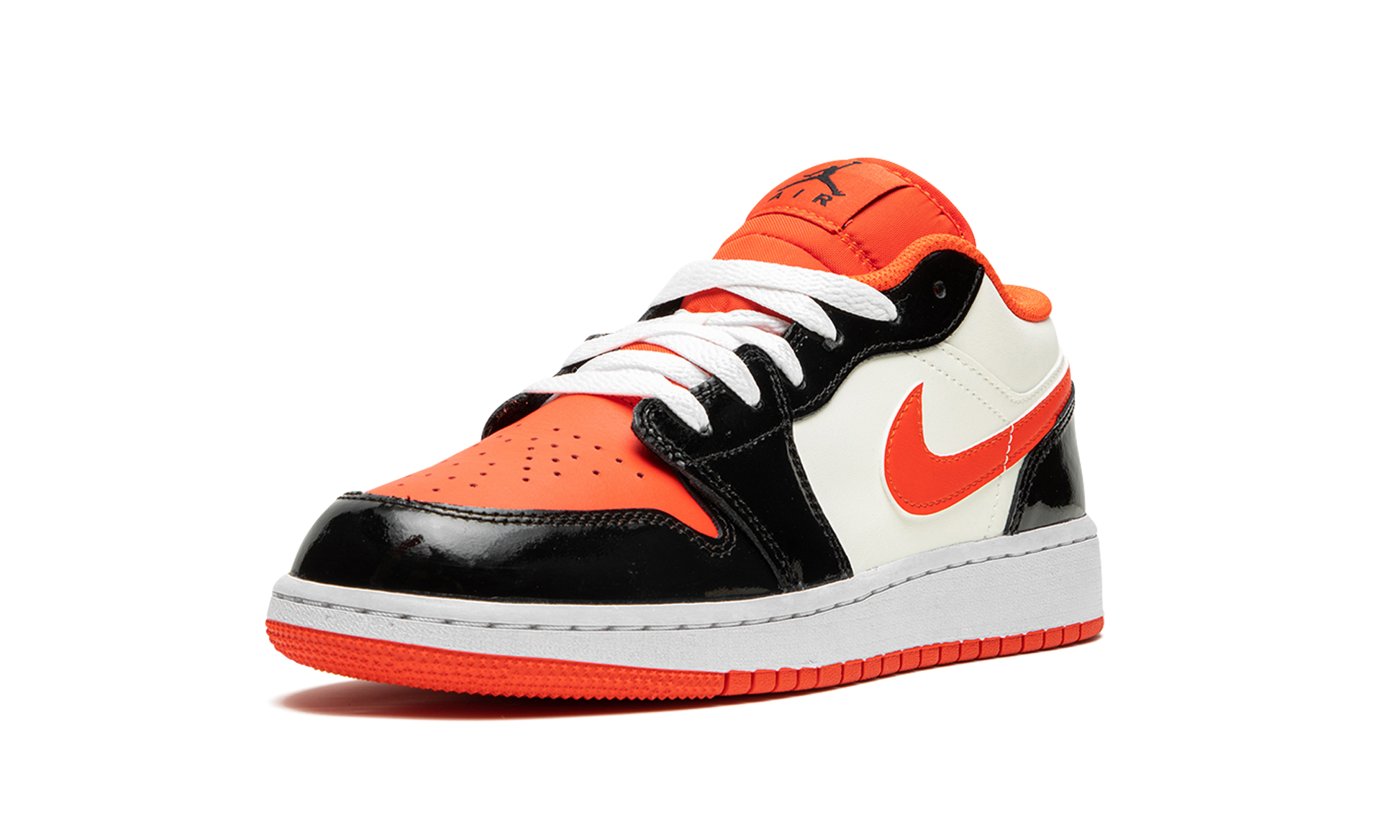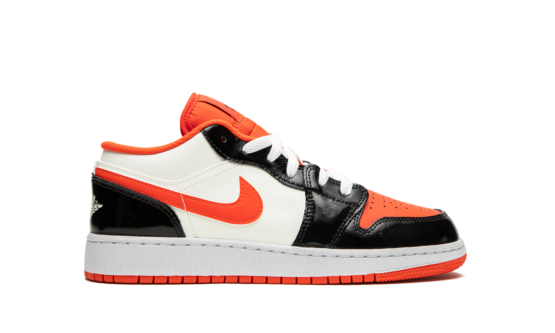 The Air Jordan 1 Low GS “Halloweenâ€?is the youth sizing of the retro basketball shoe in a colorway inspired by the spooky holiday. The Jordan 1 Low GS in the “Halloweenâ€?colorway features a white leather construction with contrasting shiny black leather overlays on the toe cap. forefoot. eyelets. and heel. Team Orange accenting can be found on the perforated leather toe. on the Swoosh. and on the nylon tongue and inner lining. A black Jumpman is paired with a black “Airâ€?logo on the tongue tag. A “Wingsâ€?detail appears on the heel.