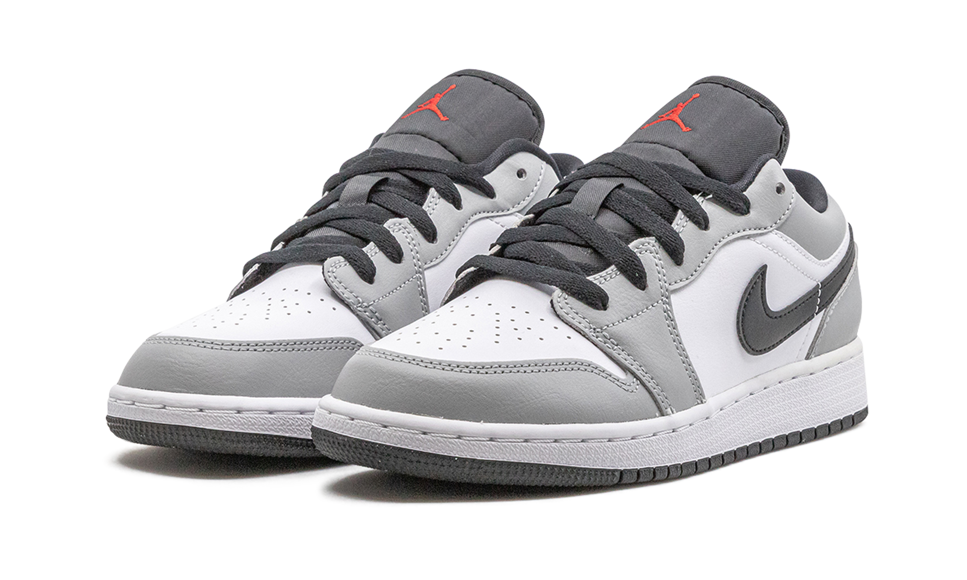 The Air Jordan 1 Low GS “Light Smoke Greyâ€?is the youth sizing of Michael Jordan's first signature shoe in a neutral based look for a timeless appeal. Like its adult-sized counterpart. the Jordan 1 Low “Light Smoke Greyâ€?for kids incorporates white and grey leather panels for endless wearability. Smooth white leather graces the perforated toe and mid-panel. Contrasting Light Smoke Grey leather overlays on the forefoot. eyelets. collar. and heel balance the subdued design. A black leather Swoosh can be found on either side of the shoe and a red embroidered “Wingsâ€?logo is stitched onto the heel. Additional design elements include a black nylon tongue with red Jumpman branding. black laces. and a white midsole that is contrasted by a black outsole.