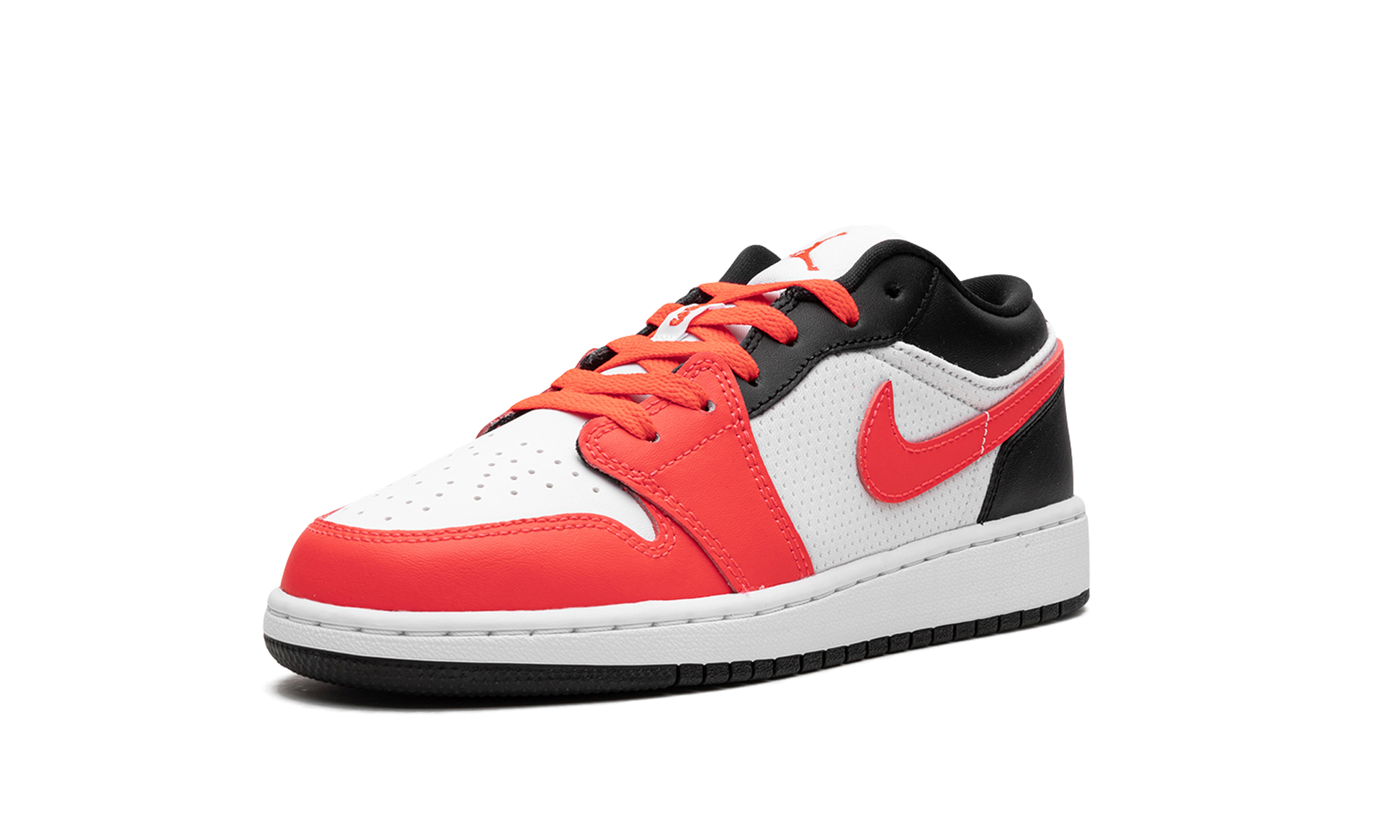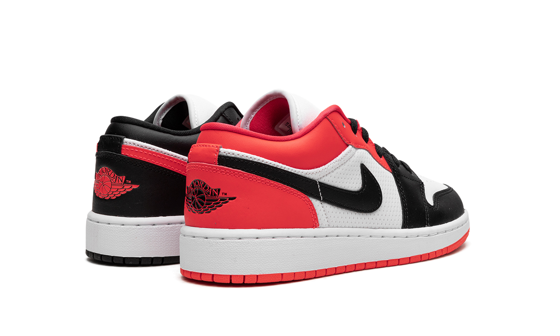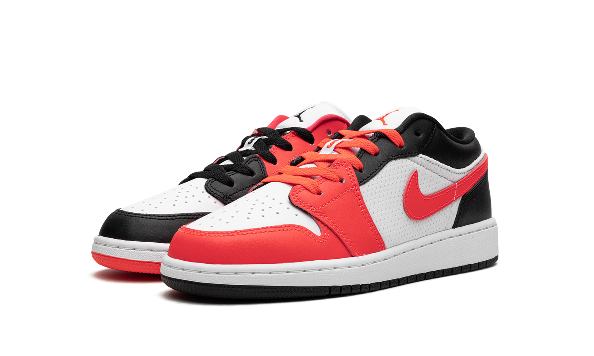 The Air Jordan 1 Low GS “Mismatch Chicagoâ€?is a colorful look for the youth sizing of the low-top Jordan 1 with a mismatched color block inspired by Michael Jordan's time with the Chicago Bulls. The “Mismatch Chicagoâ€?puts a unique spin on the popular “Chicagoâ€?Jordan 1 theme with a mismatched color pattern highlighted by Infrared instead of a more traditional shade of red usually associated with the Chicago Bulls team colors. The shoe features a white base with smooth leather on the perforated toe and mesh material on the sides. Hues of Infrared and black leather are found on the toe cap. forefoot. and eyelet panels. Mismatched Infared and black leather Swooshes appear on both sides of the left and right shoe. as well.