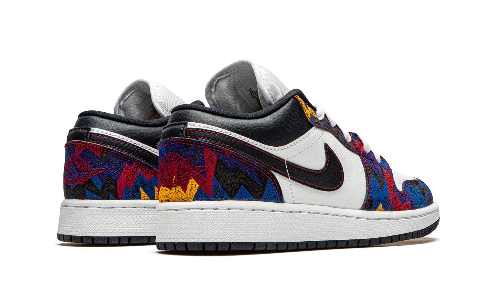 The Air Jordan 1 Low GS “Nothing But Netâ€?is the youth sizing of the colorway the salutes the funky multicolor shirt worn by Michael Jordan during media appearances for the 1992 Summer Olympics. Also appearing in a 1993 Super Bowl commercial. the shirt in question is rife with '90s nostalgia. just like this shoe. The upper utilizes the shirt's patterning on the forefoot. eyelets. and heel. The look is balanced out by white leather detailing on the perforated toe and mid-panel. A black leather Swoosh with red outlining is located on the mid-panel. Additional black leather can be found around the collar. Finishing touches for this Jordan 1 in youth sizing include a white nylon tongue with red Jumpman branding. red â€?3â€?detailing on the lace shroud. and an embroidered “Wingsâ€?logo on the heel. Release date: Summer 2020.