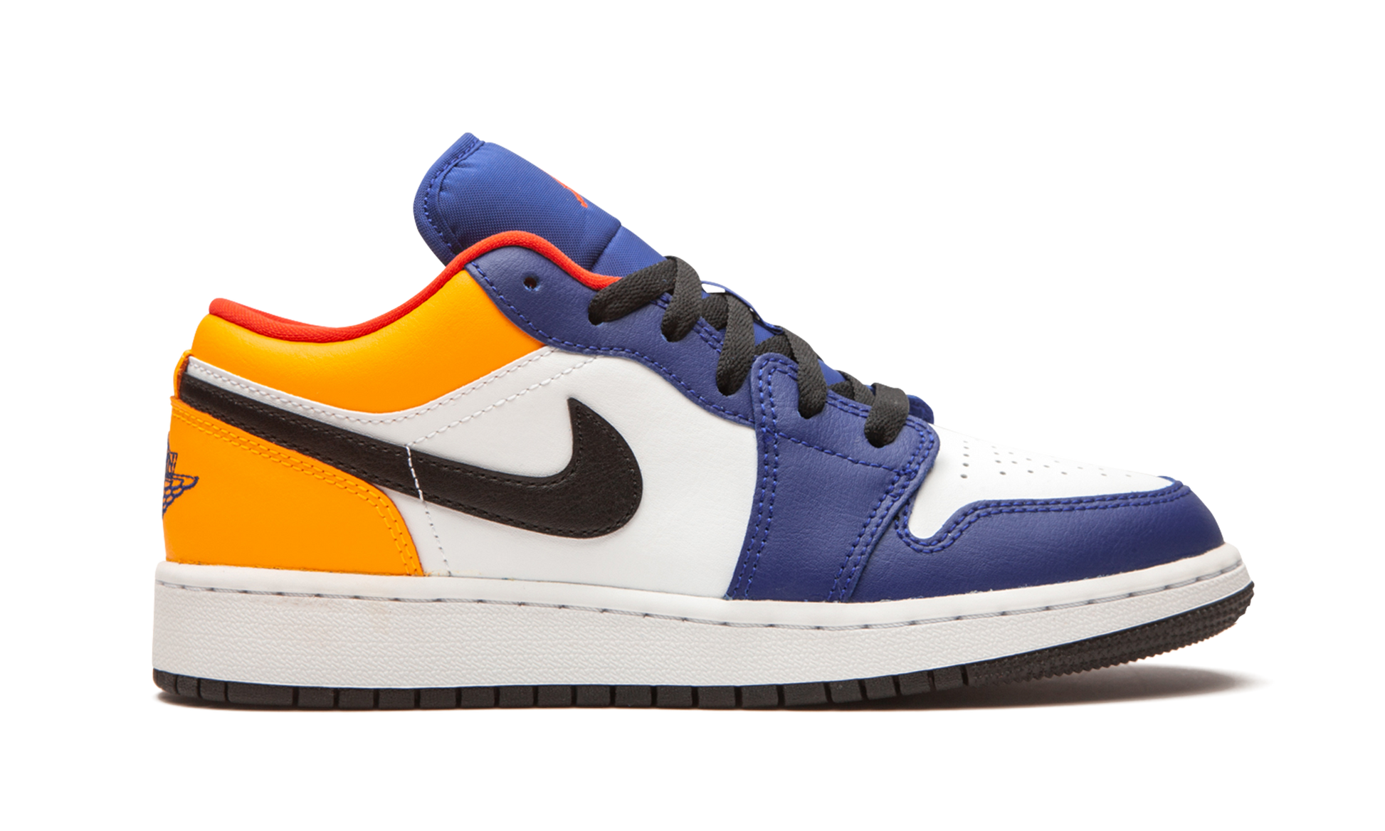 The Air Jordan 1 Low GS “Royal/Yellowâ€?is a multicolor take on Michael Jordan's first signature shoe fitted in youth sizing. Appearing on the alternate low-top Jordan 1. the “Royal/Yellowâ€?design is the kind of bold shoe that kids enjoy wearing. The upper features white leather on the perforated toe and mid-panel. Royal leather overlays on the forefoot and eyelets break up the neutral appearance. Jordan Brand opts for yellow leather around the collar and heel. A black leather Swoosh dots the mid-panel. and blue “Wingsâ€?embroidery is sewn onto the heel. Red Jumpman insignia is located on the blue nylon tongue. Black shoelaces. a red liner. and white midsole finish off the look of this Air Jordan 1 Low in youth sizing.