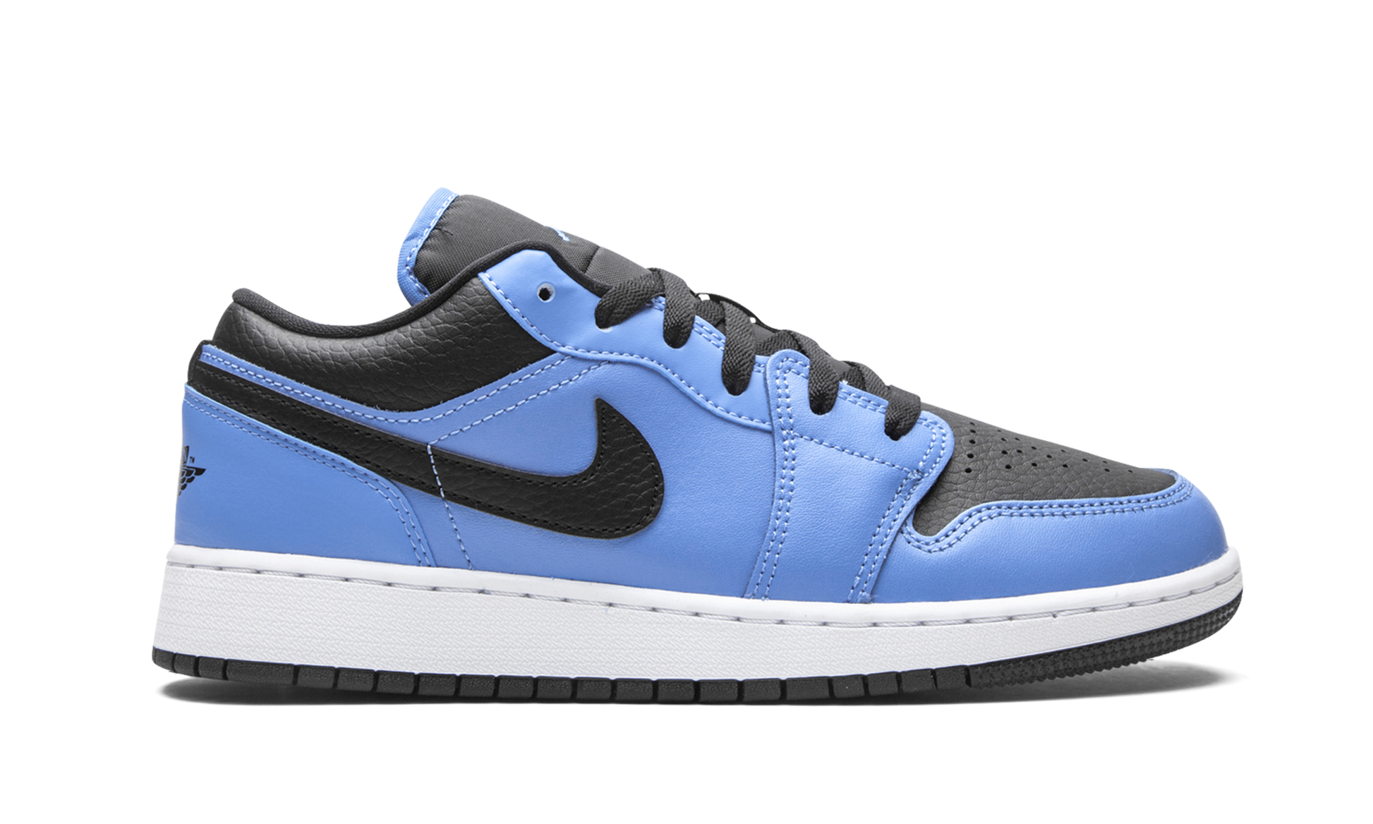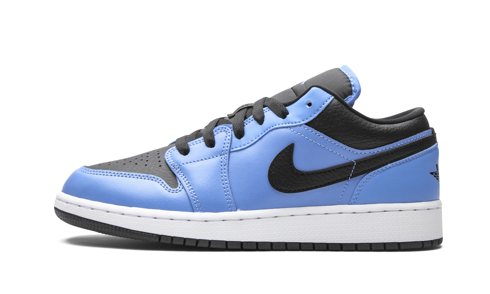 The Air Jordan 1 Low GS “University Blue/Blackâ€?is the youth sizing of Michael Jordan's first signature shoe in a colorway that pays homage to the UNC Tar Heels. Unofficially linked to “The GOAT'sâ€?alma mater. the “University Blue/Blackâ€?nonetheless features the school's team uniform colors on its design for yet another covetable Tar Heel inspired Air Jordan shoe. Details include University Blue leather on the forefoot. eyelets. mid-panel. and heel. Contrasting black leather can be found on the toe and collar and on the Swoosh branding on either side of the shoe. A black “Wingsâ€?logo is embroidered onto the heel and a mini blue Jumpman logo appears on the black nylon tongue to finish off the look.