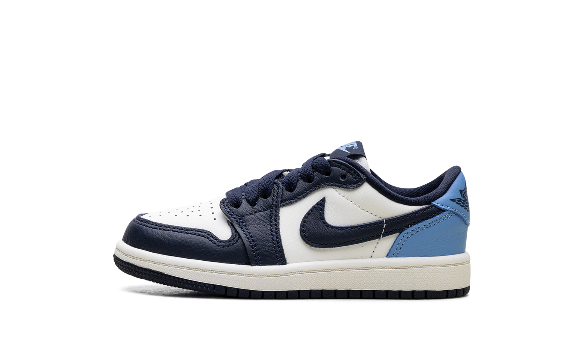 The Air Jordan 1 Low PS "Obisidian" is the preschool version of the 2025 lowtop. The little kids' AJ1 Low OG "Obisidian" has a leather upper that combines shades of navy and light blue with off-white. The lowtop Jordan 1 has a Wings logo on the heel and a navy Swoosh.