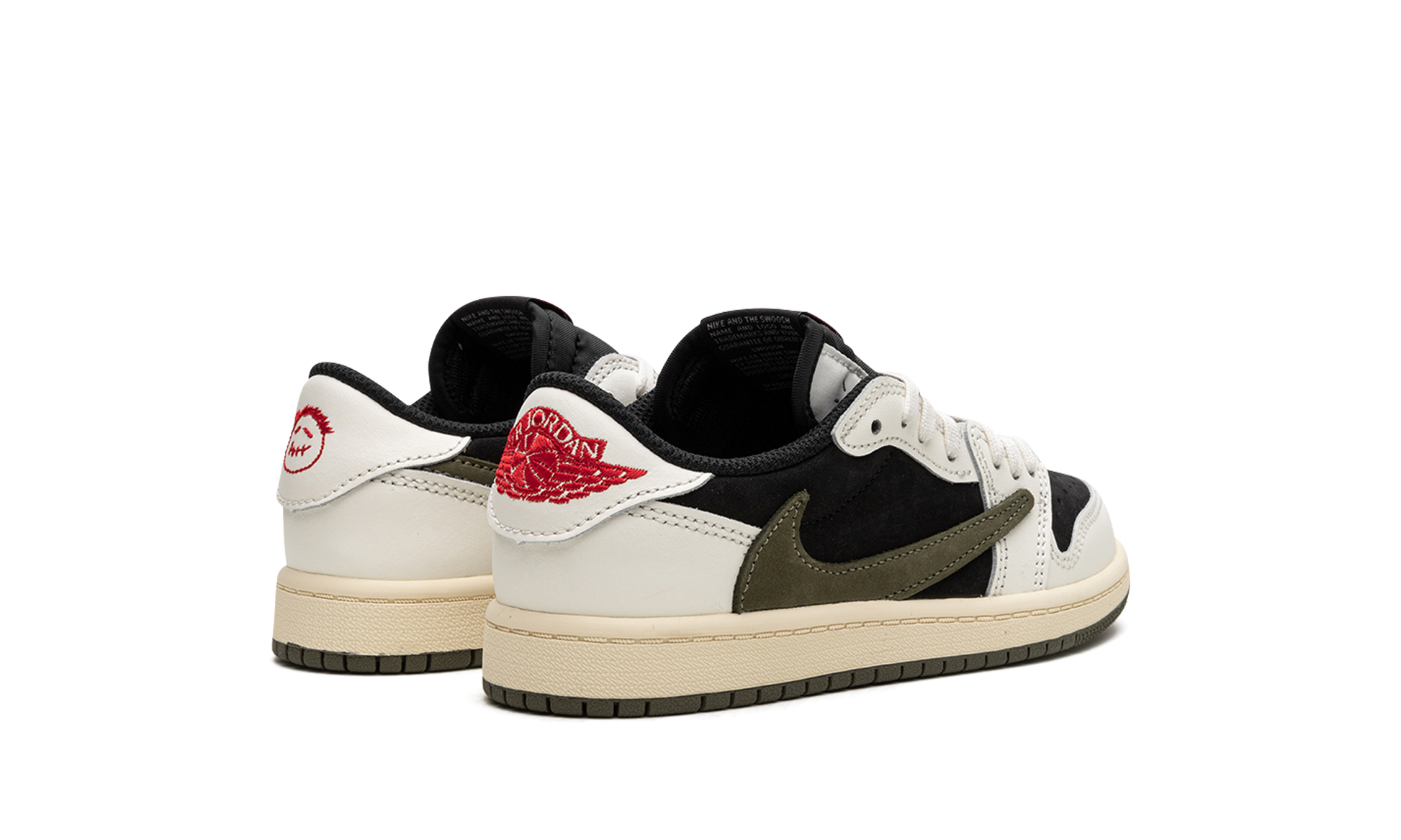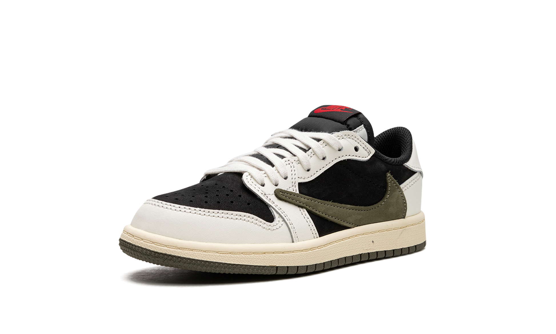 The Travis Scott x Air Jordan 1 Low PS “Olive" is the preschool sizing of the popular collaboration by the hip-hop star on the women's version of the classic sneaker. Travis Scott's Women's Jordan 1 Low “Oliveâ€?succeeds Travis's other desirable Air Jordan 1 collaborations that date back to 2019. The “Oliveâ€?is reminiscent of his Jordan 1 Low “Reverse Mochaâ€?release. in that it features a similar neutral-colored base with contrasting white leather overlays. The “Oliveâ€?features a black base with white leather overlays. An oversized. inverted Olive leather Swoosh appears on each lateral side. Classic red “Nikeâ€?and Swoosh branding is found on the tongue. Travis's signature smiley face is embroidered on the left heel while a “Wingsâ€?logo is embroidered on the right heel.