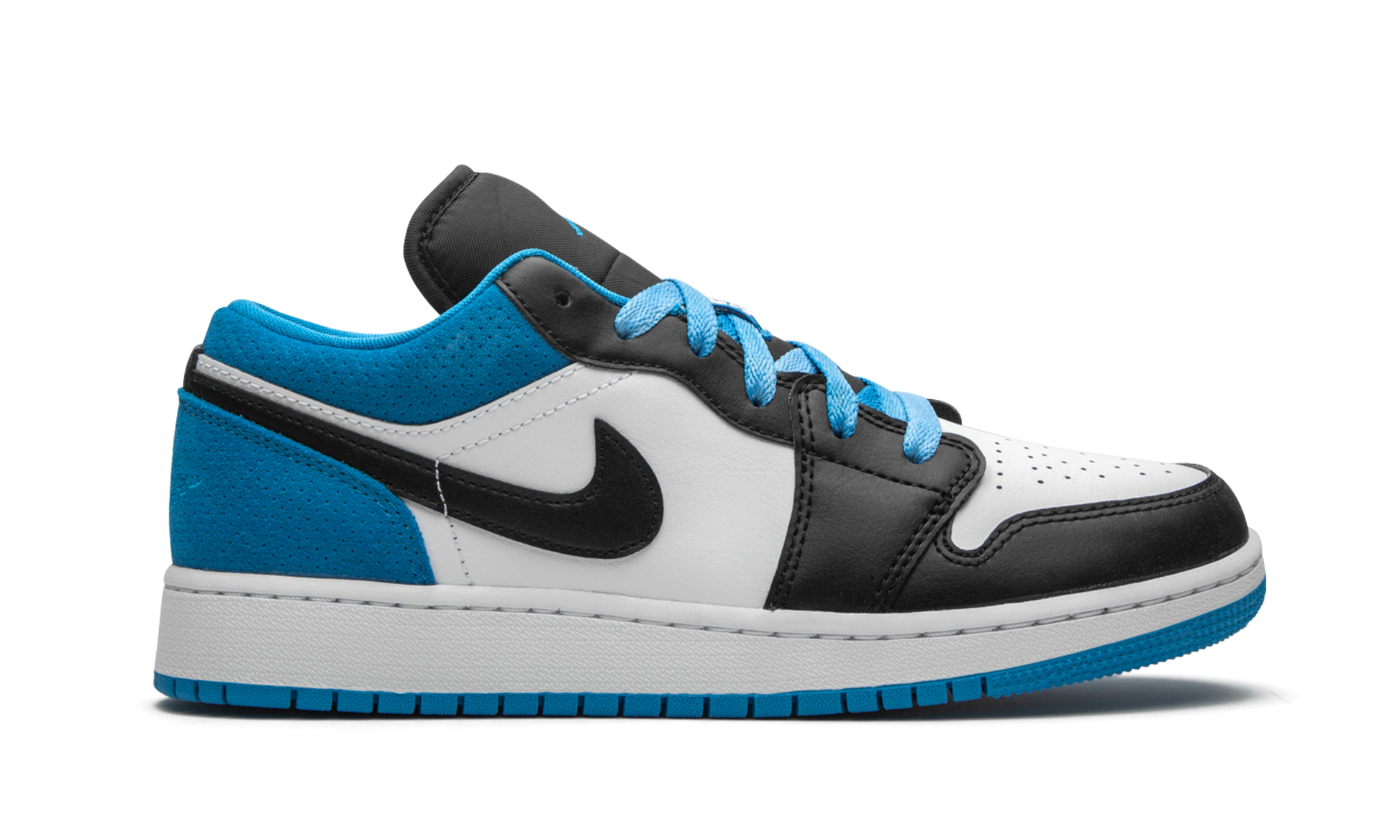 The Air Jordan 1 Low GS “Laser Blueâ€?is the youth sizing of Michael Jordan's first signature shoe in a fresh new design that was released in Summer 2020. Here. the perforated toe and mid-panel are finished off in crisp white leather. Black leather on the forefoot. eyelets. and Swooshes add contrast to the design. Both the ankle collar and heel display a unique dotted Laser Blue suede construction. Tonal “Wingsâ€?branding. blue laces. and a black nylon tongue with â€?3â€?and Jumpman detailing finish off the look of this Jordan 1 built for grade schoolers.