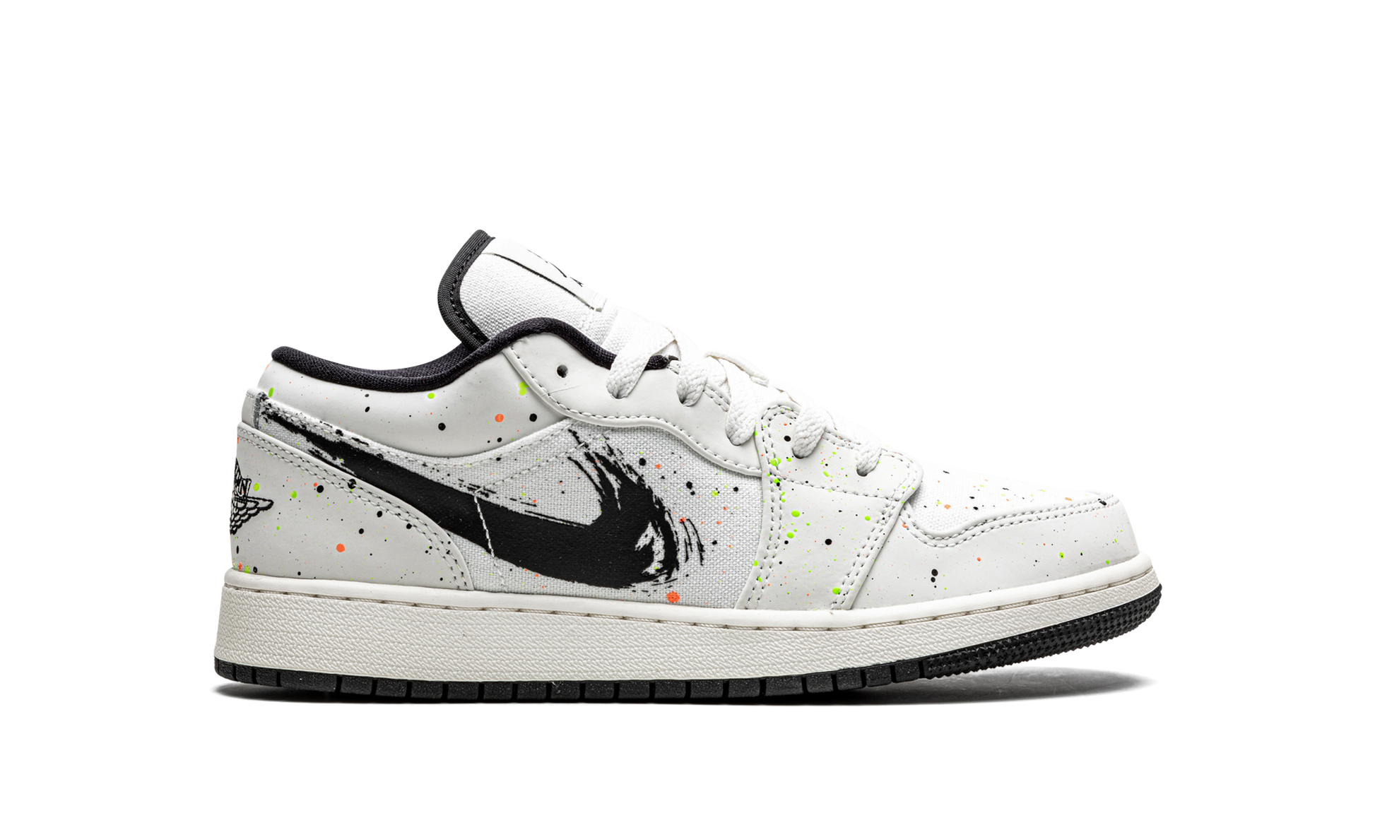 The Air Jordan 1 Low SE GS “Paint Splatterâ€?is the kids sizing of Michael Jordan's first signature shoe in a creative. artist-inspired colorway. Joining Air Jordan 1 makeups like the “Brushstroke.â€?the “Paint Splatterâ€?explores a lifestyle look with multicolor paint splatters across the Sail canvas and leather upper. A black brushstroke-style Swoosh appears on both sides and a black ball-and-wings logo resides on the heel. A black Jumpman with Air branding is located on the tongue tag. Jordan Brand completes the look with a white midsole and black rubber outsole.