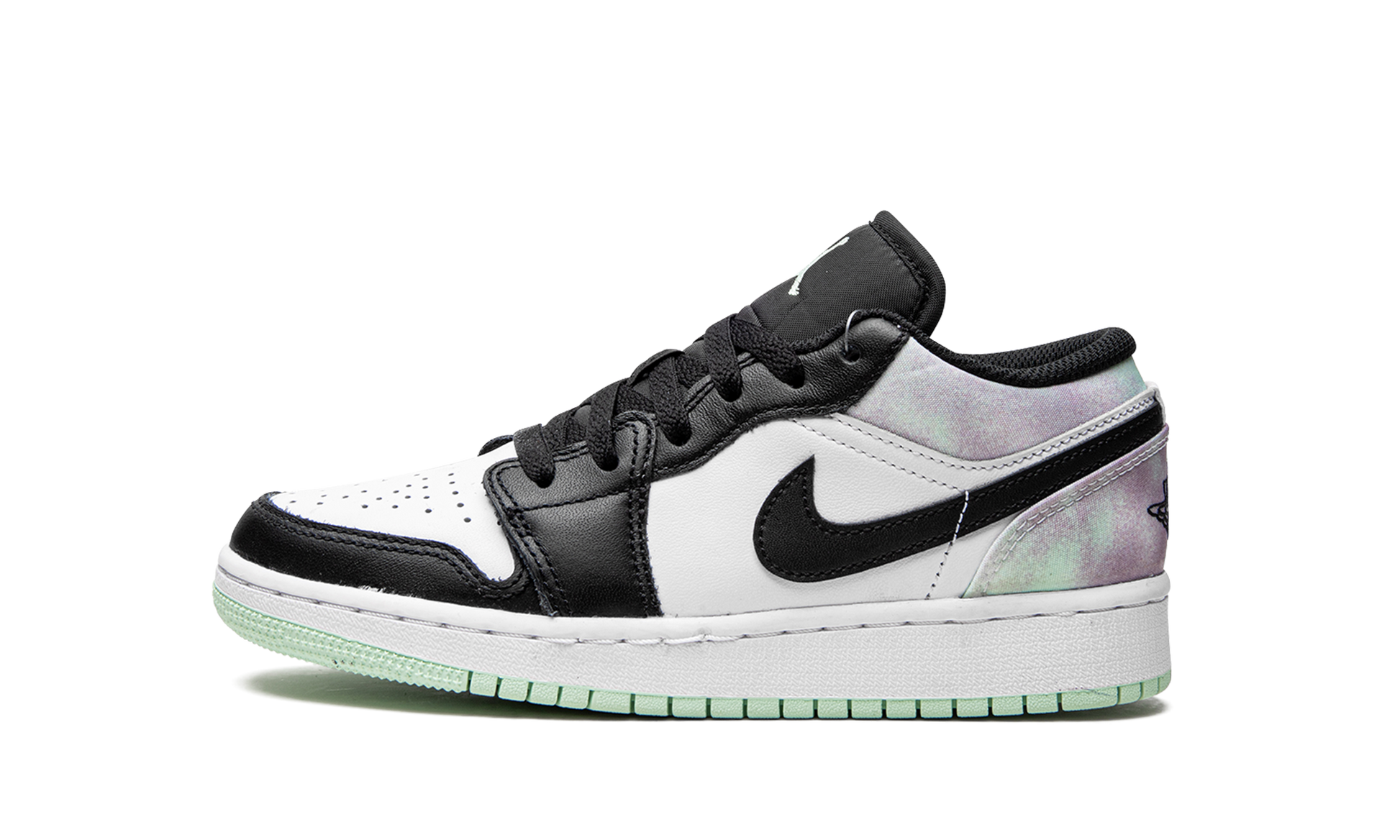 The Air Jordan 1 Low GS “Pastel Tie-Dyeâ€?is the youth sizing of the classic lifestyle sneaker in a colorway that incorporates tie-dye patterning into its look. The “Pastel Tie-Dyeâ€?is a wearable and creative colorway for the Jordan 1 Low that features a white leather base with black leather overlays on the toe. forefoot. and eyelets. Jordan Brand embroiders a black “Wingsâ€?logo on the pastel tie-dye heel overlay. A white Jumpman is found on the black nylon tongue. Finishing touches include black laces. a white midsole. and mint green rubber outsole.