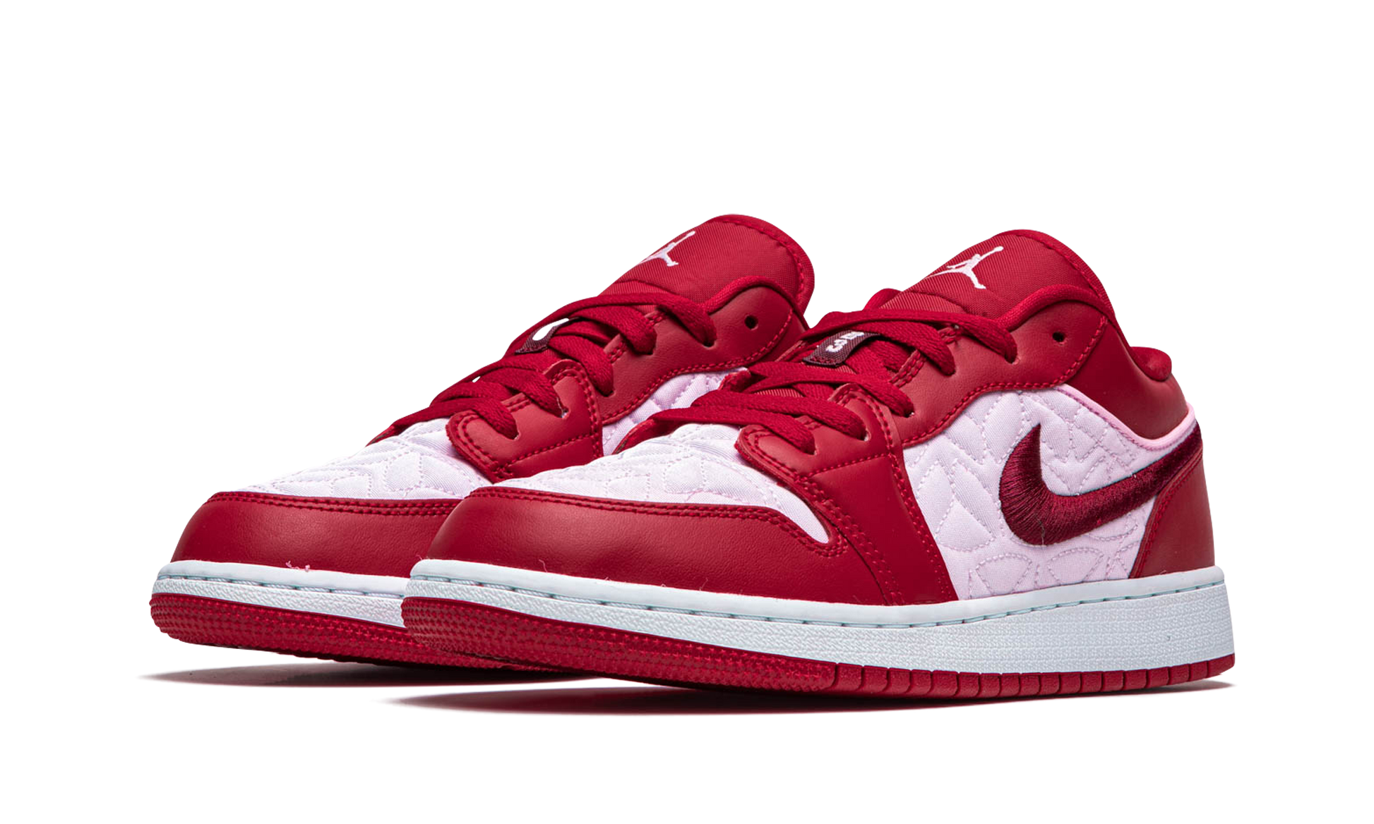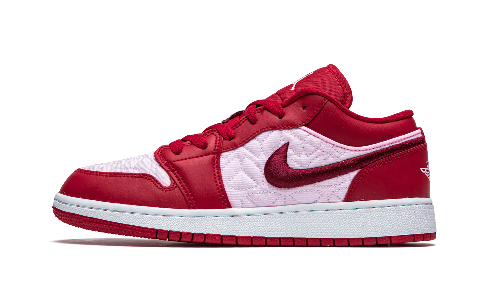 The Air Jordan 1 Low SE GS “Pink Quiltâ€?is a youth version of Michael Jordan's first signature shoe in a unique quilted construction. The Jordan 1 Low has become one of the most popular Air Jordan models for kids in recent years. largely due to the appeal of colorways like the “Pink Quilt.â€?An embroidered Gym Red Swoosh breaks up the look of the pink quilted material found on the mid-panel. The same premium quilted detailing also appears on the toe. Contrasting fire engine red leather panels on the forefoot. eyelets. collar. and heel cut a striking. attention-grabbing vibe. A white embroidered “Wingsâ€?graphic is stitched onto the heel and a white Jumpman logo can be found on the top of the red nylon tongue. Subtle â€?3â€?detailing on the lace overlay completes the look of yet another casual Air Jordan 1 Low for kids.