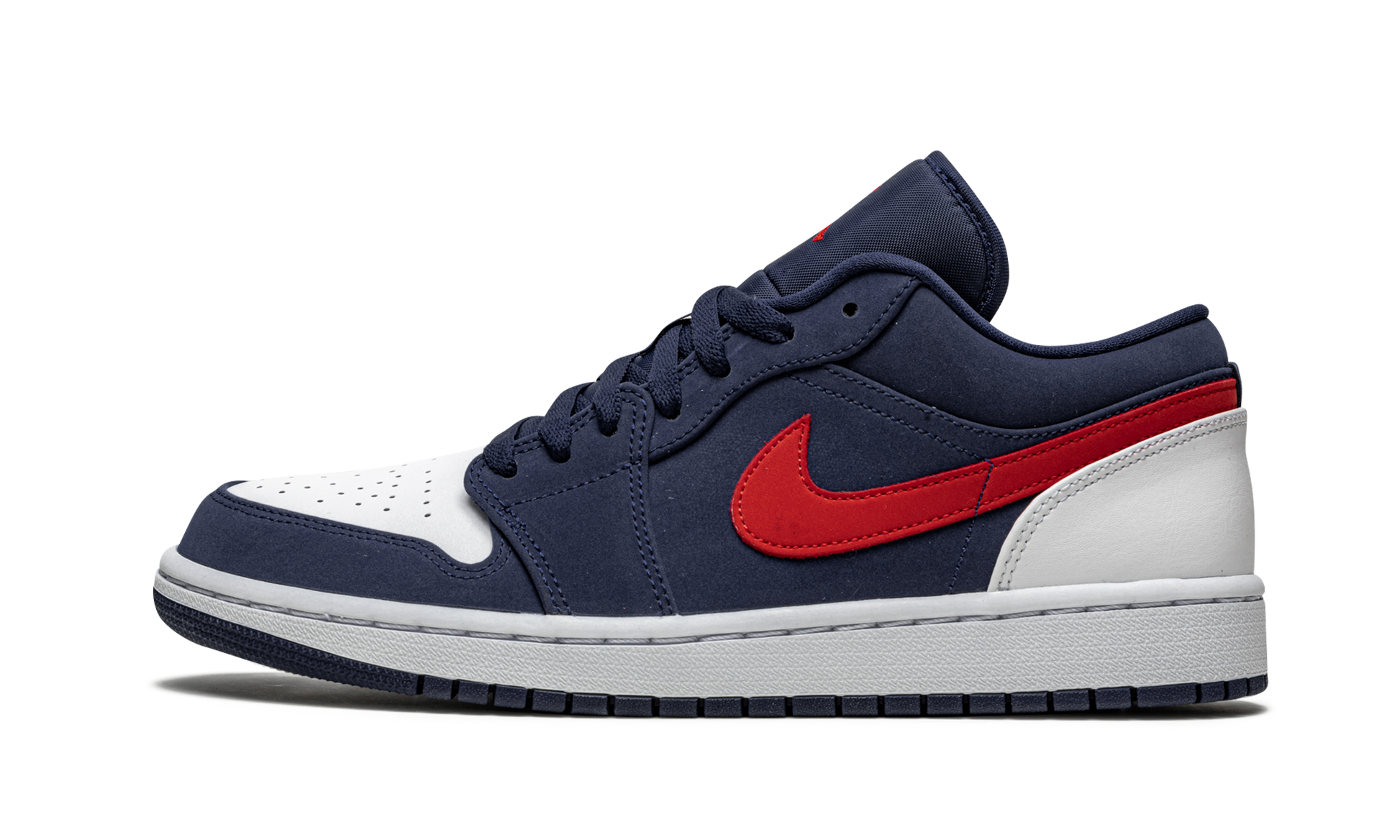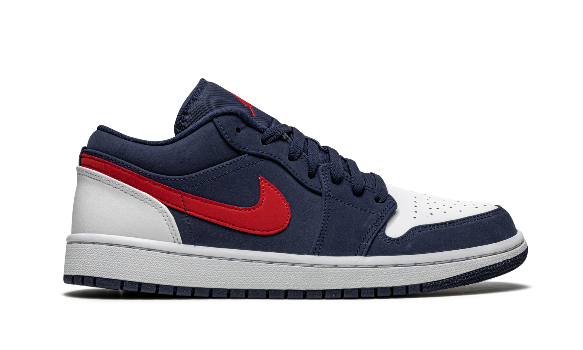 The Air Jordan 1 Low SE “USAâ€?is a patriotic colorway of Michael Jordan's first signature shoe in the popular low-top style. Jordan Brand's dedication to elevating the Jordan 1 Low into the upper echelons of sneaker culture has seen the brand use the model in collaborations with Dior and Travis Scott since 2019. Here. the “USAâ€?adds to the impressive assortment of Jordan 1 Lows by featuring the red. white. and blue color scheme of the American flag. A Midnight Navy suede material appears on the forefoot. mid-panel. collar. and eyelets. The University Red leather Swoosh logo on either side of the shoe breaks up the look. White leather can be found on the perforated toe and on the heel. A red embroidered Jumpman is stitched onto the navy blue nylon tongue. Finishing touches include a white rubber midsole and Midnight Navy outsole.