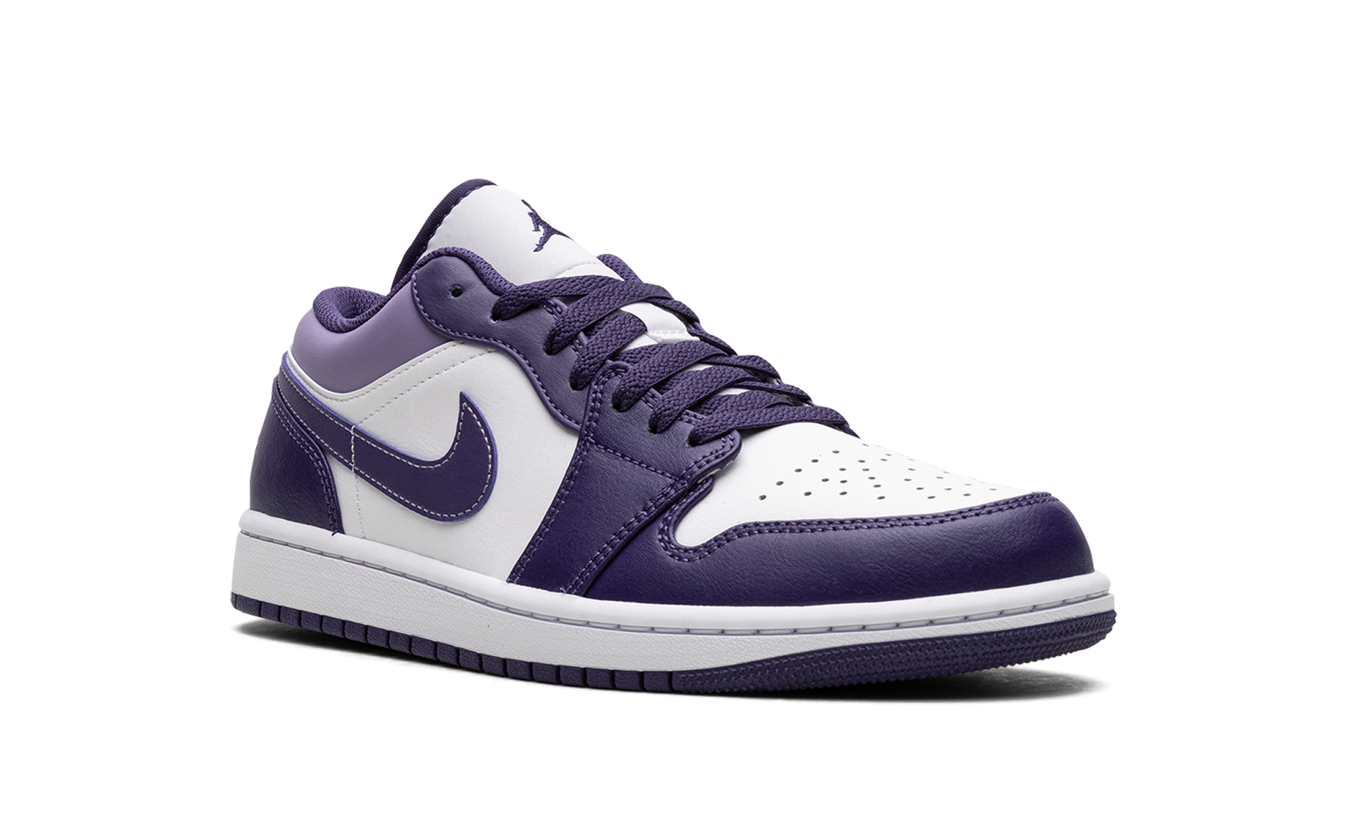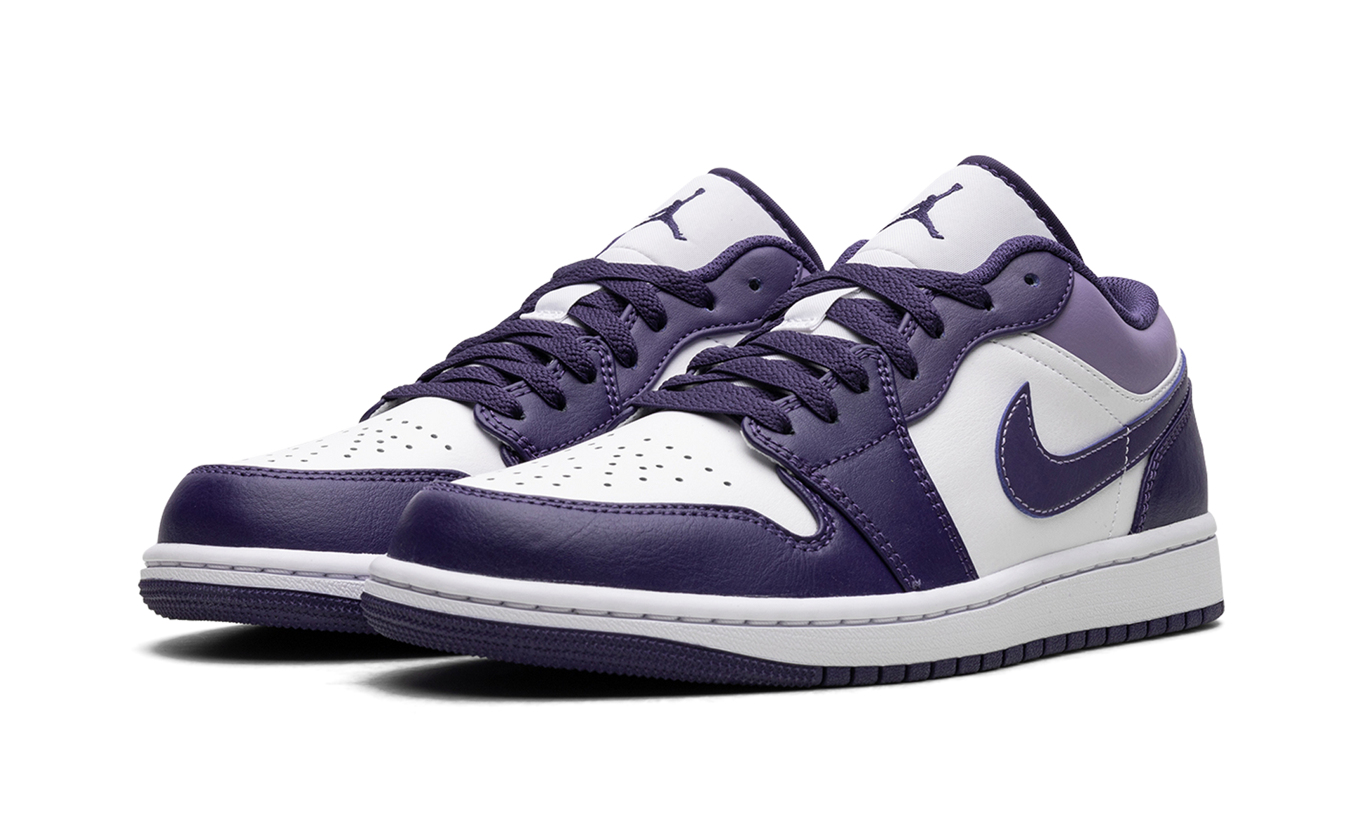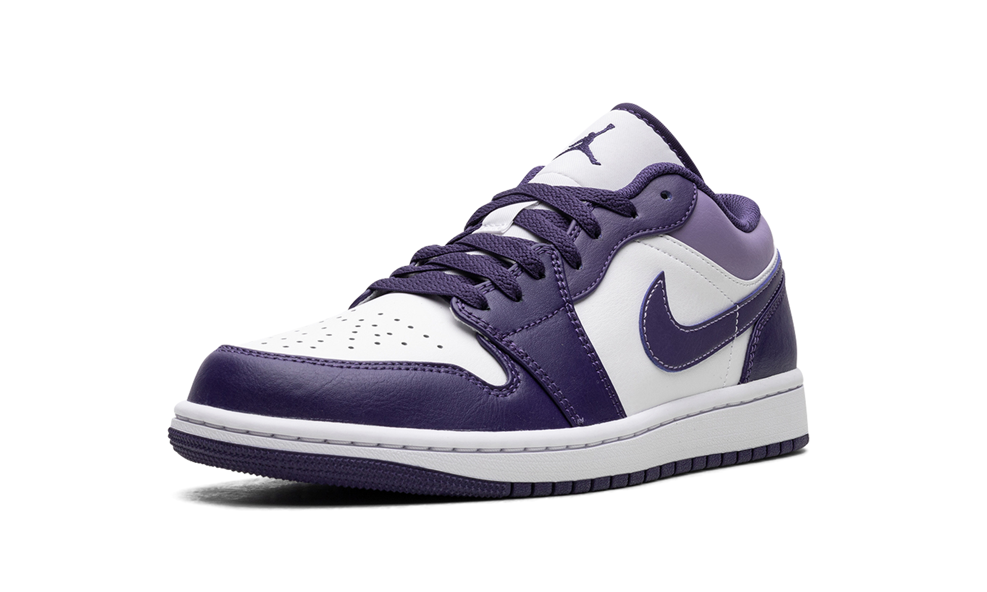 The Air Jordan 1 Low "Sky J Purple" is a colorway of the low-top retro basketball shoe with purple detailing. The colorway has a white leather construction with what Jordan Brand calls Sky J Purple leather overlays and Swoosh branding. A lighter shade of purple appears on the collar. A classic “Wingsâ€?logo is embroidered on the heel while a purple Jumpman is found on the tongue. The shoe's two-tone white-and-purple look continues underfoot with a white rubber midsole and purple rubber outsole. Release date: July 20. 2023