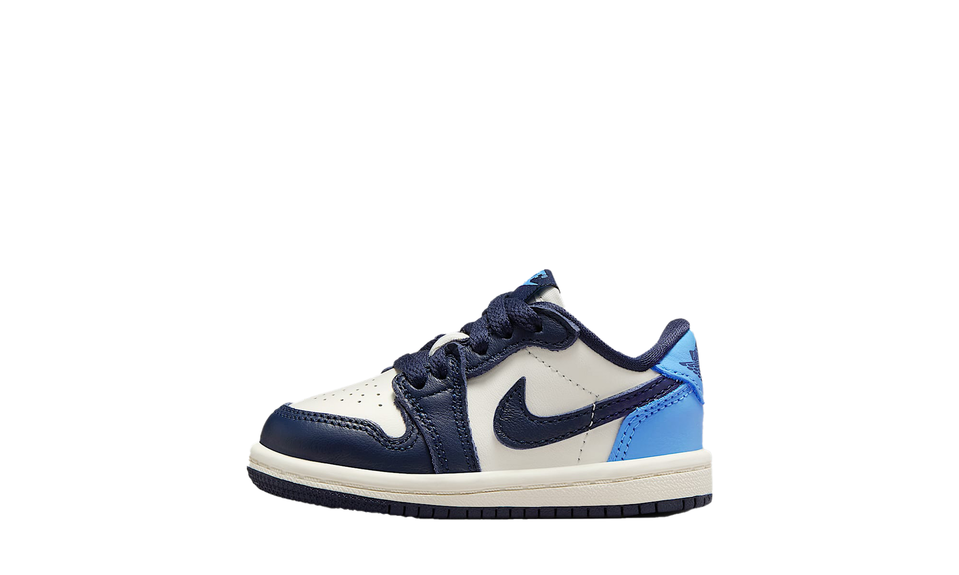 The Air Jordan 1 Low TD "Obisidian" is the toddler version of the 2025 lowtop. The little kids' AJ1 Low OG "Obisidian" has a leather upper that combines shades of navy and light blue with off-white. The lowtop Jordan 1 has a Wings logo on the heel and a navy Swoosh.