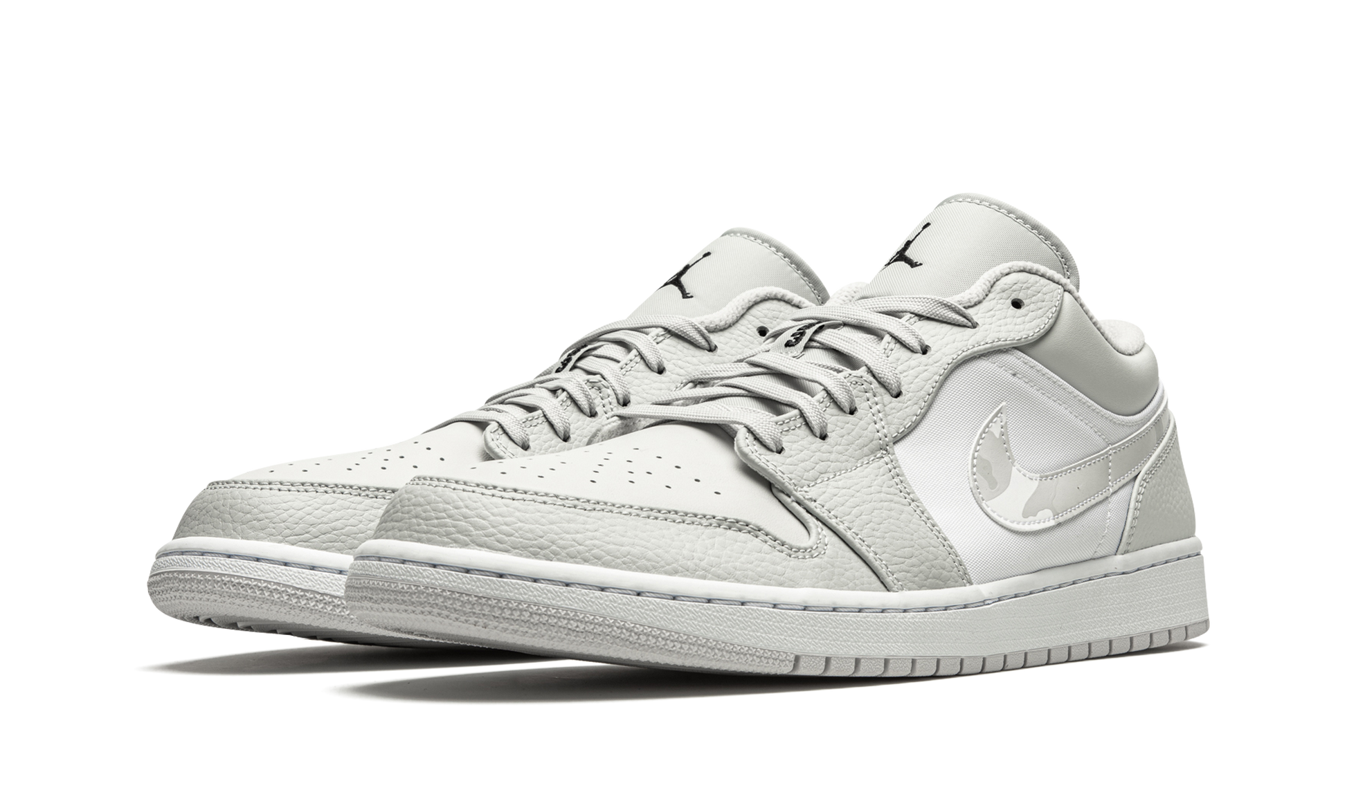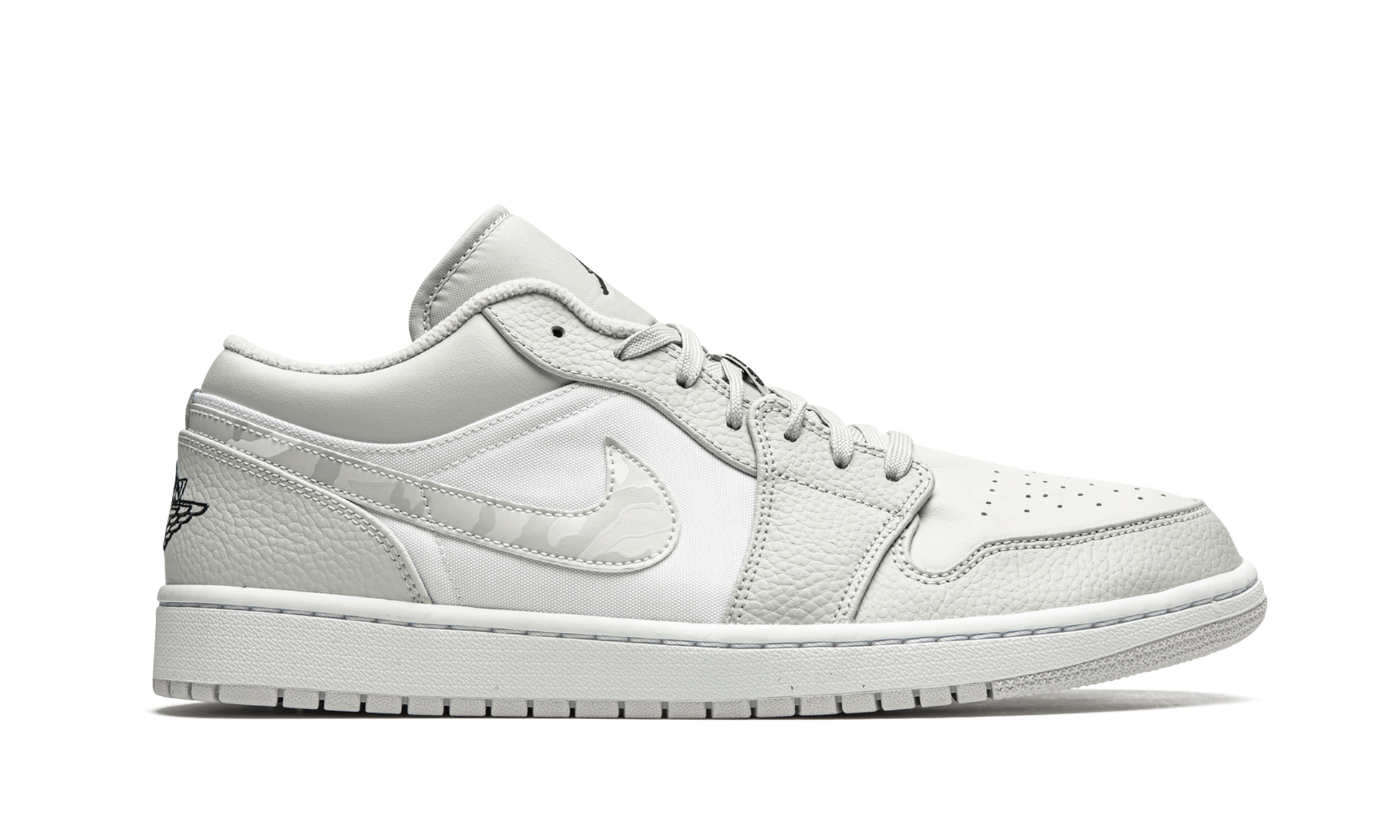 The Air Jordan 1 Low “White Camoâ€?is a versatile and desirable low-top version of Michael Jordan's signature shoe with a subtle camouflage pattern. This refined look for the Jordan 1 Low features light grey tumbled leather overlays on the forefoot and eyelets. Contrasting white perforated leather appears on the toe and a smooth variant of the material covers the mid-panel. Branding. like the “White Camoâ€?leather Swoosh located on either side. as well as the mini black Jumpman embroidery the tongue and “Wingsâ€?emblem on the heel. add classic styling to the Air Jordan 1.