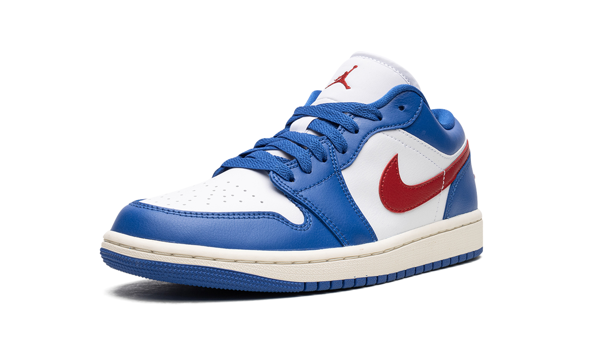 The Women's Air Jordan 1 Low “Sport Blueâ€?is a women's-exclusive colorway of the retro basketball shoe with a patriotic look. The “Sport Blueâ€?features a red. white. and blue color scheme that is not only patriotic but also a subtle nod to the color combination found on the Air Jordan 3's original “True Blueâ€?colorway. Here. the shoe has a white leather base with Sport Blue leather overlays. A Gym Red leather Swoosh is found on the sides and a red “Wingsâ€?logo is embroidered on the heel. A red Jumpman is embroidered on the white nylon tongue. Underfoot. an off-white-colored rubber midsole and blue rubber outsole complete the look.