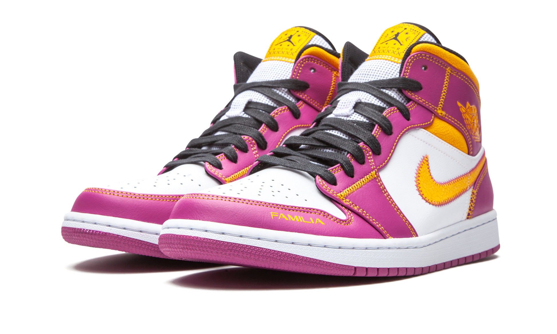 The Air Jordan 1 Mid “Dia de los Muertosâ€?is a special colorway of Michael Jordan's first signature shoe dedicated to the traditional Mexican holiday. Part of Nike's Fall 2020 “Dia de los Muertosâ€?collection. the mid-top version of the retro basketball and lifestyle shoe features a family-inspired design consisting of colors found in traditional floral ofrendas (also known as altars) that are displayed during the holiday to commemorate the lives of those who have transitioned. White leather appears on the perforated toe and the mid-panel. Jordan Brand contrasts the neutral base with fuchsia leather detailing on the forefoot. eyelets. collar. and mid-panel. The cracked yellow Swoosh and collar provide a personalized touch. The “Dia de los Muertosâ€?features a heritage inspired gold nylon tongue tag and “Familiaâ€?embroidery on the forefoot. Release date: October 15. 2020.