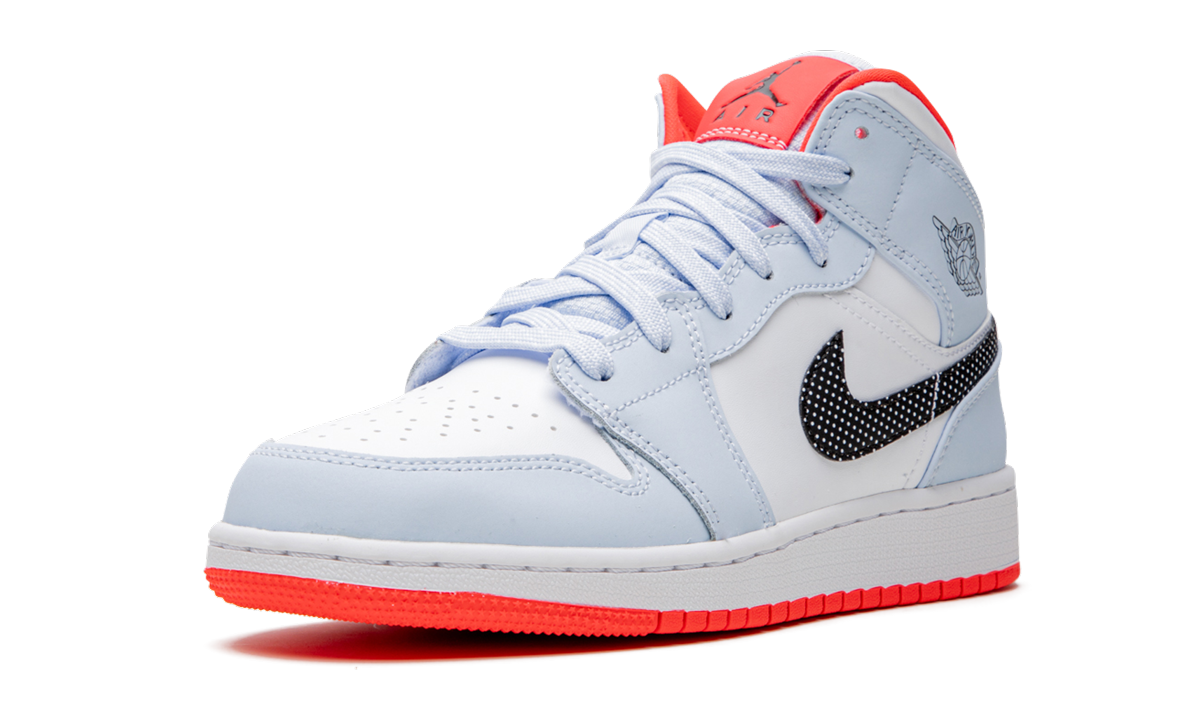 The Air Jordan 1 Mid GS “Half Blueâ€?is the youth sizing of the polka dot-adorned mid-top lifestyle shoe. Jordan Brand looks out for all the young aspiring sneaker fans by lacing Michael Jordan's first signature design with a stark white leather base that covers the mid-panel. perforated toe and collar. Light blue leather overlays can be found on the forefoot. eyelets and collar. A contrasting red liner. black outlined Wings logo on the collar and polka dot leather Swoosh on the mid-panel add fun. unique styling to the children's shoe. The look is finished off with a white midsole and attention-grabbing red outsole.